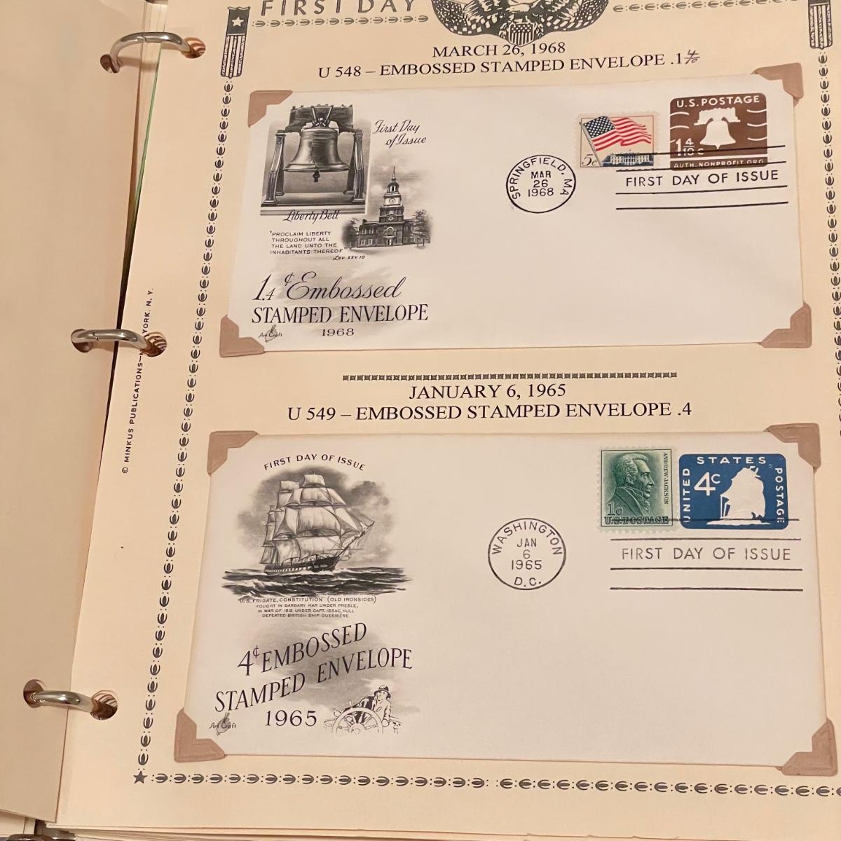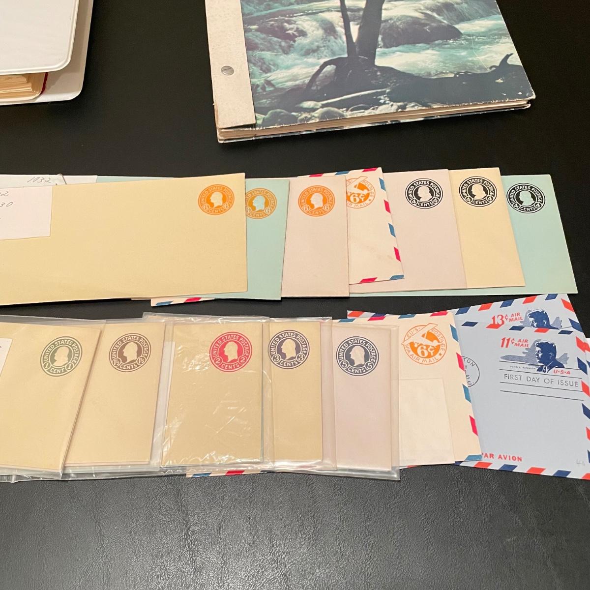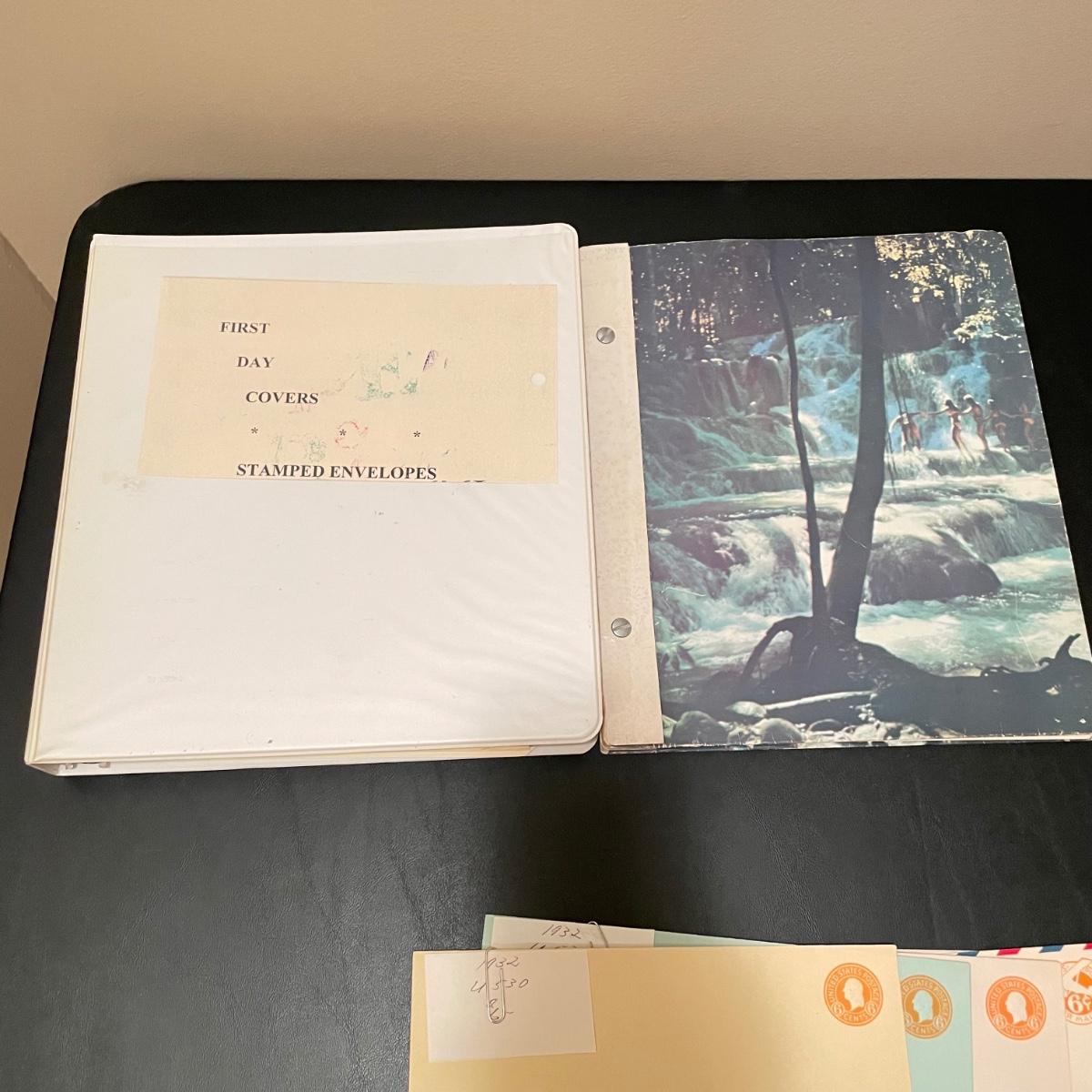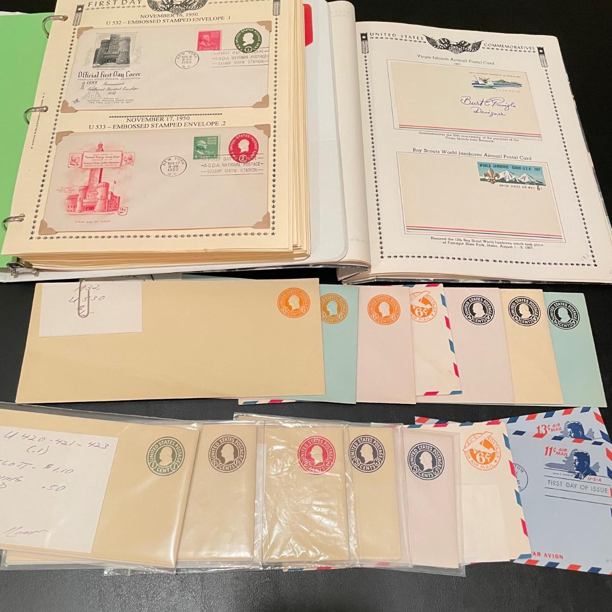 A 1.5” white binder and second booklet with mostly stamped envelopes. Many are embossed and there are a few stamps included too. Lot also includes a small stack of embossed envelopes outside of the binder and booklet. Many envelopes in the white binder are canceled 1st day issues. One noted Virgin Islands envelope appears to be signed by the designer, although it is not confirmed. See photos for examples of inventory. All sales are final. No returns or refunds. Please bid accordingly. Shipping available.
