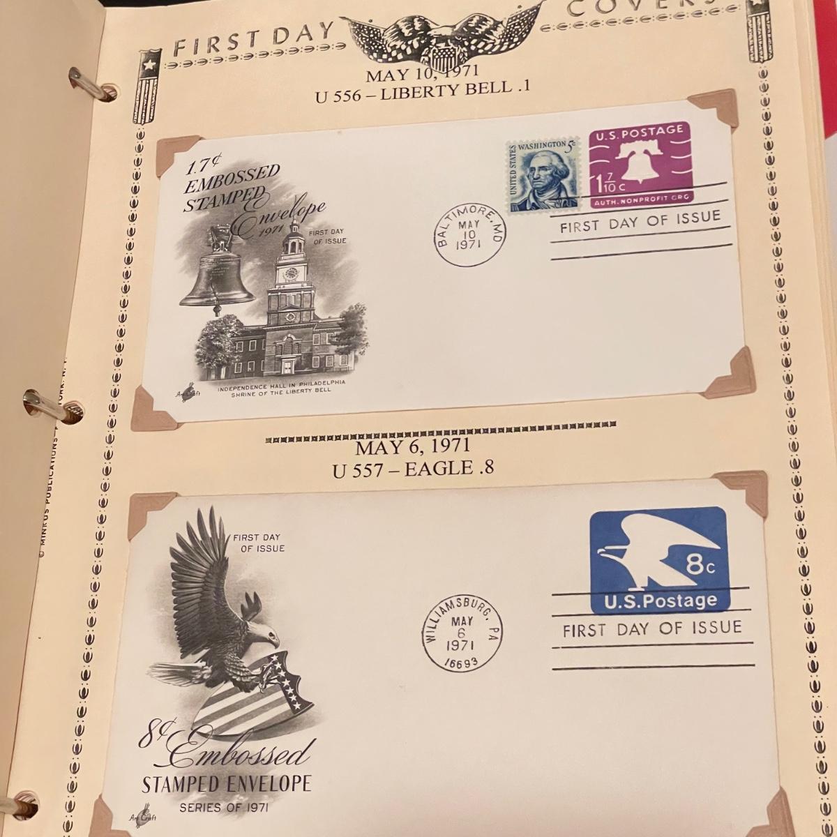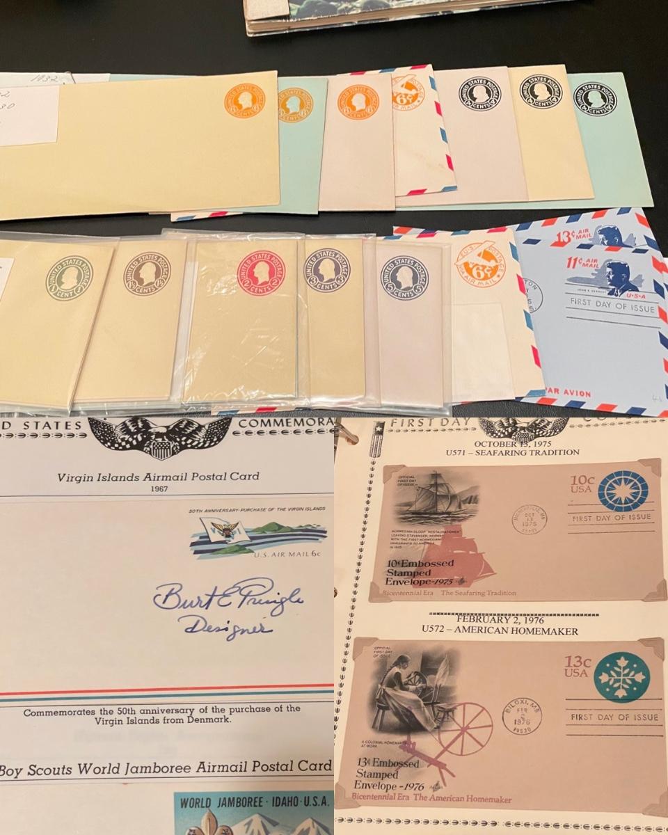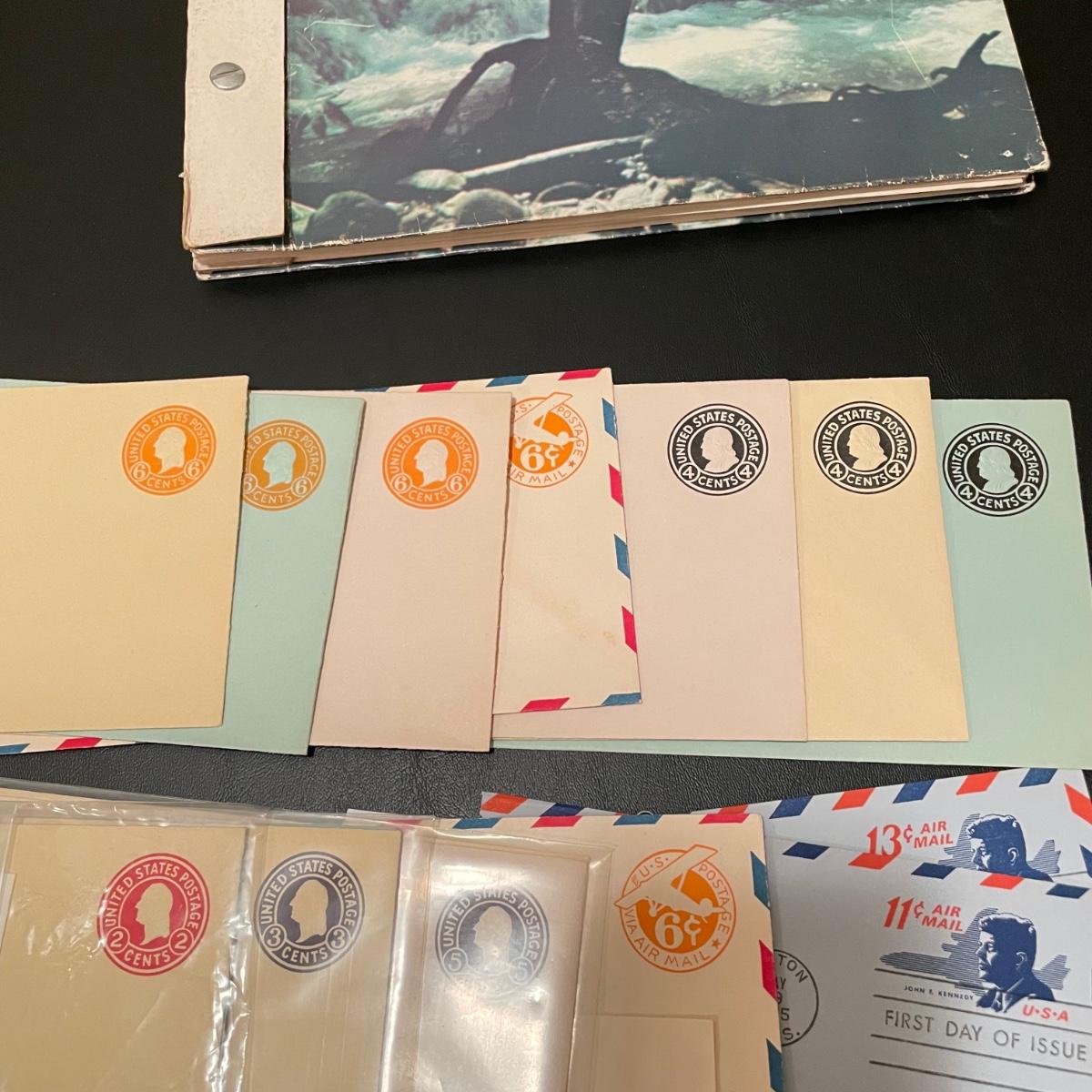 A 1.5” white binder and second booklet with mostly stamped envelopes. Many are embossed and there are a few stamps included too. Lot also includes a small stack of embossed envelopes outside of the binder and booklet. Many envelopes in the white binder are canceled 1st day issues. One noted Virgin Islands envelope appears to be signed by the designer, although it is not confirmed. See photos for examples of inventory. All sales are final. No returns or refunds. Please bid accordingly. Shipping available.