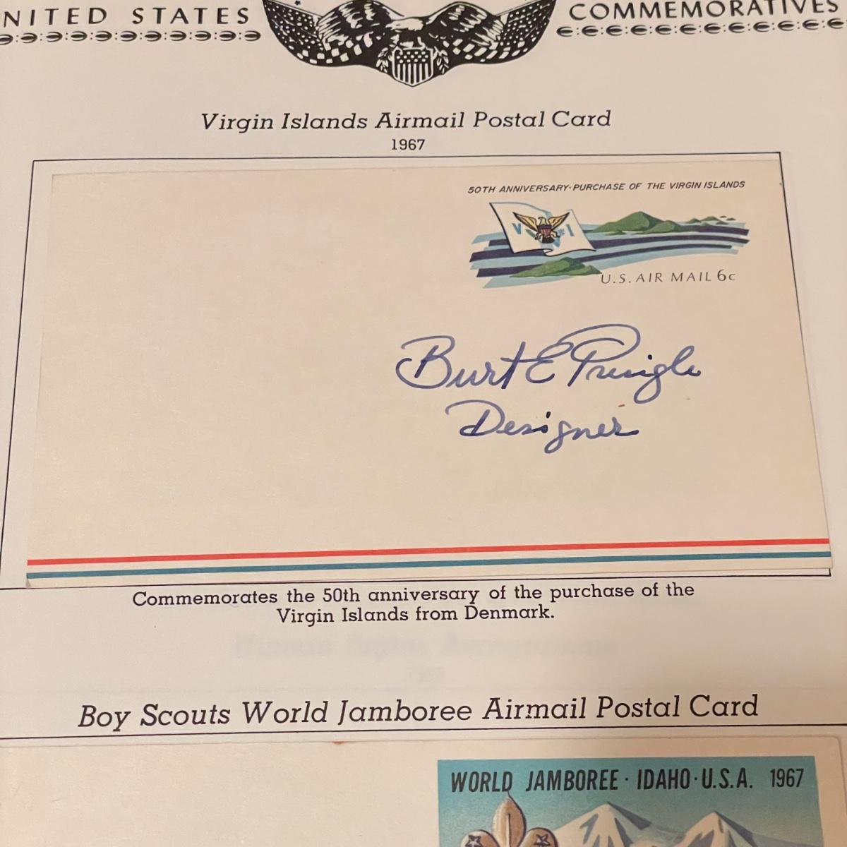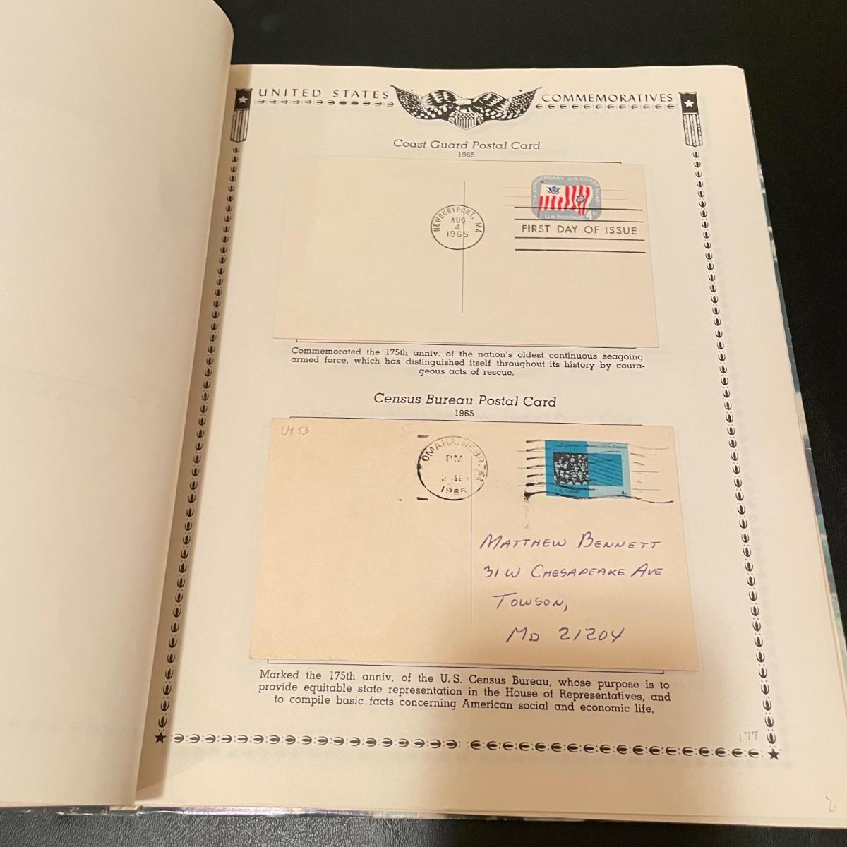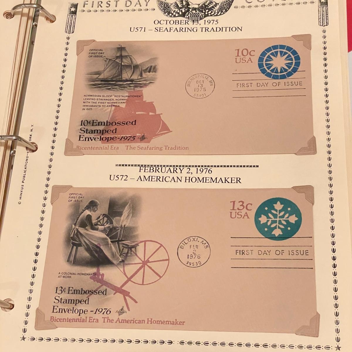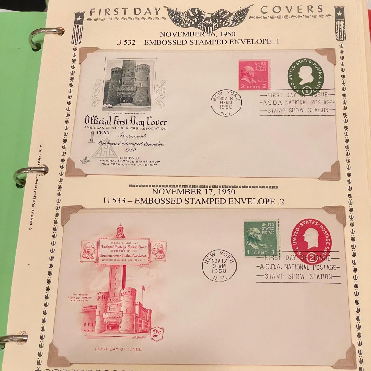 A 1.5” white binder and second booklet with mostly stamped envelopes. Many are embossed and there are a few stamps included too. Lot also includes a small stack of embossed envelopes outside of the binder and booklet. Many envelopes in the white binder are canceled 1st day issues. One noted Virgin Islands envelope appears to be signed by the designer, although it is not confirmed. See photos for examples of inventory. All sales are final. No returns or refunds. Please bid accordingly. Shipping available.