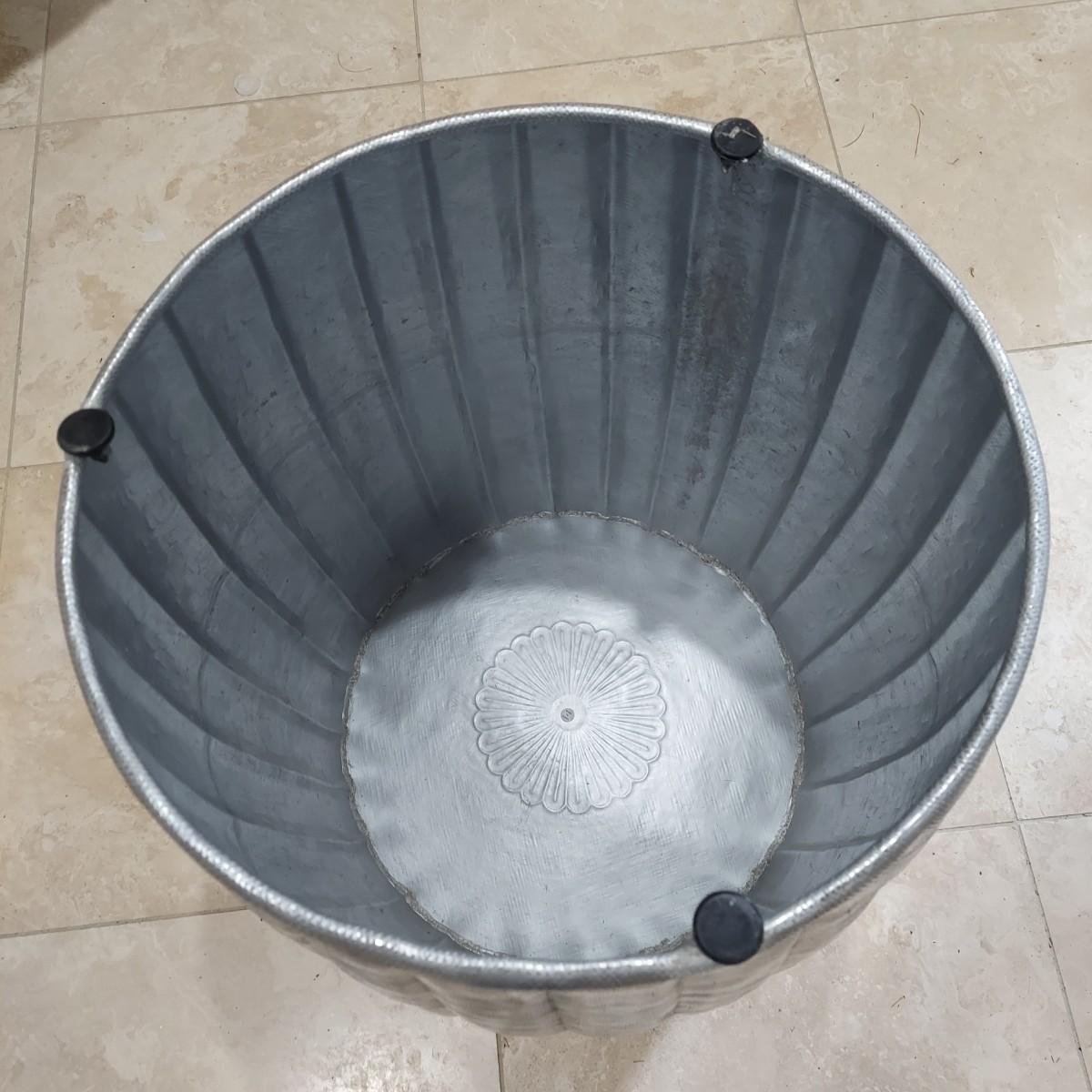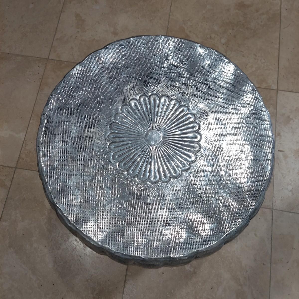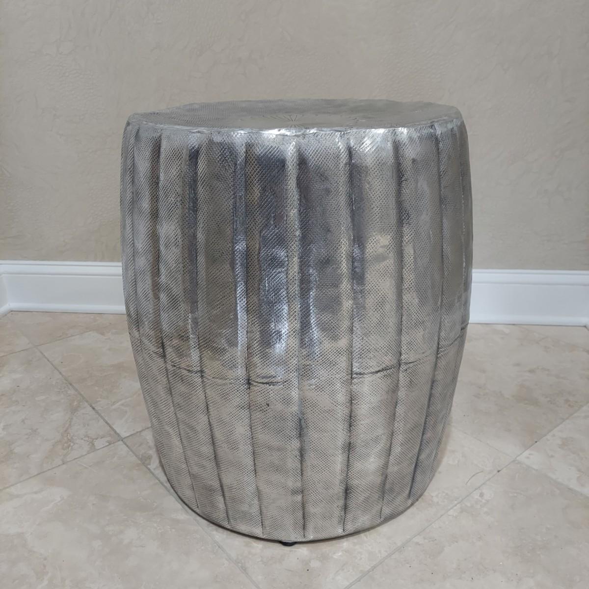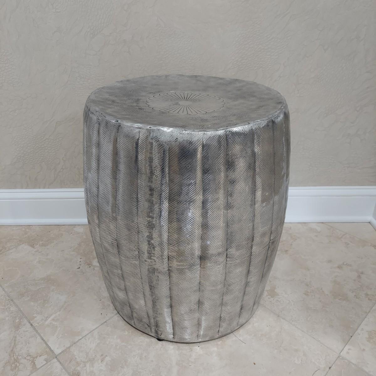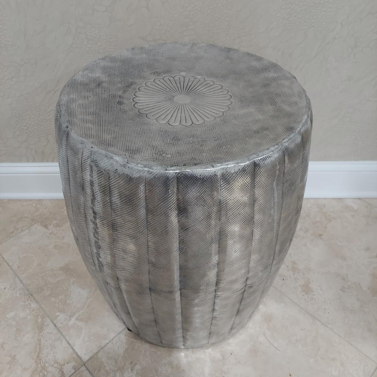 This item can be used as a side table, a plant stand or stool. It's a lightweight metal. Appears to be pressed tin. The piece is hollow with rubber feet. It measures approximately 18" in diameter and 21" tall. Shipping available.