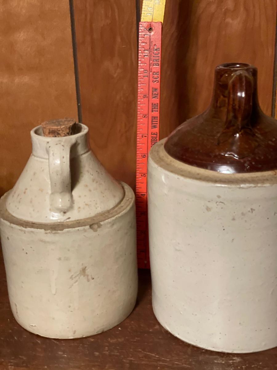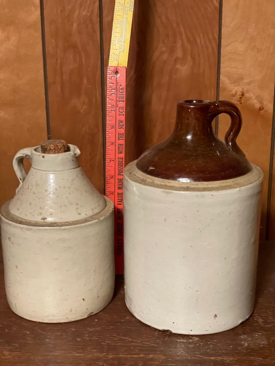 Stamped Minnesota jug with cork and unmarked jug with brown top