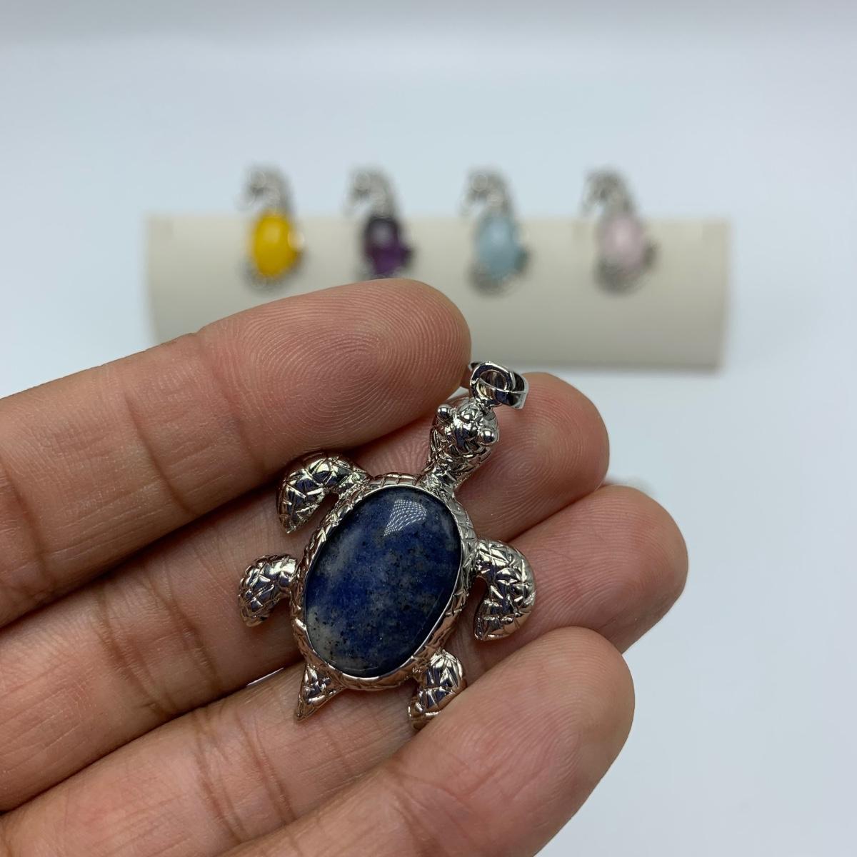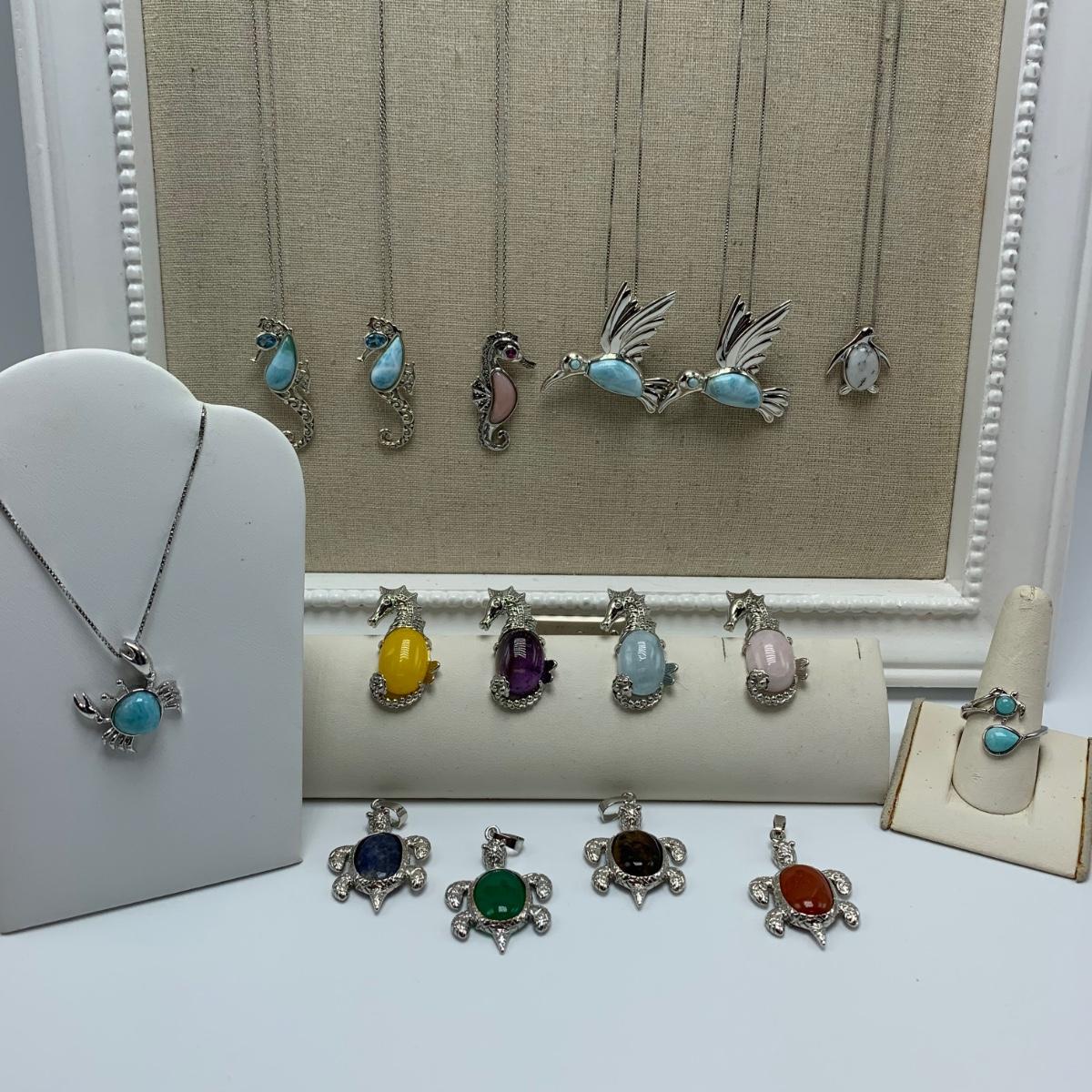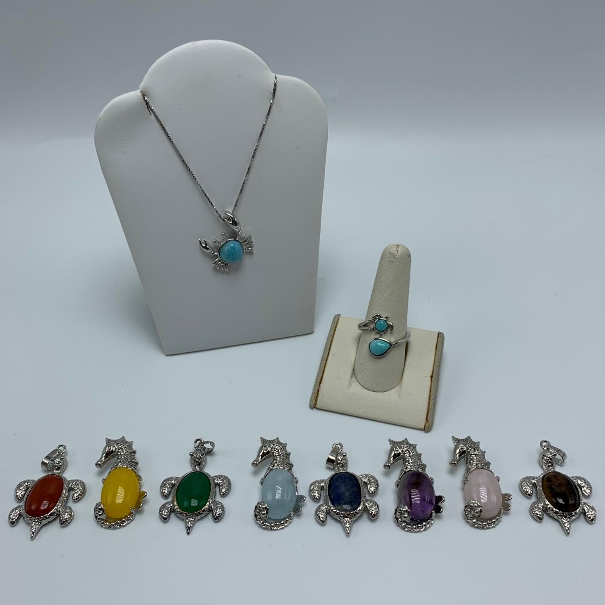 Lovely collection of necklaces and pendants. Lot includes two blue gemstone seahorse necklaces, one pink gemstone seahorse necklace, two blue gemstone hummingbird necklaces with adjustable chain, one adjustable turquoise colored seahorse ring (shown in photos as size 9), and one penguin necklace. Of the necklaces above, both pendants and chains are stamped 925. Lot also includes selection of pendants featuring four gemstone turtles and four gemstone seahorses. These pendants are not stamped. Seahorses necklace chains measure, 18” and hummingbird chain measures 19.5” and is adjustable. All sales are final. No returns or refunds. Please bid accordingly.