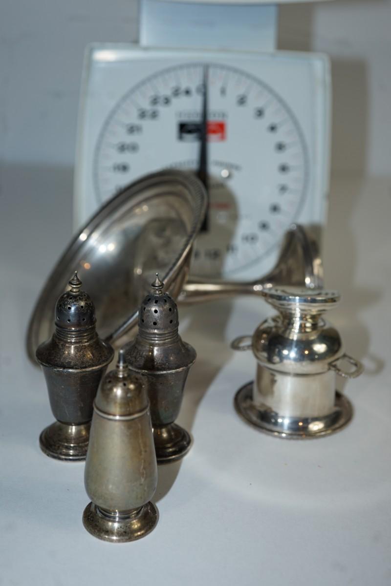 STAMPED STERLING WEIGHTED COMPOTE, SALT & PEPPER SHAKERS & TOOTHPICK HOLDER