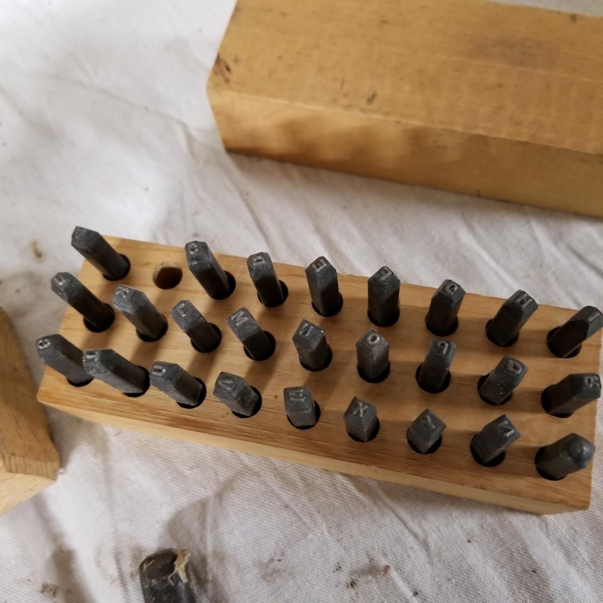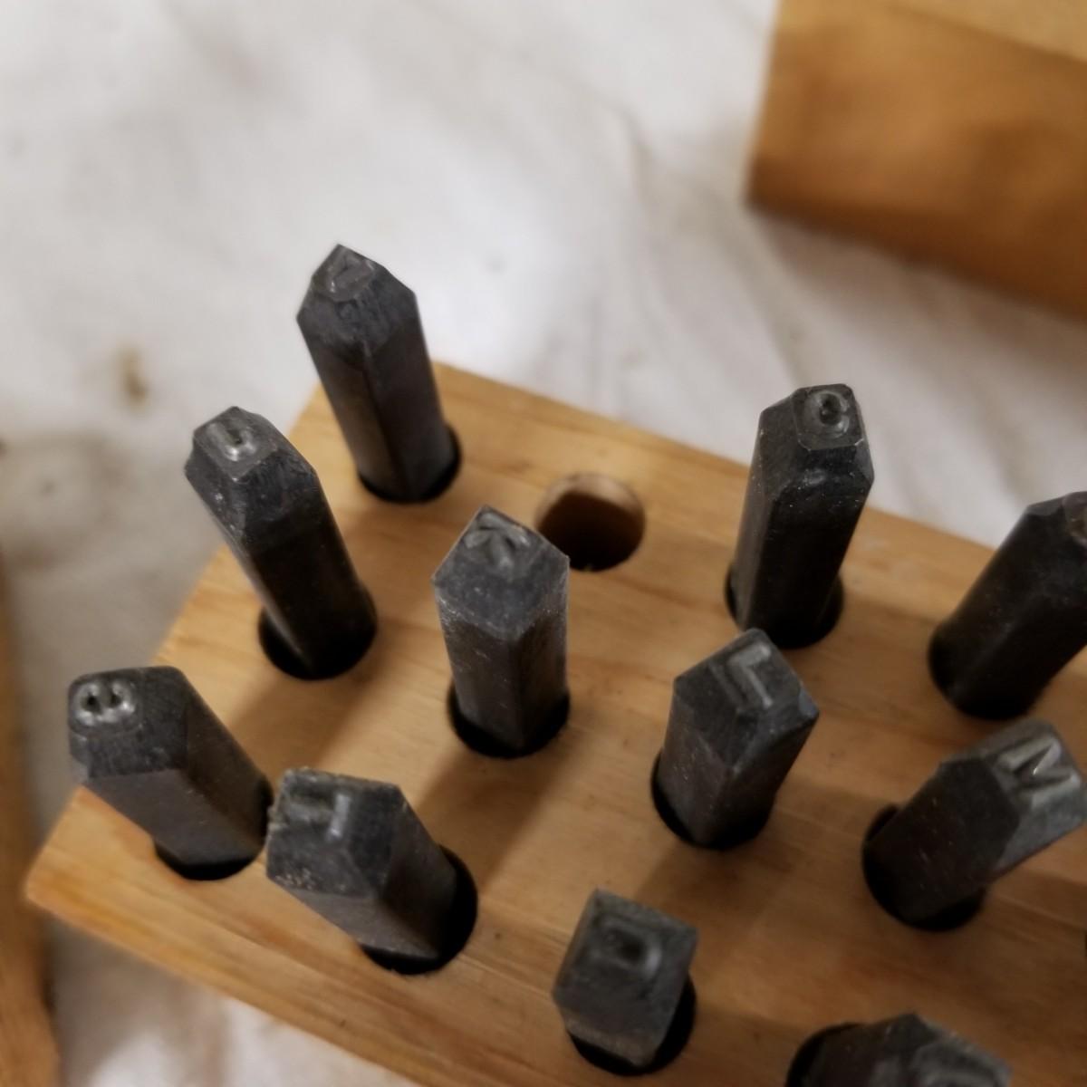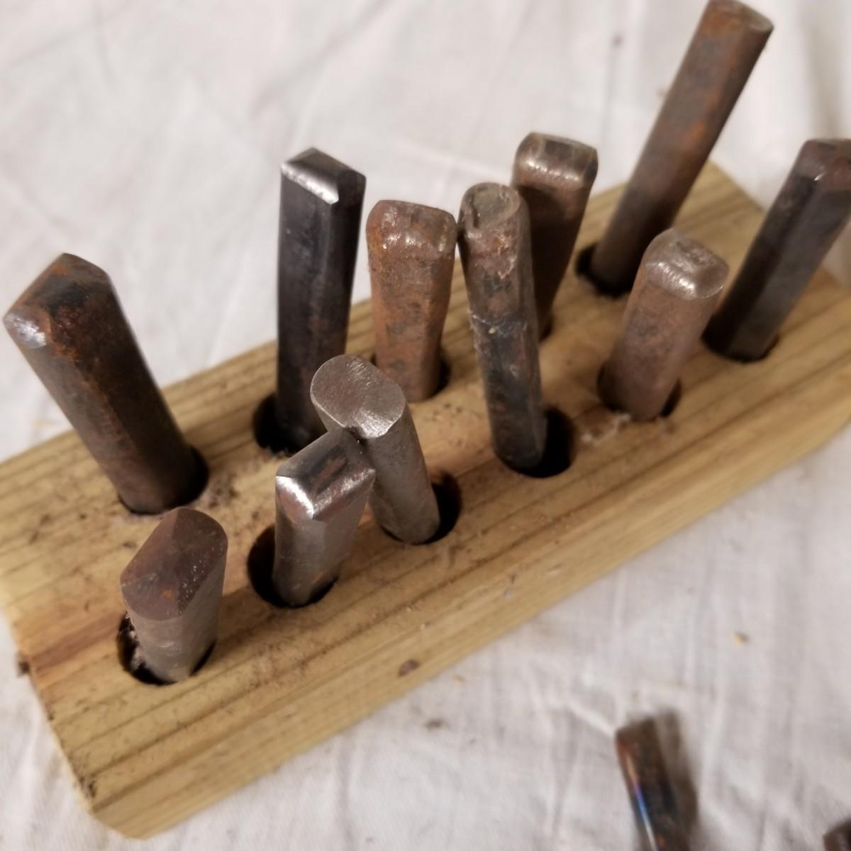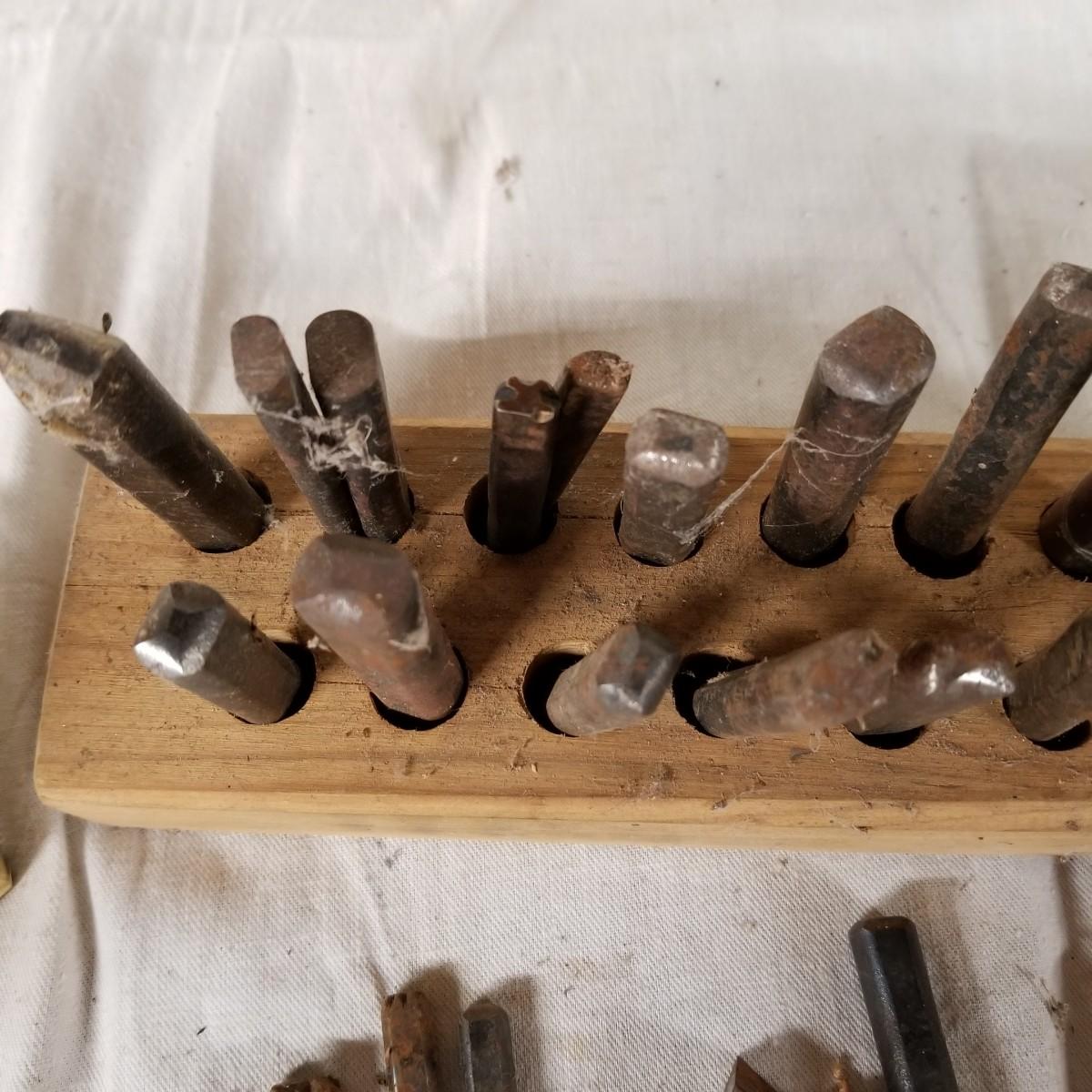 A mixture of steel stamping tools, useful for forming or leather crafting.  Various shapes and sizes. Handmade wood block holders.  Most are 3"-4" long.  One set of alphabet letters, missing the 'B'.  Used condition.   Shipping available.