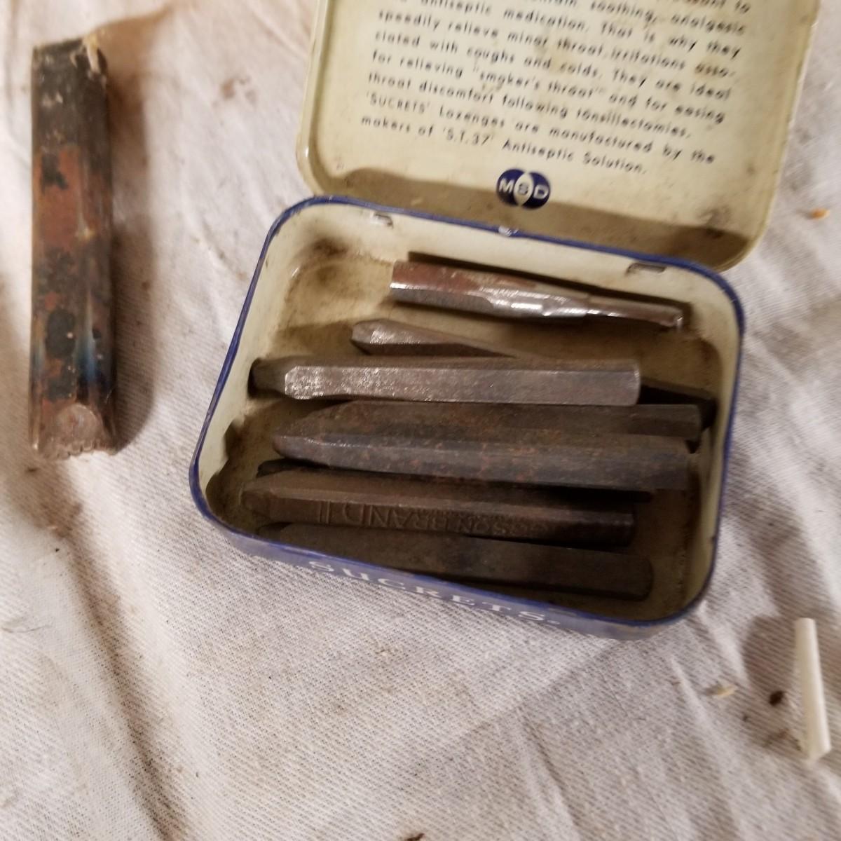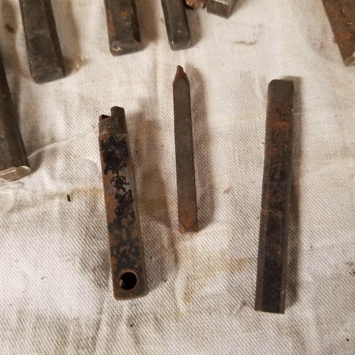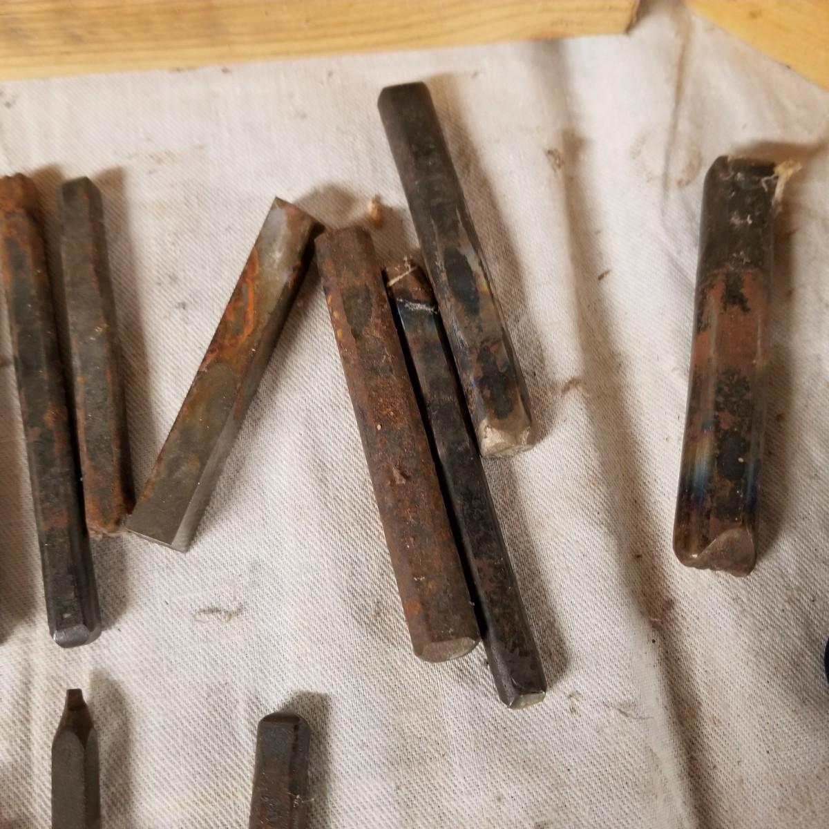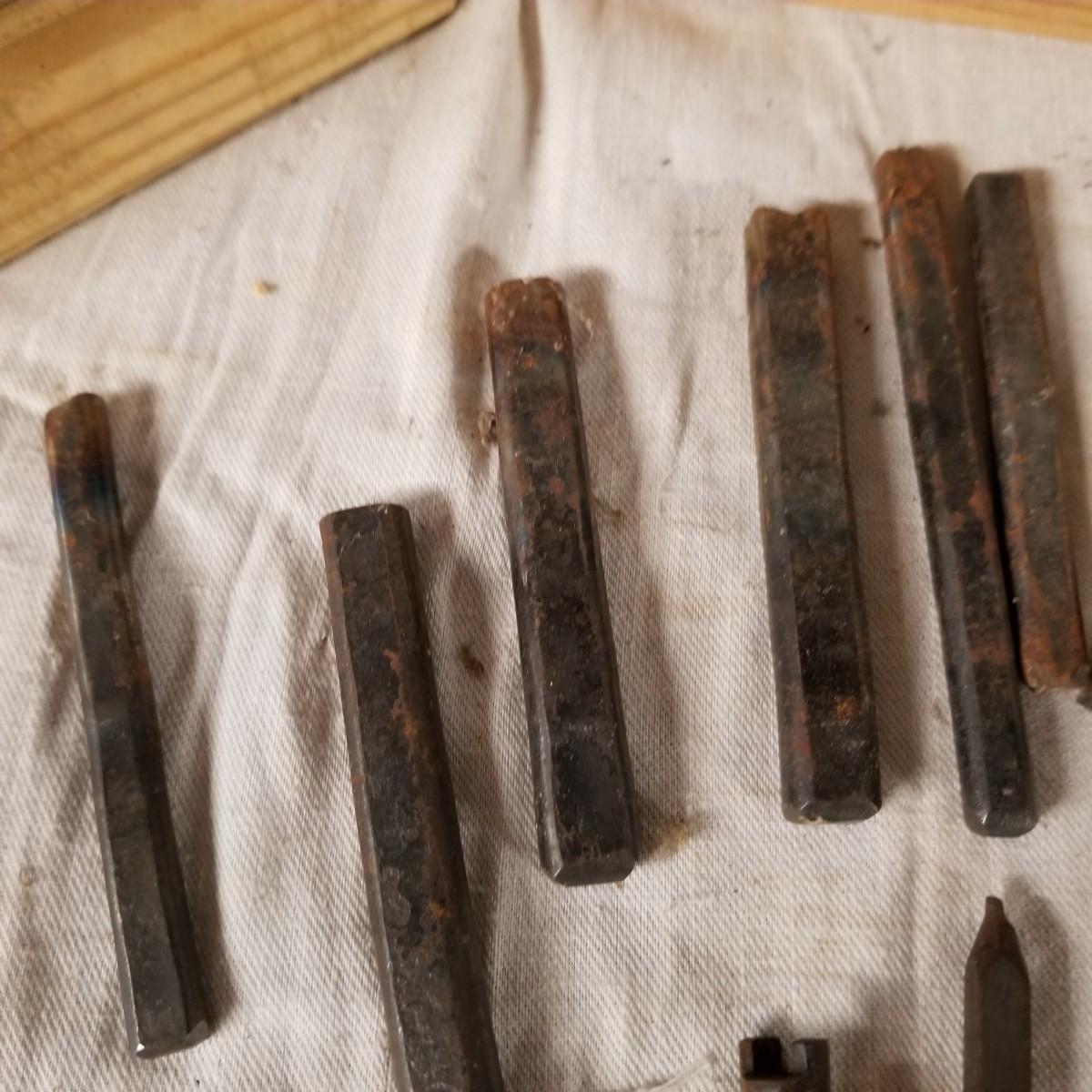 A mixture of steel stamping tools, useful for forming or leather crafting.  Various shapes and sizes. Handmade wood block holders.  Most are 3"-4" long.  One set of alphabet letters, missing the 'B'.  Used condition.   Shipping available.