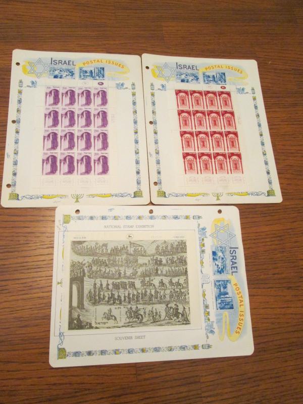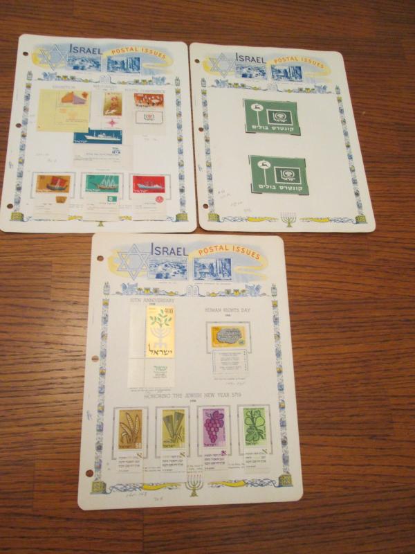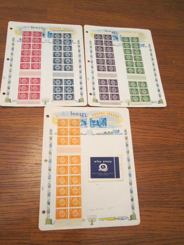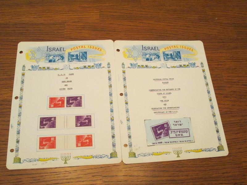 In this set you will receive stamps 1 - 6, 10 -22, 24- 54, 56 - 61. 63 - 189, C 1- 20 J 1 - 20, Holiday Issues Sept 26 1948 in Tete Beche Pairs, State of Israel Rouletted No. 1-2-3, 10-14 Tabbed, First Coinage Definitive Issue Tete Beche Pairs 1949. First Definitive Coin Issue Booklets Issued 1949, U.P.U Issue in Tete Beche and Gutter Pairs, U.P.U. Booklet Commemorating the entrance of the Sate of Israel. Sheet of Maimonides, Sheet of the Holy Ark Jerusalem, Sheet of The theme of the Jewish New Year. Sheet of Albert Einstein, Souvenir Sheet, sheets of coins These stamps have been hinged by original owner