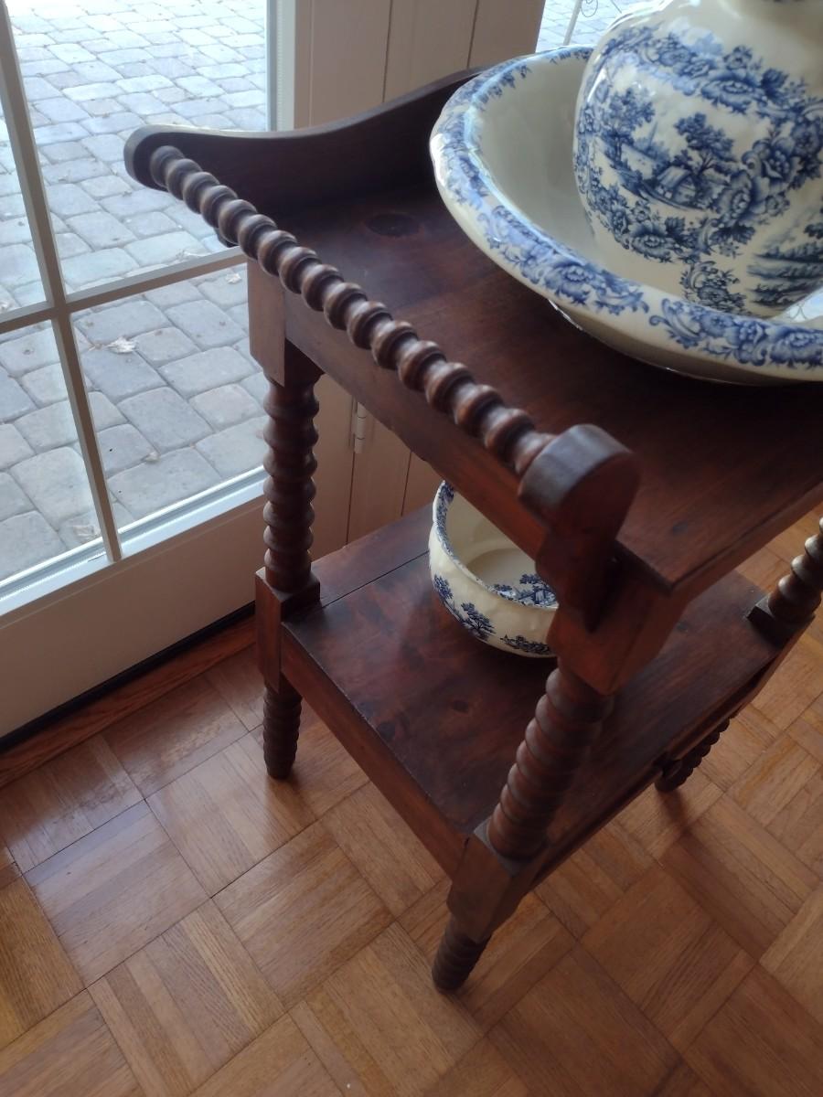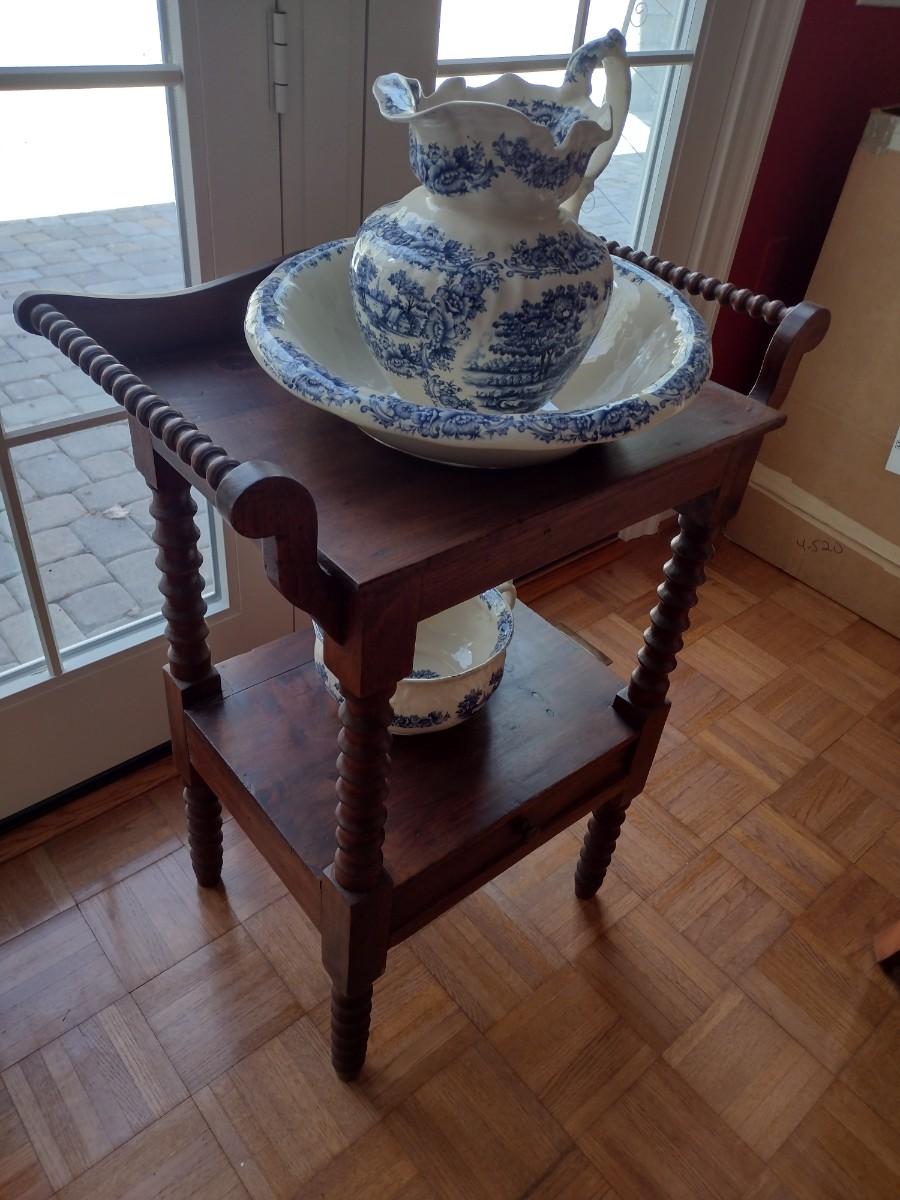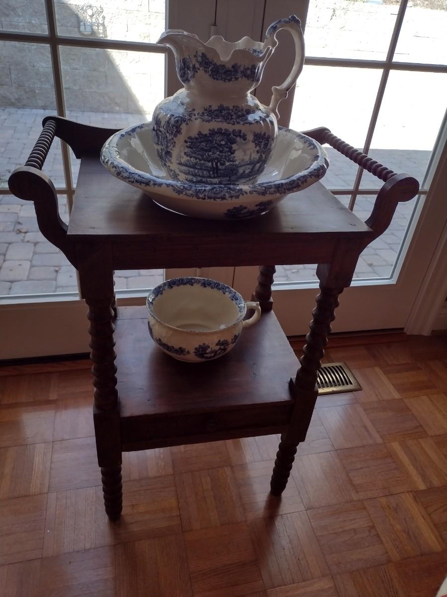 Antique Turned Wood Washstand with English Pottery Wash Basin, Pitcher, and Pot