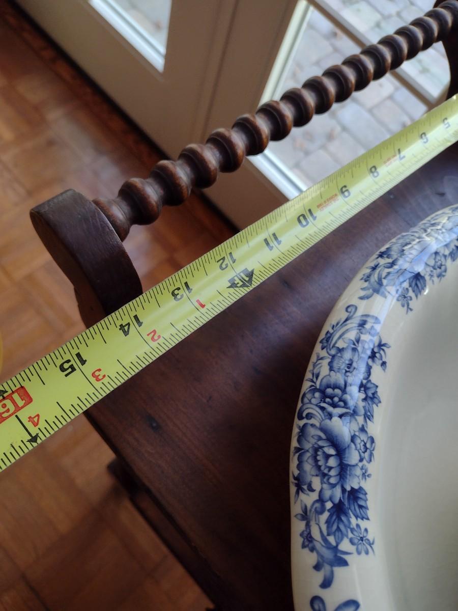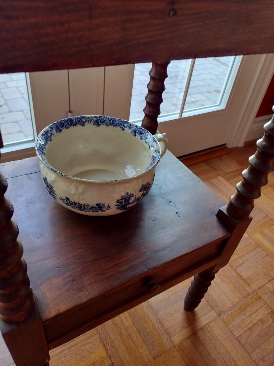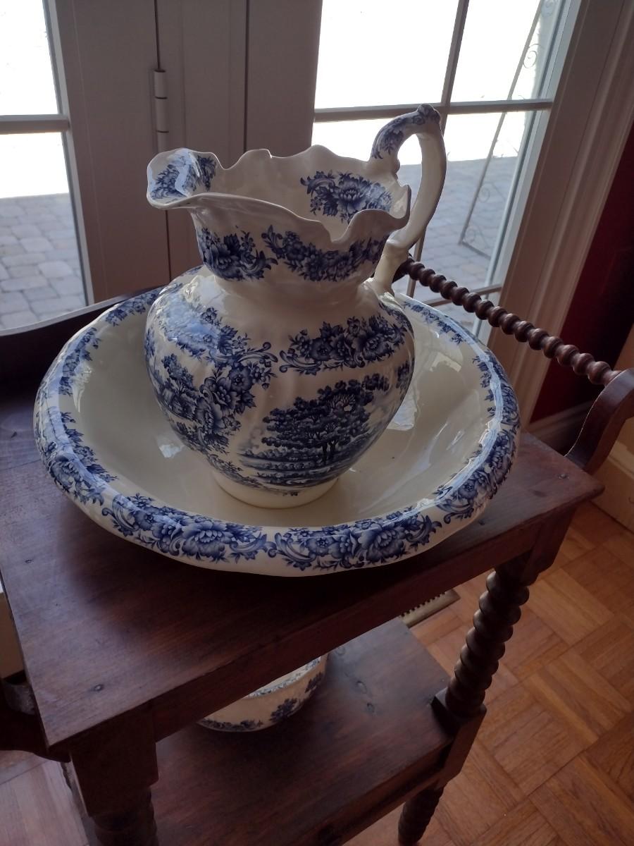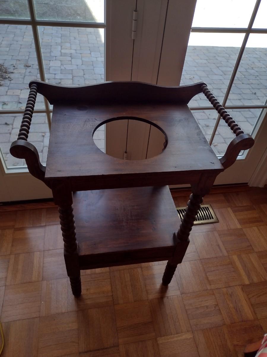 Antique Turned Wood Washstand with English Pottery Wash Basin, Pitcher, and Pot