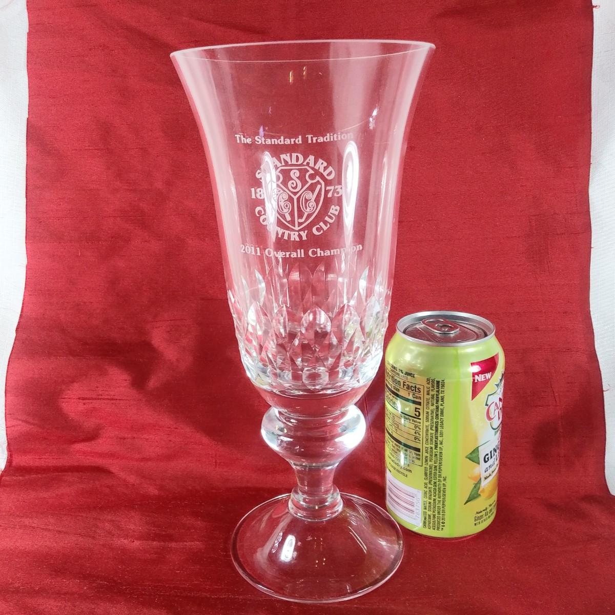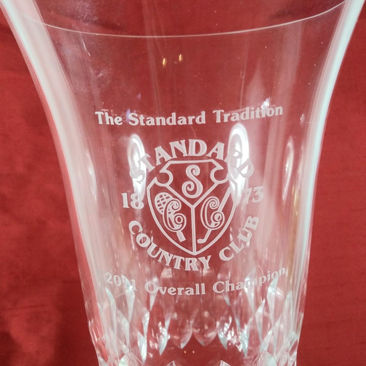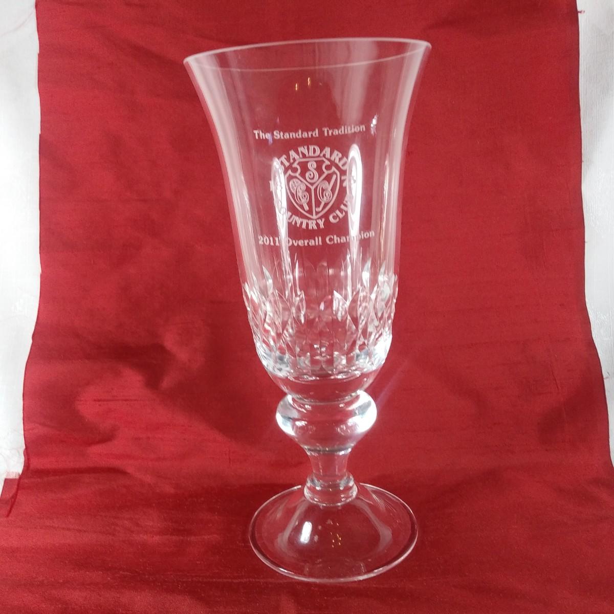 This auction lot is for a Standard Country Club Trophy Vase. This is a beautiful hand cut/etched crystal vase presented in 2011 by Standard Country Club. "Overall Champion" - measures about 10 1/2-inches tall. You may not have won it, but you can display it proudly as if you did. Plus it's a very nice vase and can be used for many projects.
