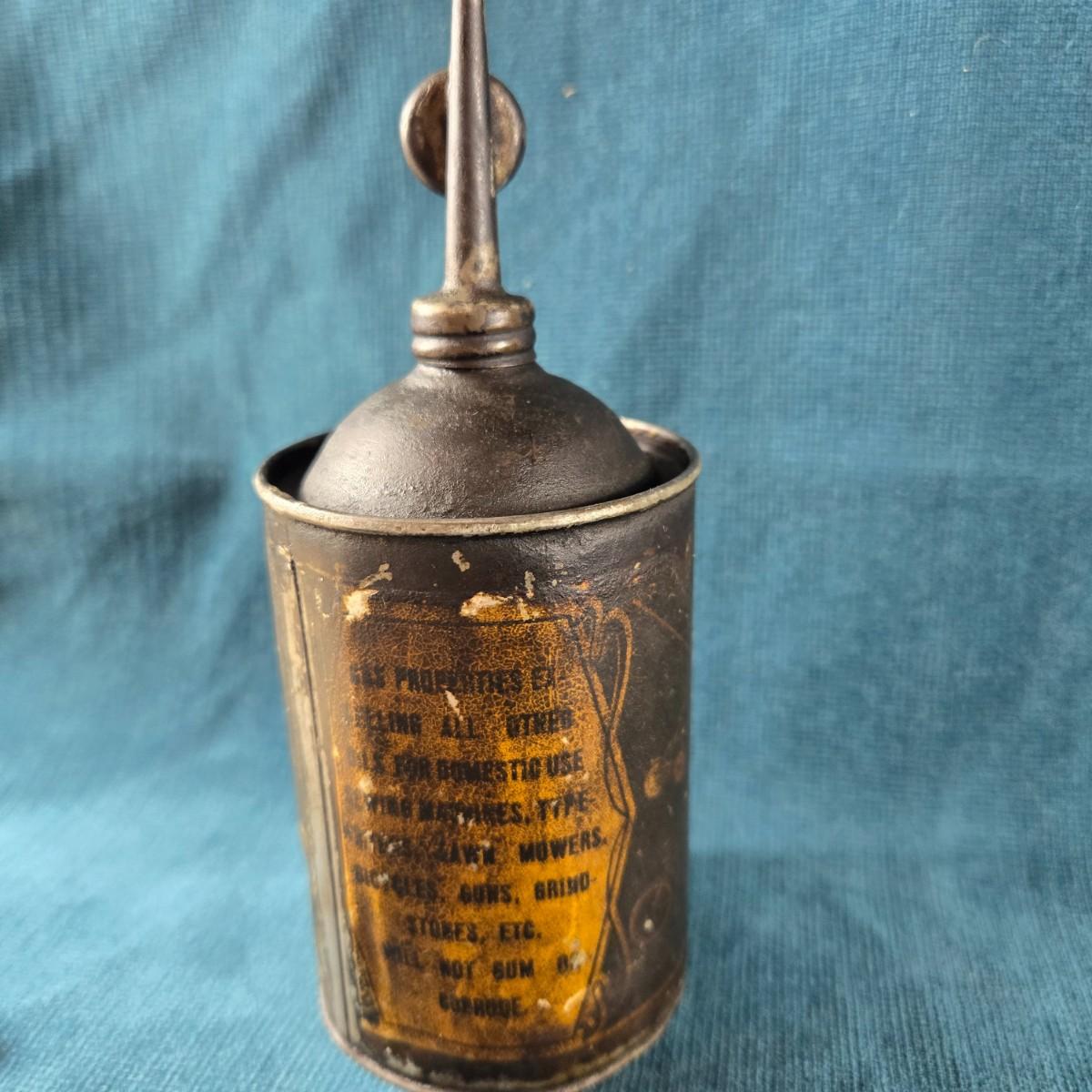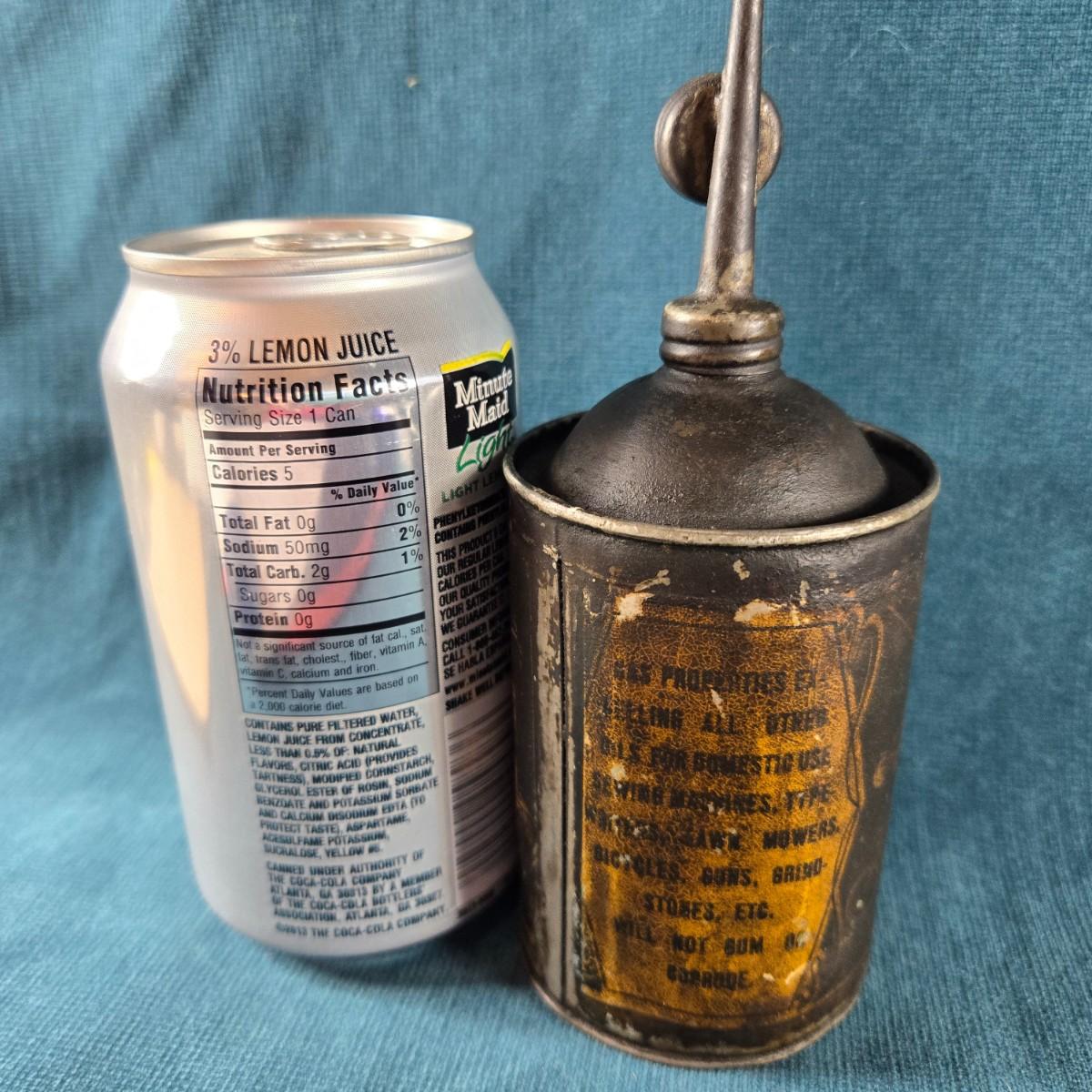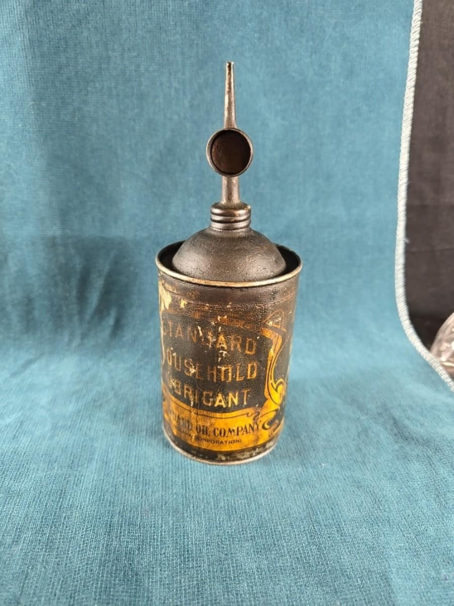 This auction lot is for a Standard Oil Household Lubricant Can. This can is about 2-1/2-inches diameter x 7-inches tall with spout. No contents. Fun, but smudged graphics, great for display in any vintage can collection.
