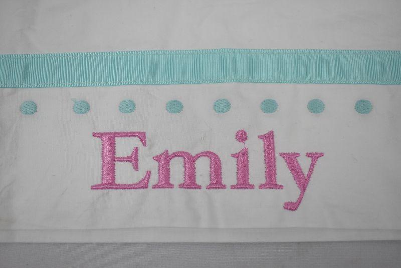 Standard Pillow Case White with Pink "Emily" Embroidery. Aqua Ribbon and Aqua Dots Embroidered
