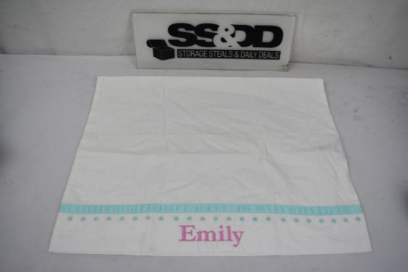 Standard Pillow Case White with Pink "Emily" Embroidery. Aqua