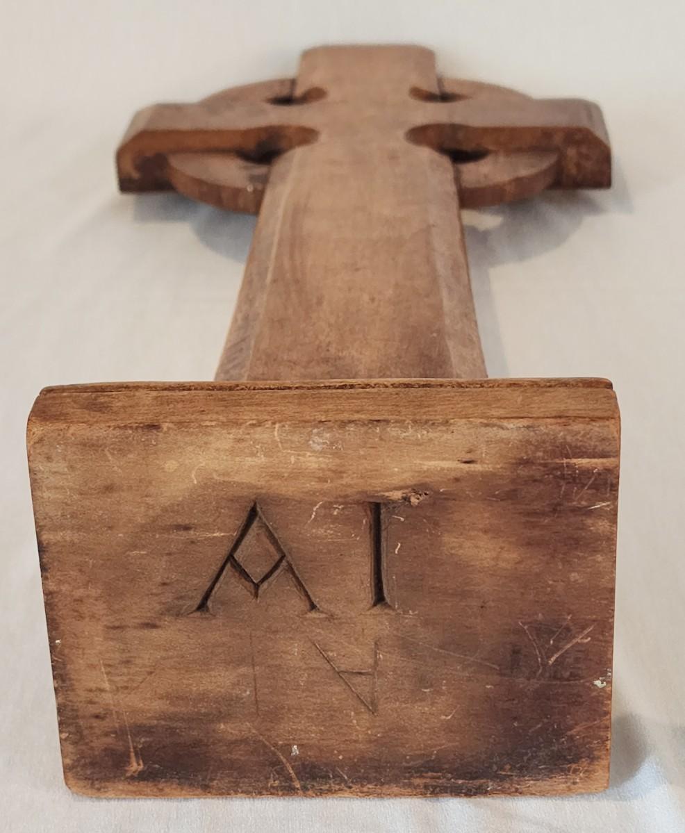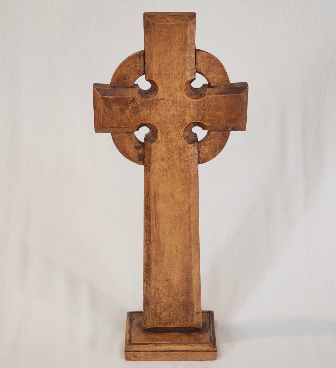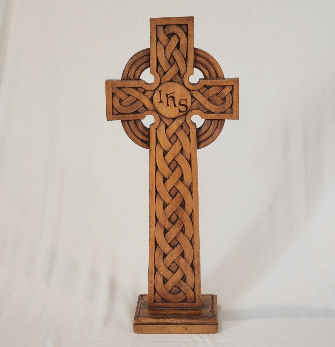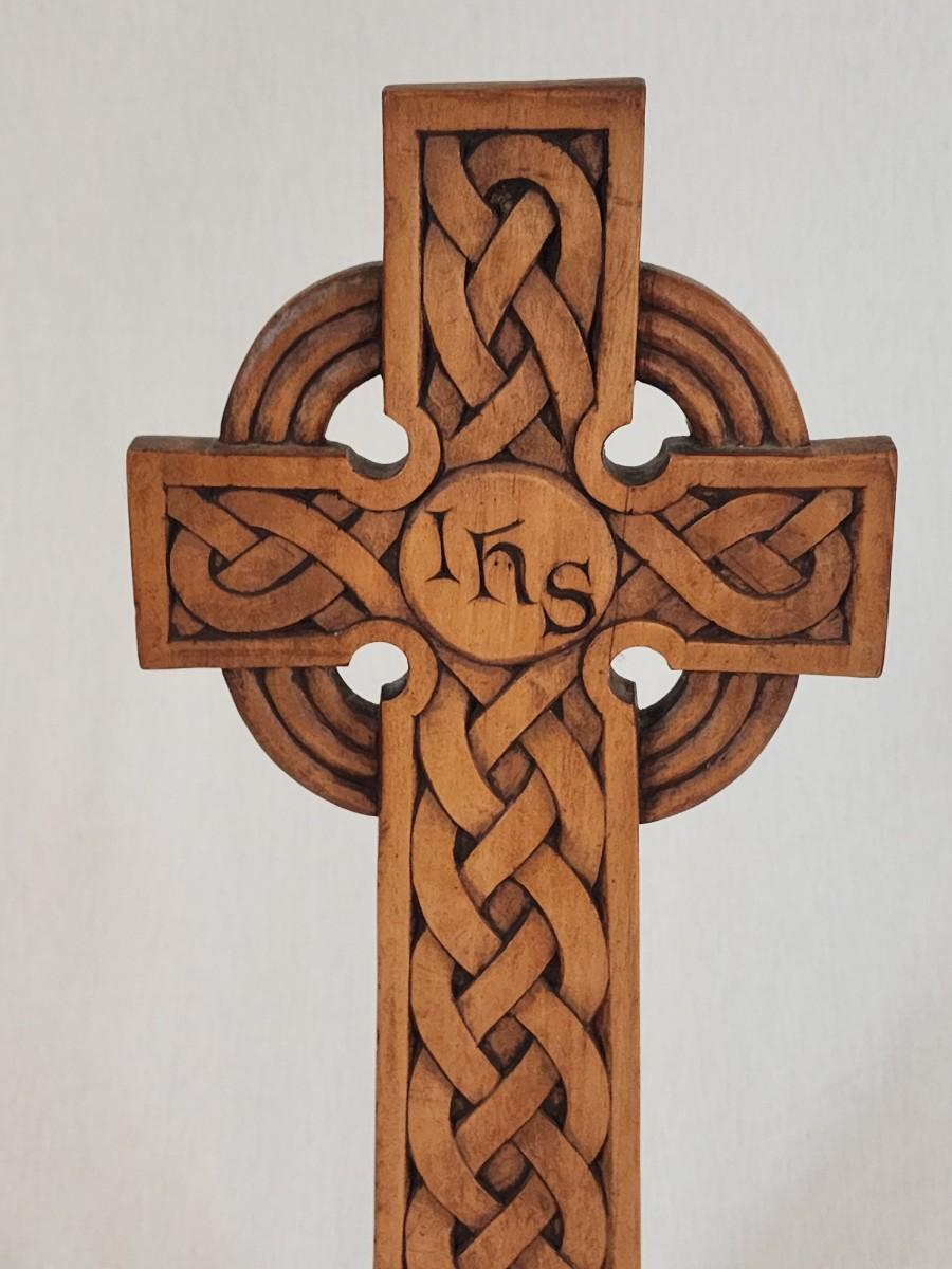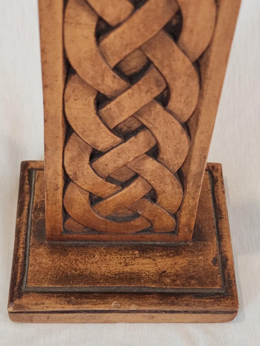 Beautiful wooden carved Celtic cross on wooden stand. 16.5" tall, 6.75" wide