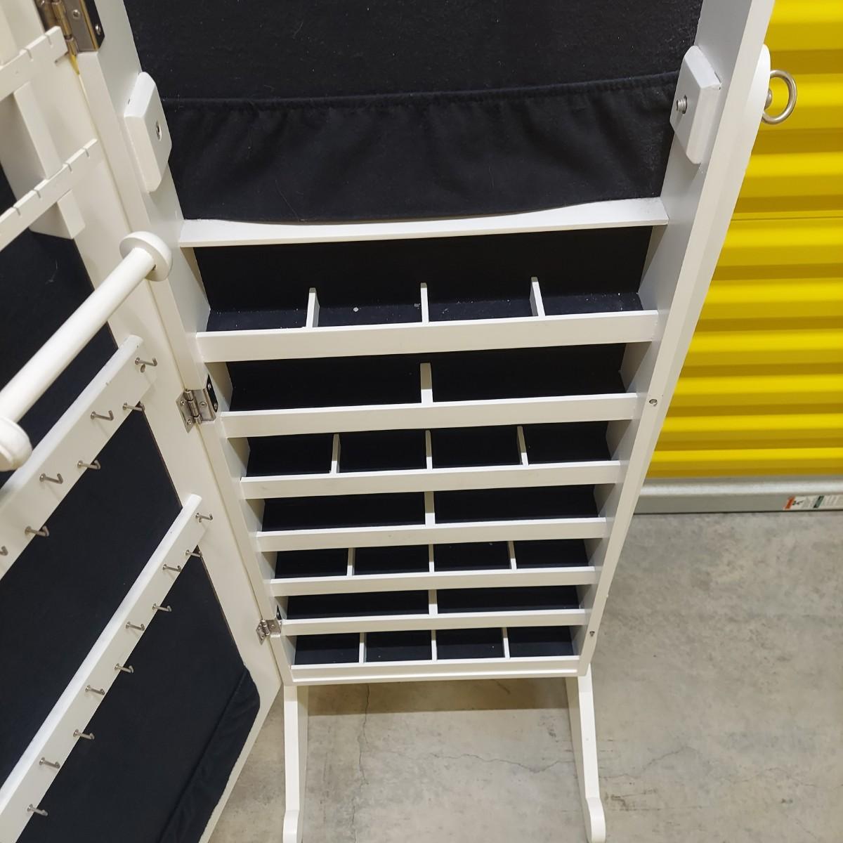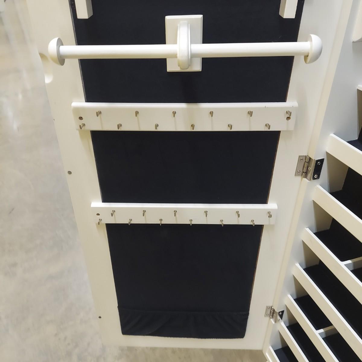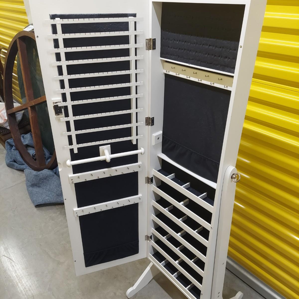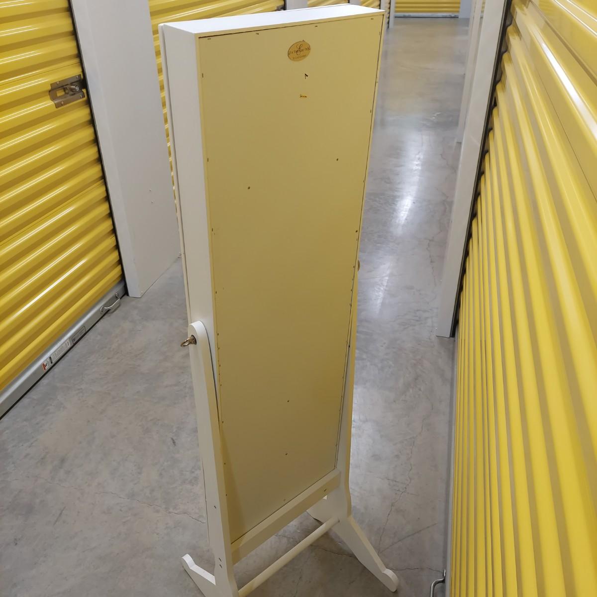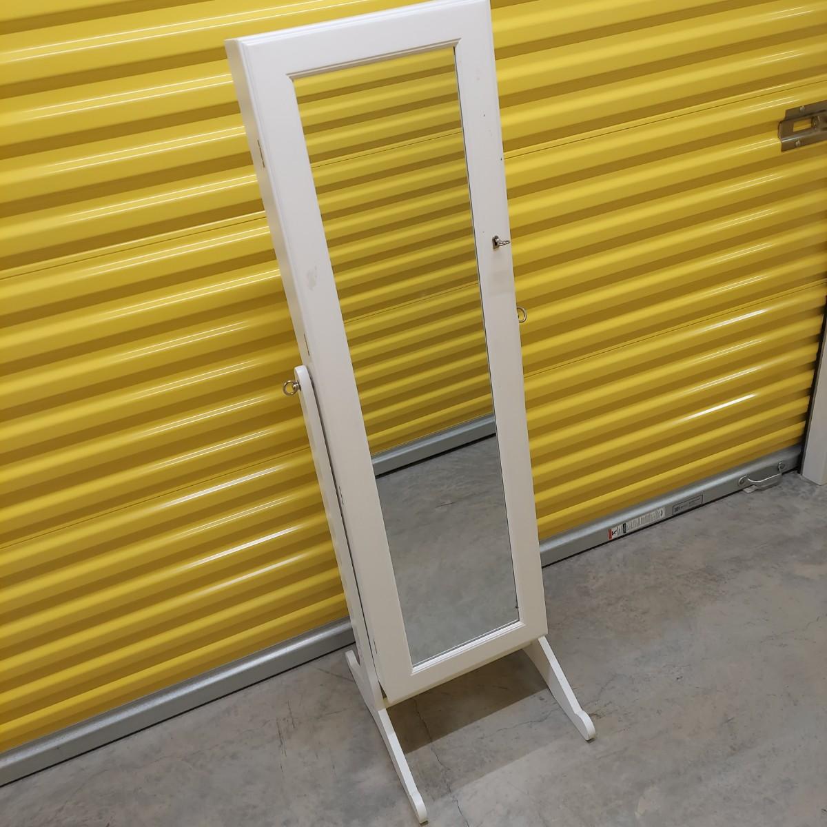 A white wooden full length mirror on a footed stand that opens to an inner jewelry box. Label states "For Your Ease Only by Lori Greiner". There is a decorative key that trips a latch. The whole piece measures approximately 14.5” x 18.5” x 57"H. The jewelry box portion alone is 14.5” x 4” x 48"H. There are some scratches on the surface as well as interior dust. Please see photos for details. Local Pickup Only