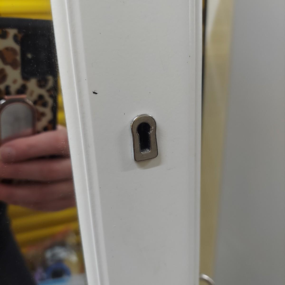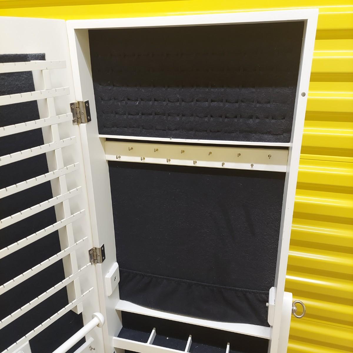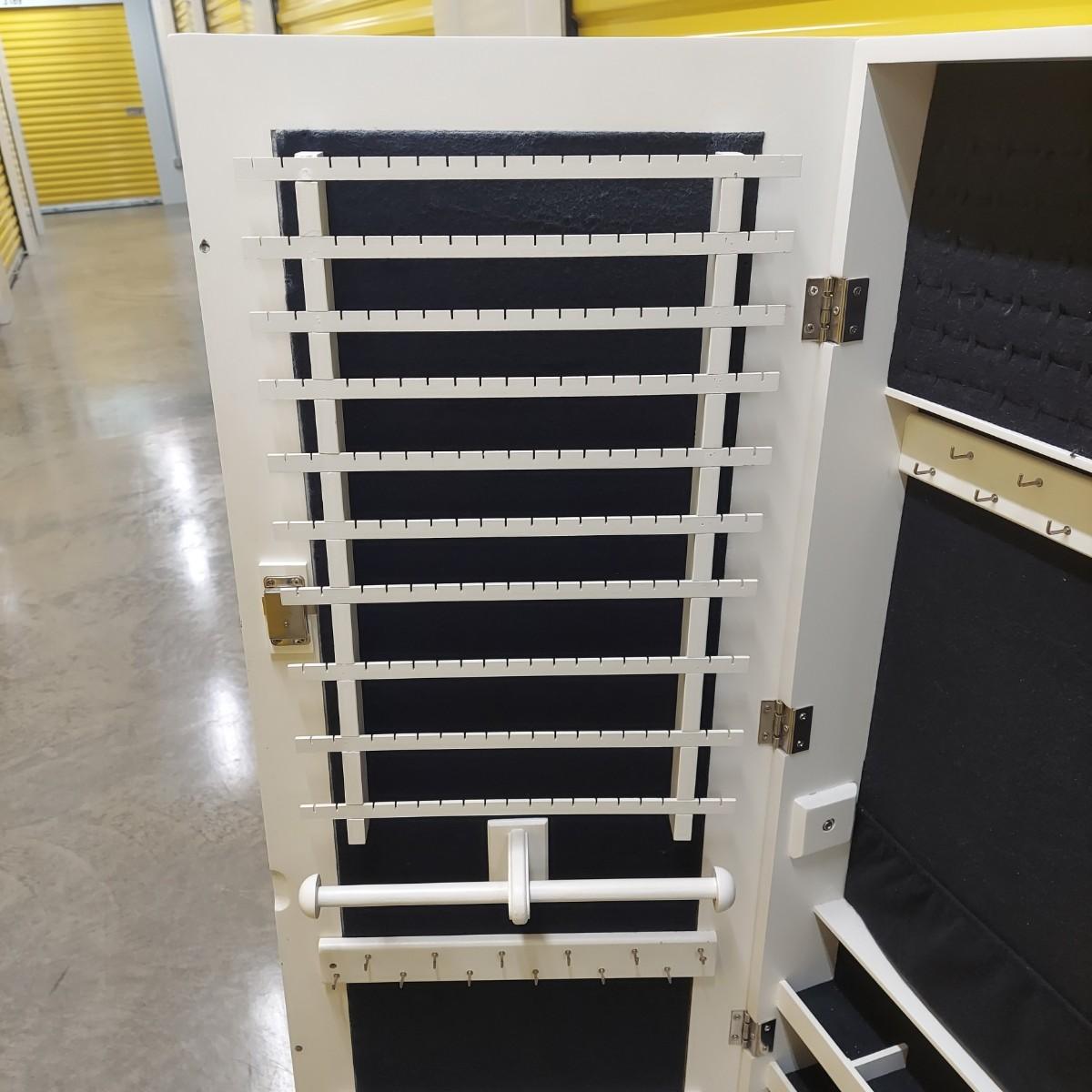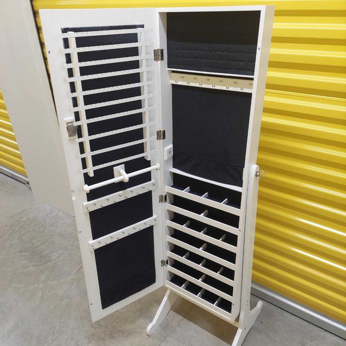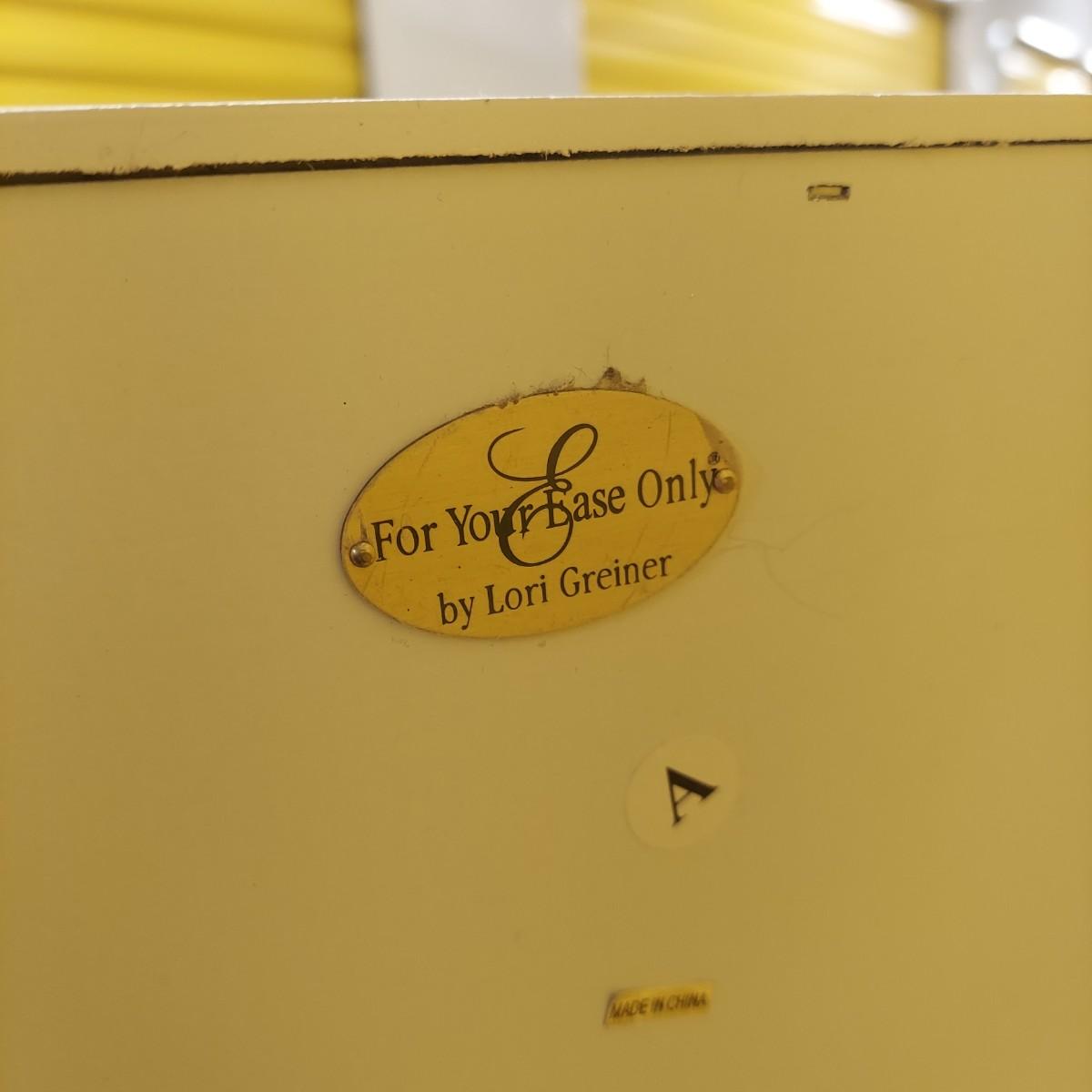A white wooden full length mirror on a footed stand that opens to an inner jewelry box. Label states "For Your Ease Only by Lori Greiner". There is a decorative key that trips a latch. The whole piece measures approximately 14.5” x 18.5” x 57"H. The jewelry box portion alone is 14.5” x 4” x 48"H. There are some scratches on the surface as well as interior dust. Please see photos for details. Local Pickup Only