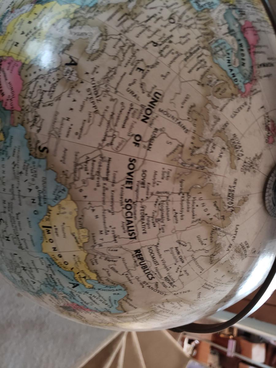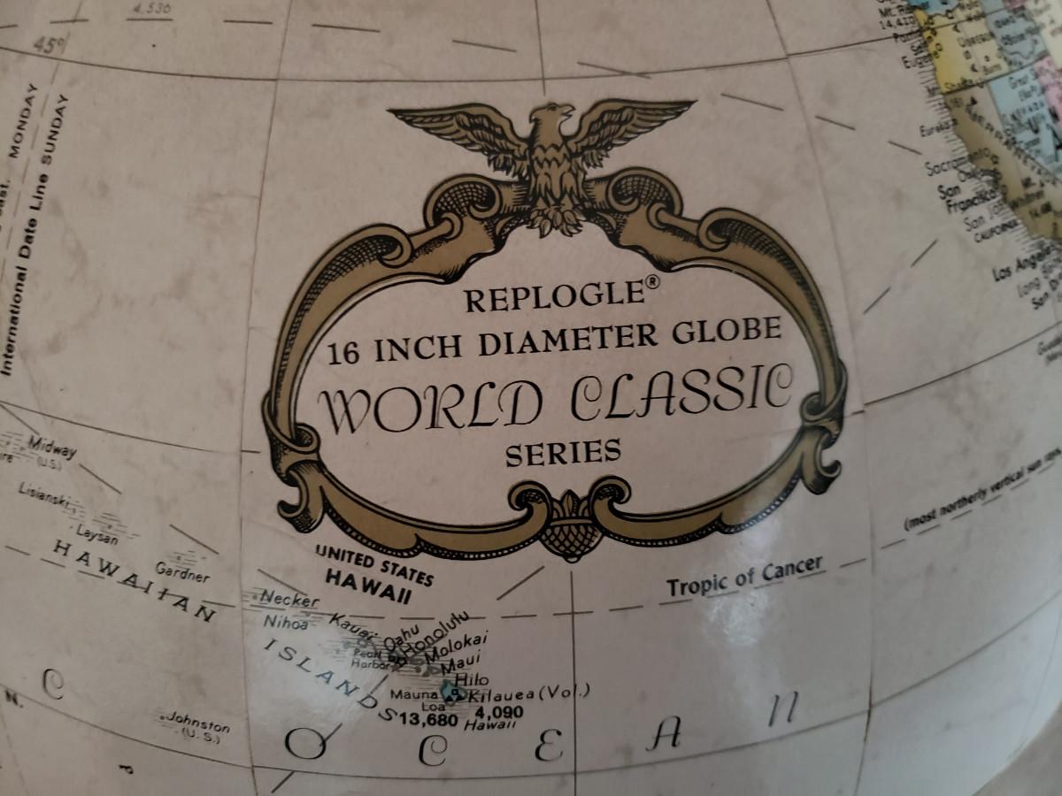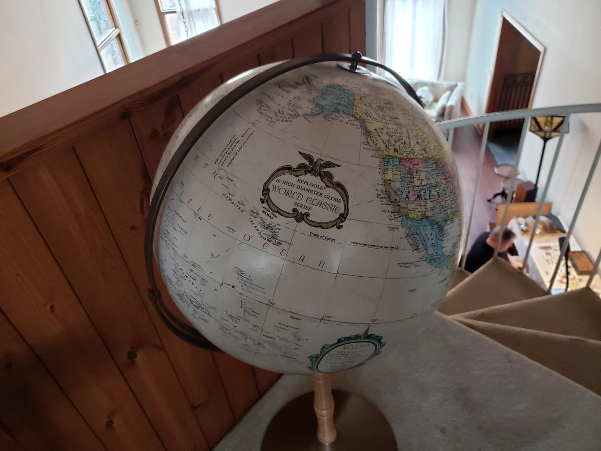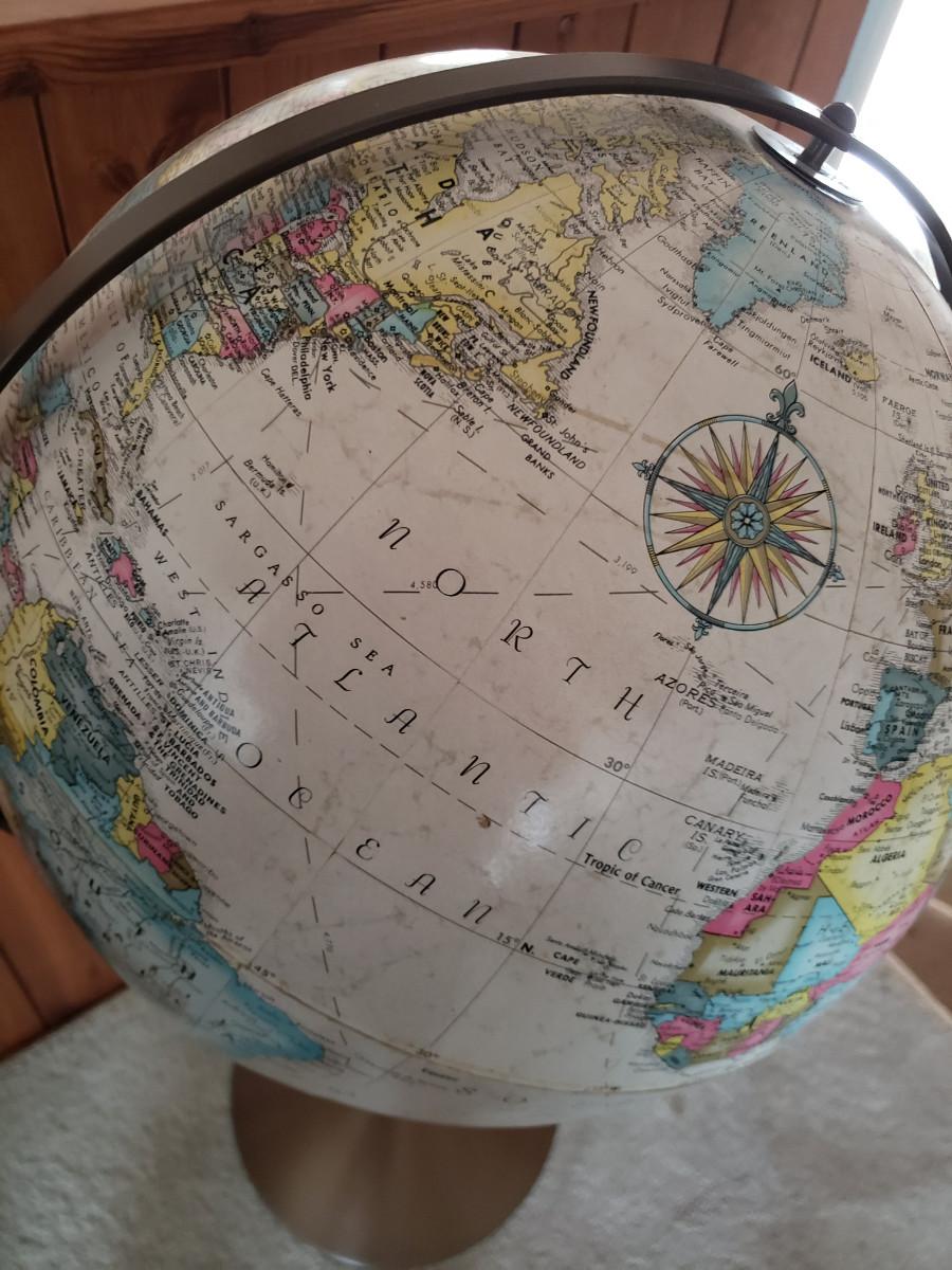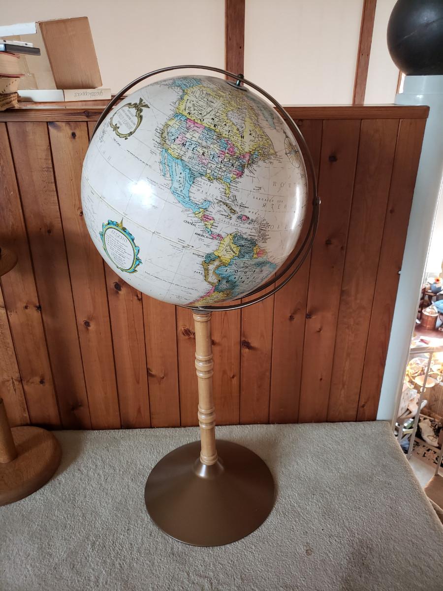 Globe is mounted on a wooden pole and enclosed in a bracket that allows it to be repositioned. See pictures for more details.