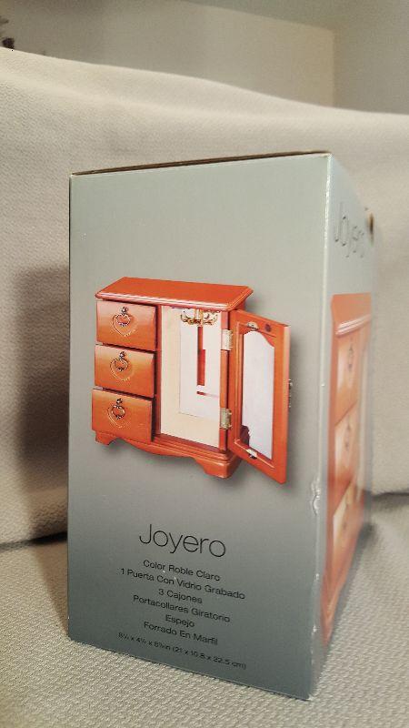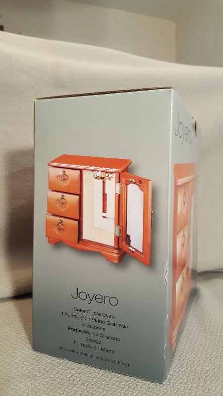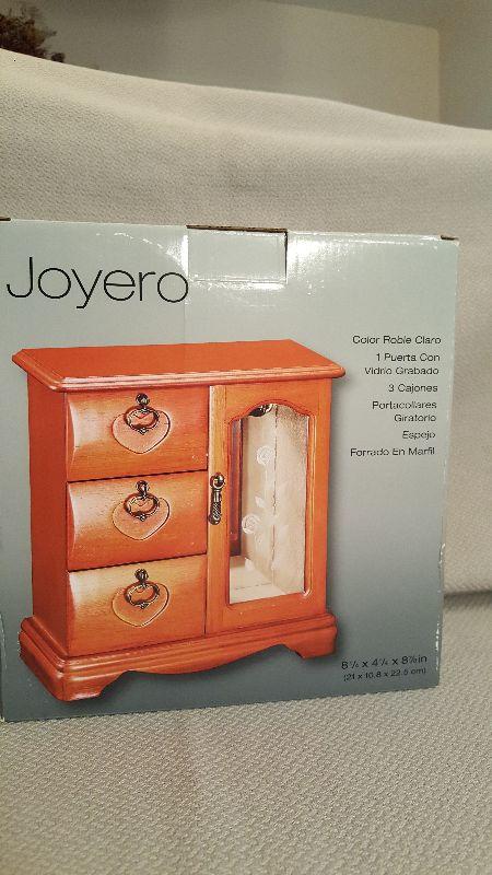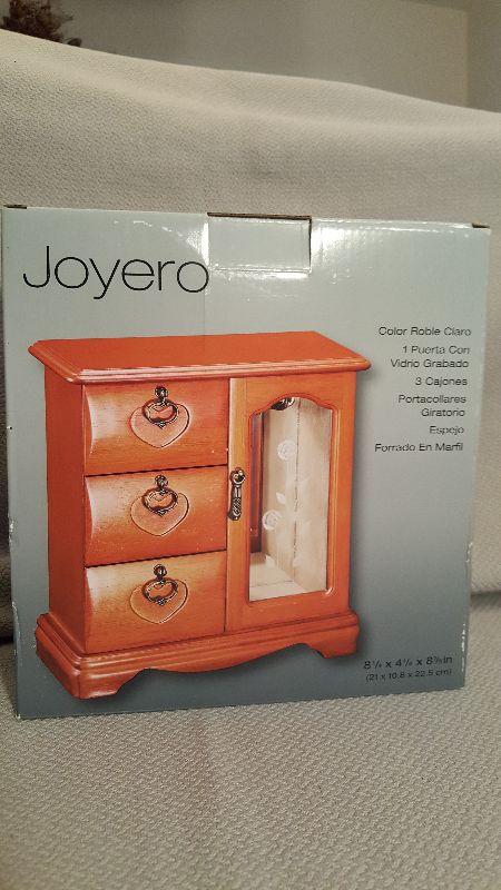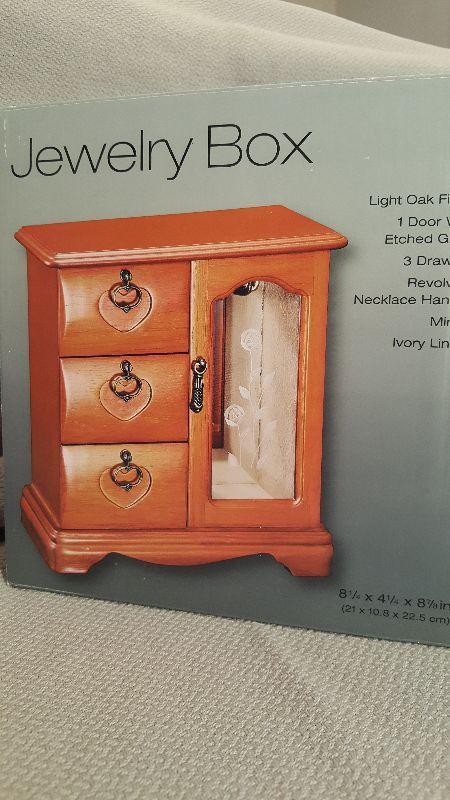 This lot is for a new-in-box Oak Finish Jewelry Box. The box measures about 8.5-inches X 4.5-inches X 9-inches. The box has drawers with wire hearts as pulls and inset design. It sports an Etched-Glass Door with revolving Necklace Hanger, a mirror and nice ivory-colored lining. We did not de-box for photos to ensure safer shipping to the winning bidder. Donated by Diann Nance