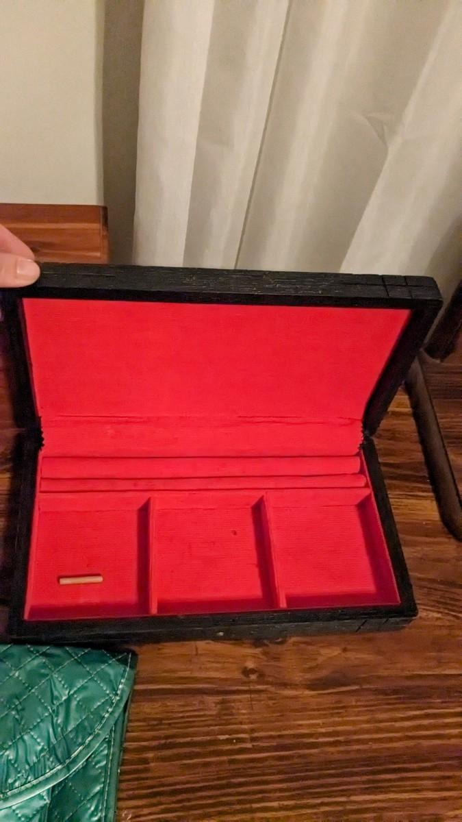 12.5"x 16"x 39.5" standing jewelry box that does show damage, as seen in photos. Still functional with damage previously hidden by doily. Also includes 12.25"x 7.5"x 10.25" dresser top jewelry box with opening top that needs the mirror reglued in to the lid. A small mens dresser top padded top organizer, and 2 small wooden trinket boxes with quilt side travelling jewelry case. No shipping
