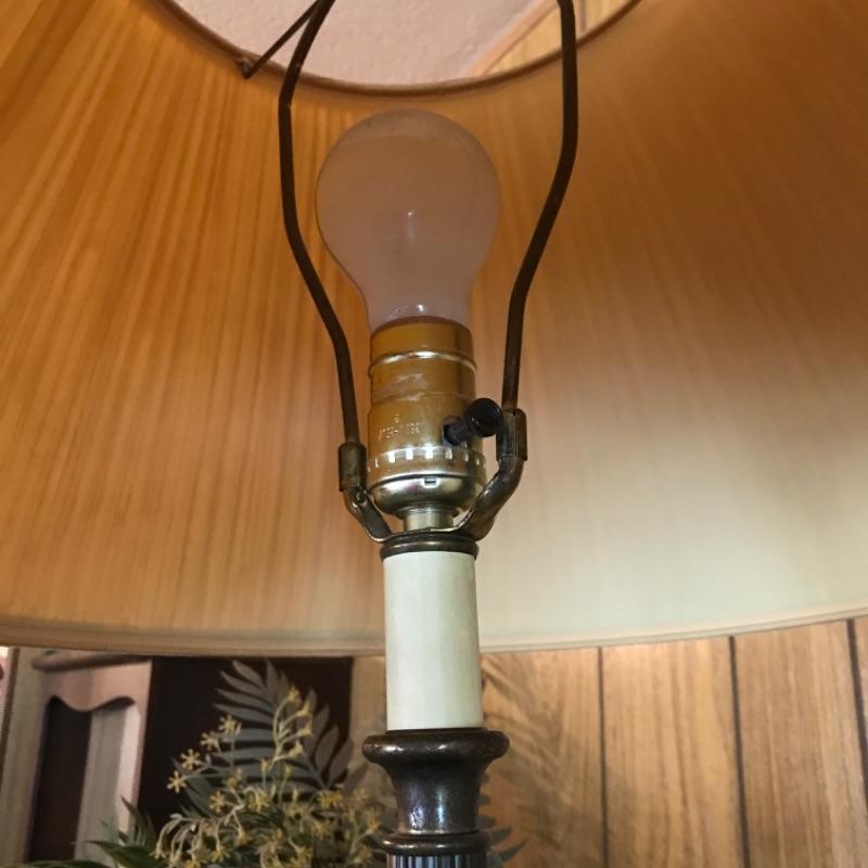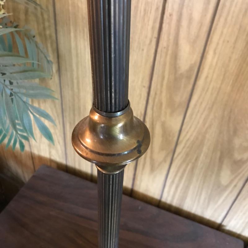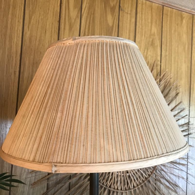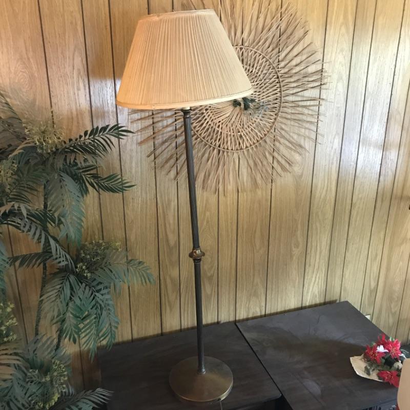 One standing upright Lampm with lamp Shade, 72 W bulb. The lamp stands slightly askew as the base is very wobbly.