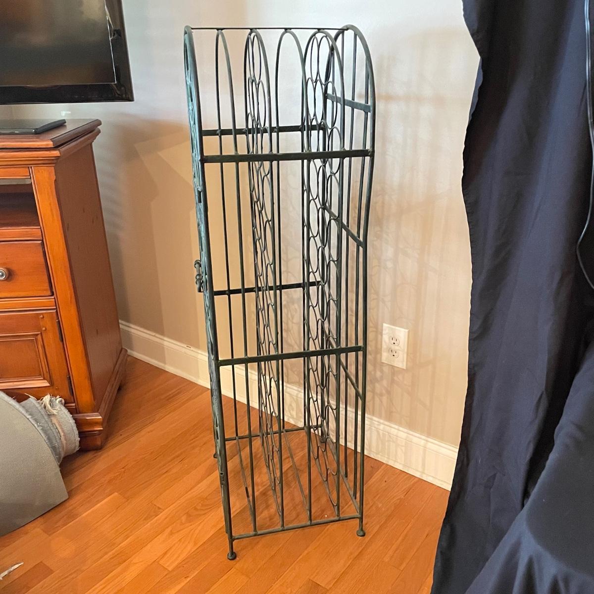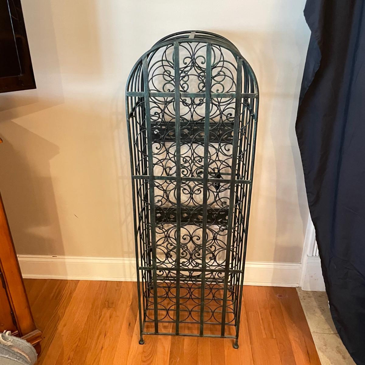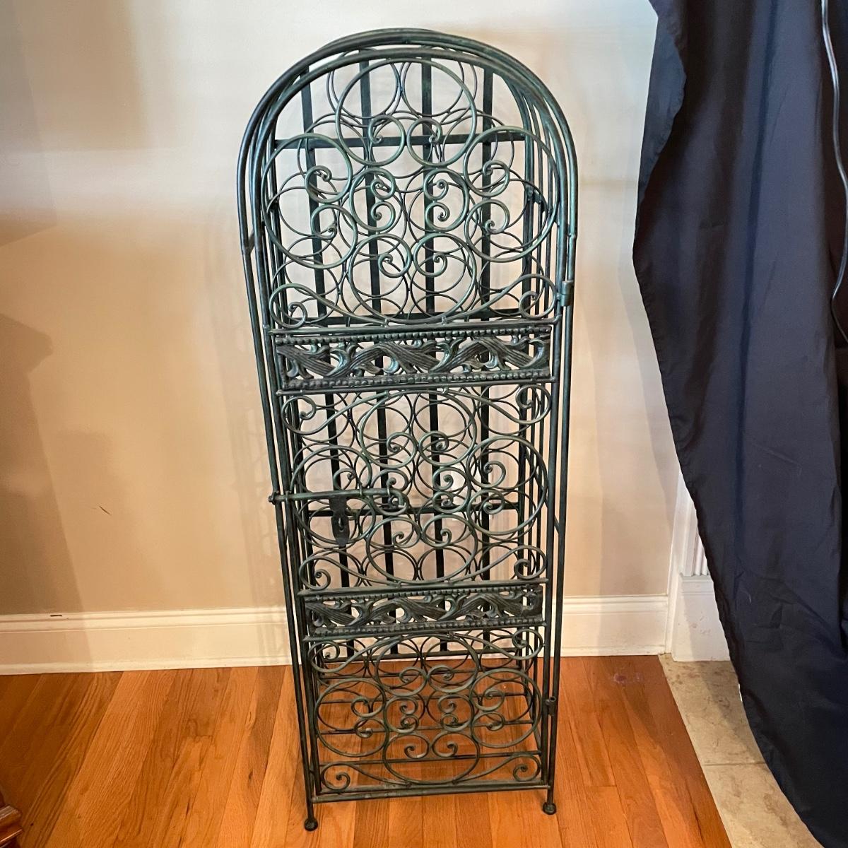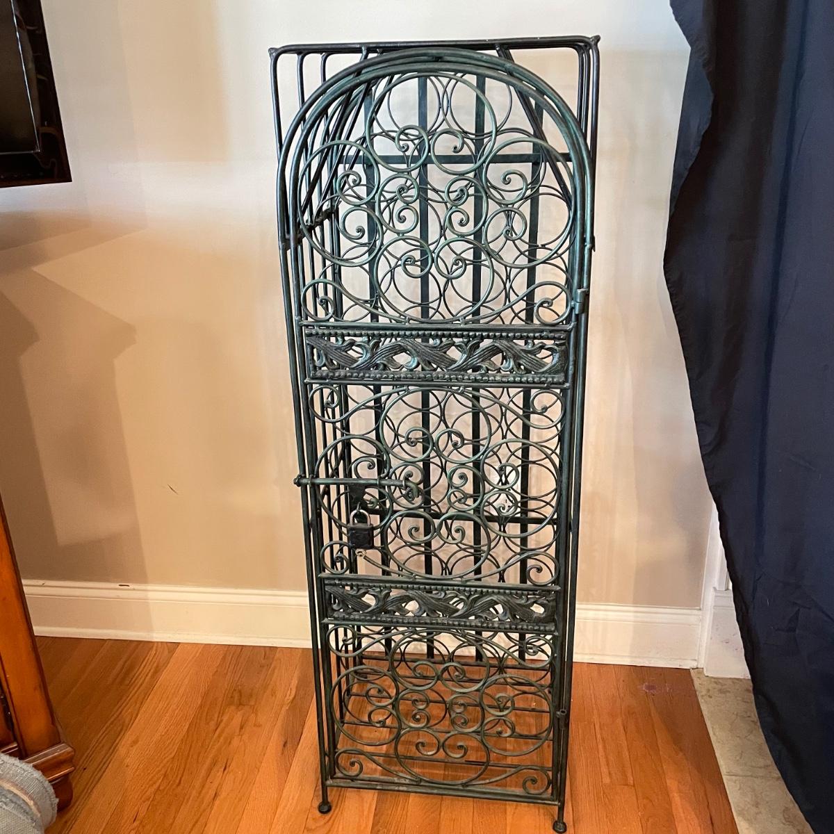 Green hued wrought iron wine rack with a 45 bottle capacity and what appears to be a vintage padlock and key. Wine rack also has a black metal shelf that sits perfectly on top turning its domed roof into a flat surface. The shelf has one corner that has separated. Green wine rack measures 16” x 14” x 48”H. See images. Local pick up only.