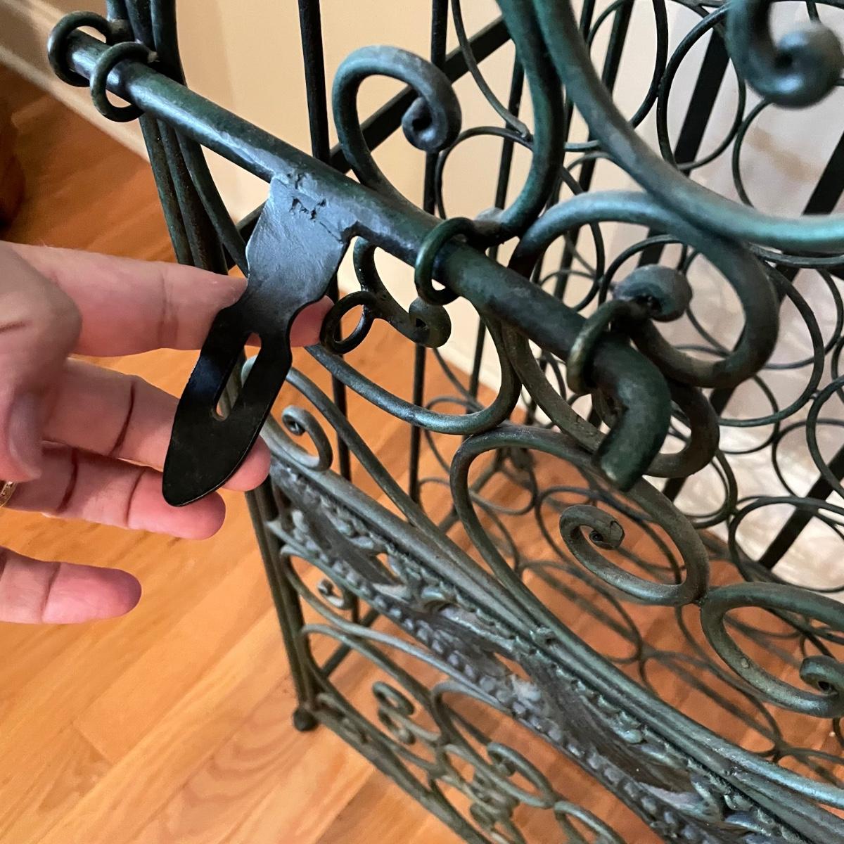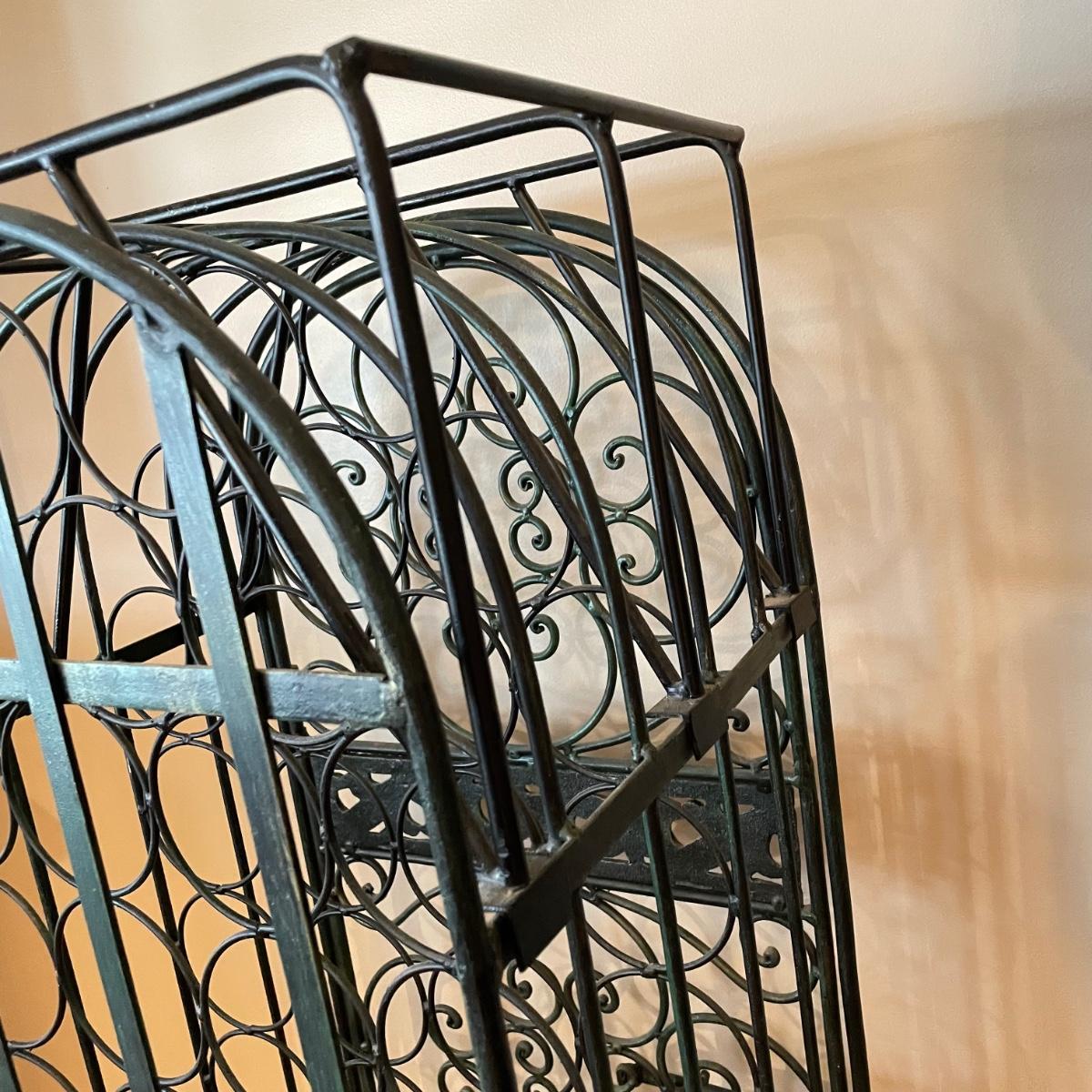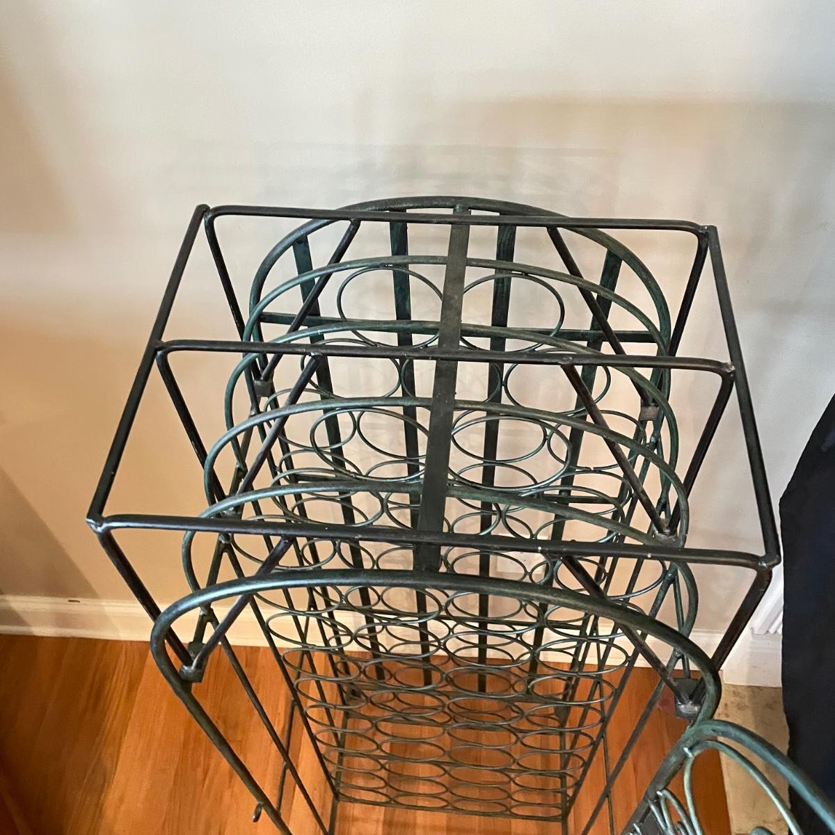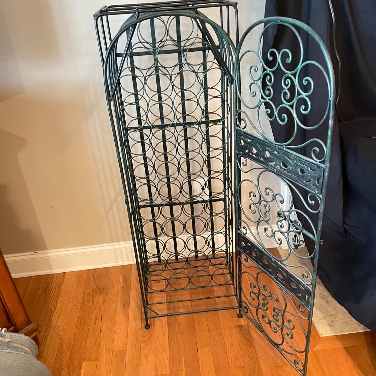 Green hued wrought iron wine rack with a 45 bottle capacity and what appears to be a vintage padlock and key. Wine rack also has a black metal shelf that sits perfectly on top turning its domed roof into a flat surface. The shelf has one corner that has separated. Green wine rack measures 16” x 14” x 48”H. See images. Local pick up only.