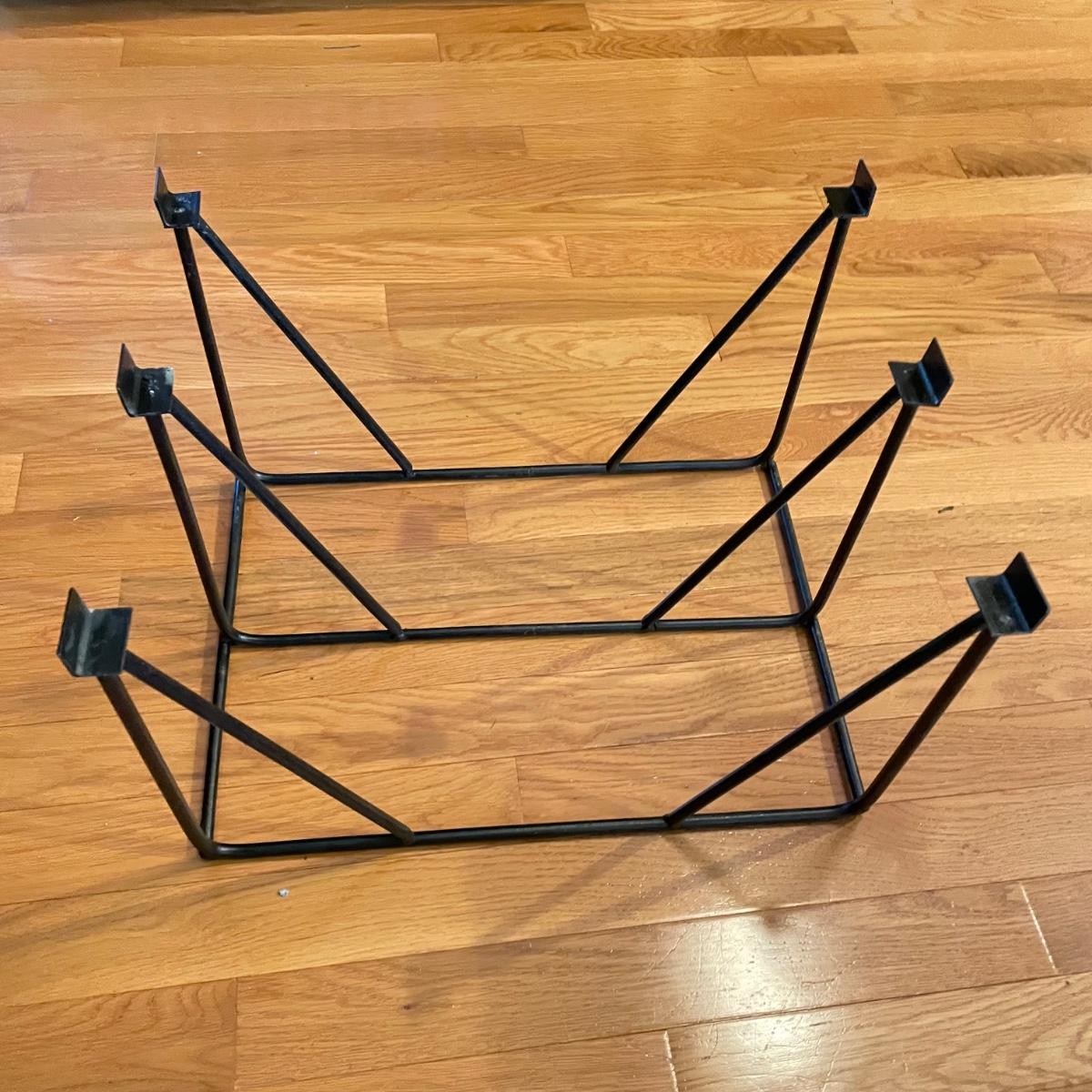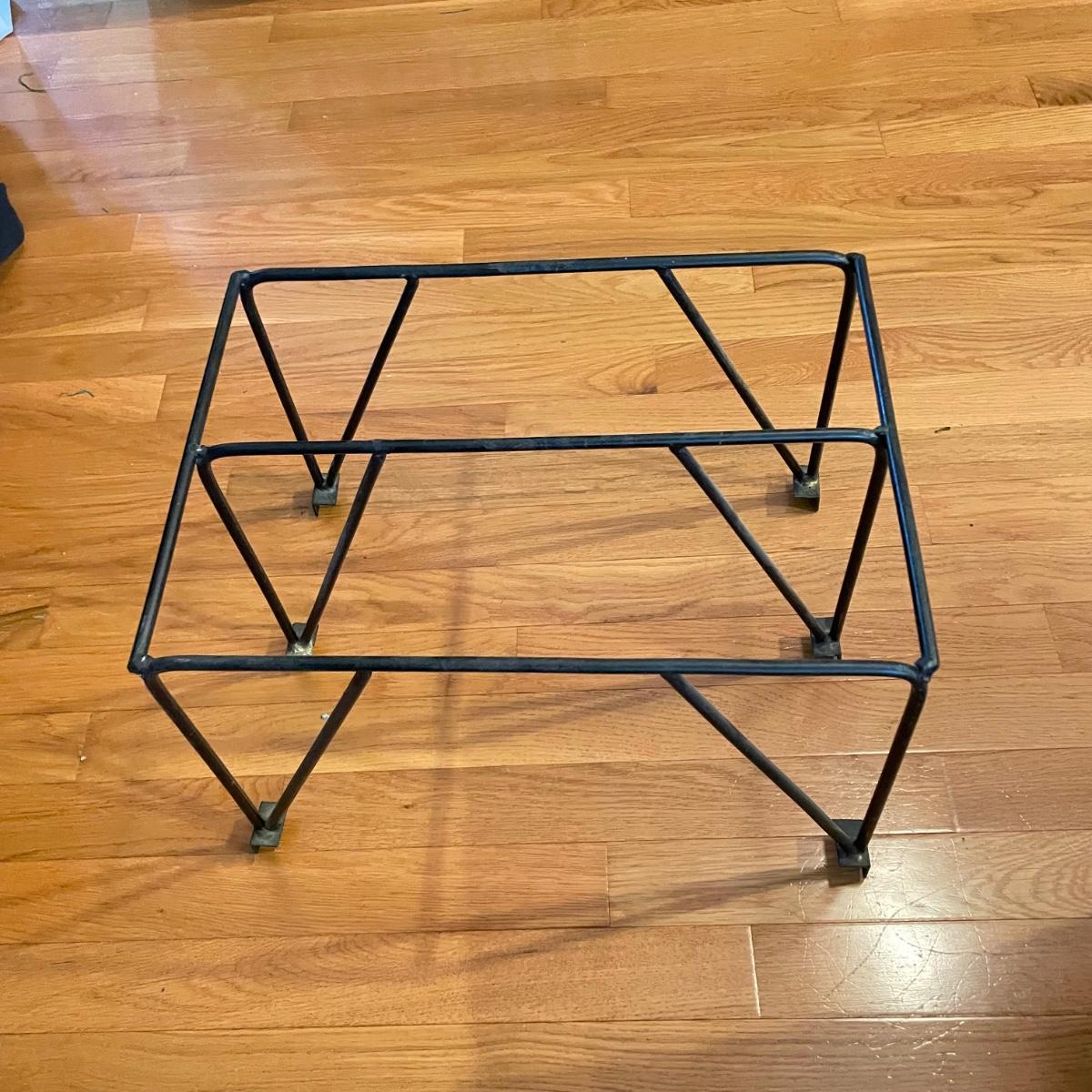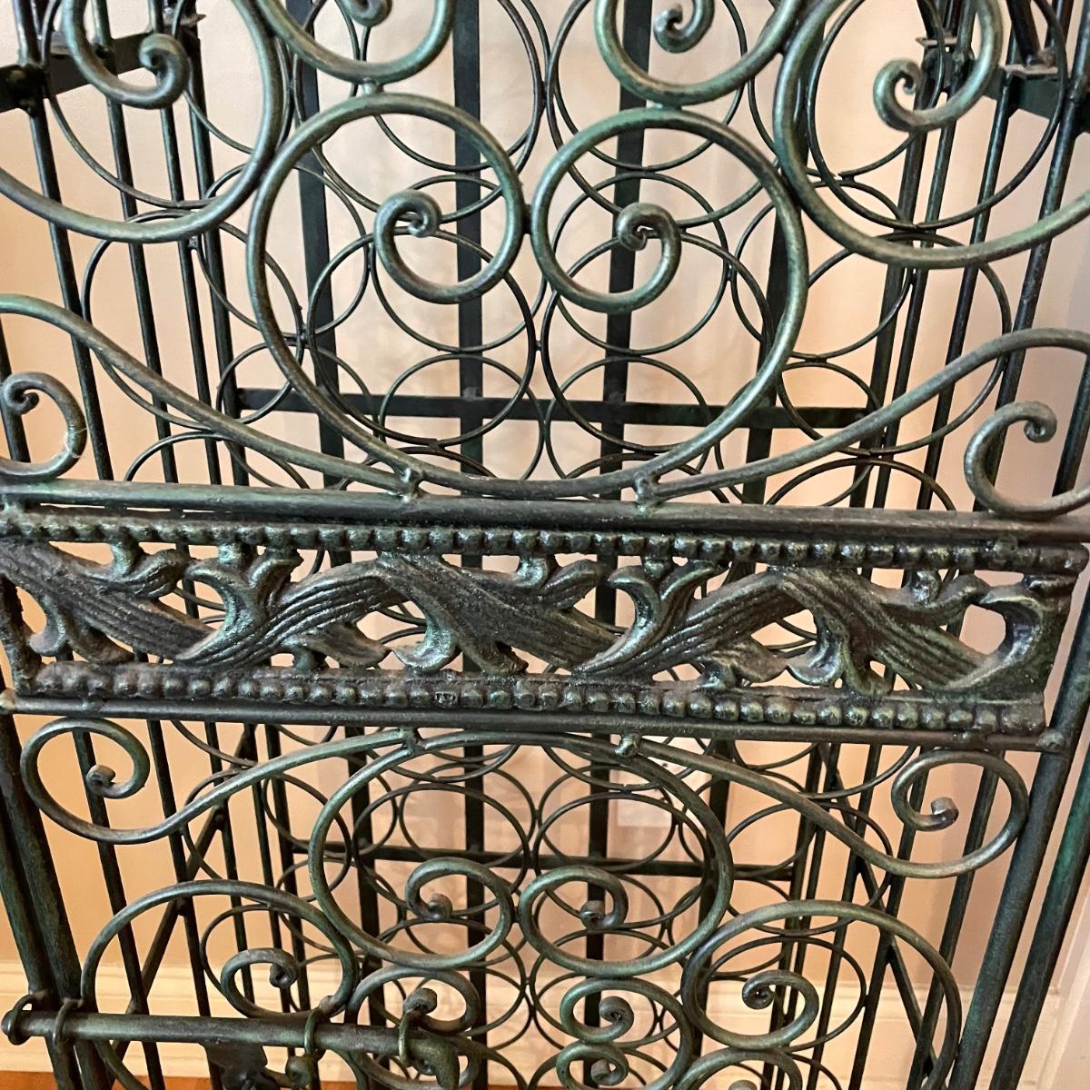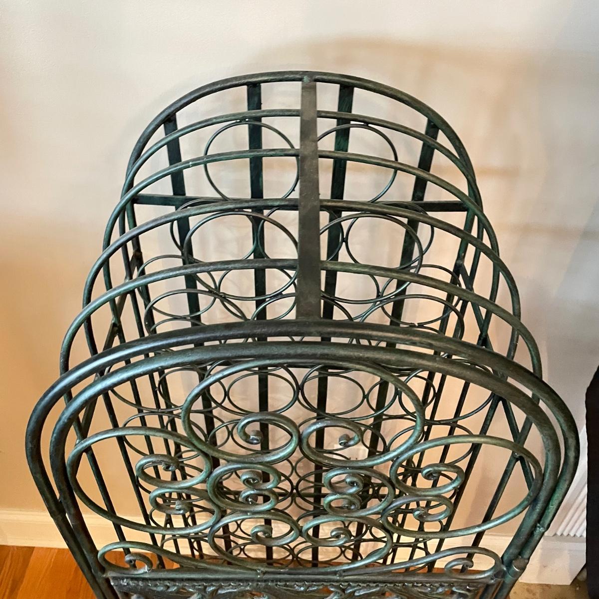 Green hued wrought iron wine rack with a 45 bottle capacity and what appears to be a vintage padlock and key. Wine rack also has a black metal shelf that sits perfectly on top turning its domed roof into a flat surface. The shelf has one corner that has separated. Green wine rack measures 16” x 14” x 48”H. See images. Local pick up only.