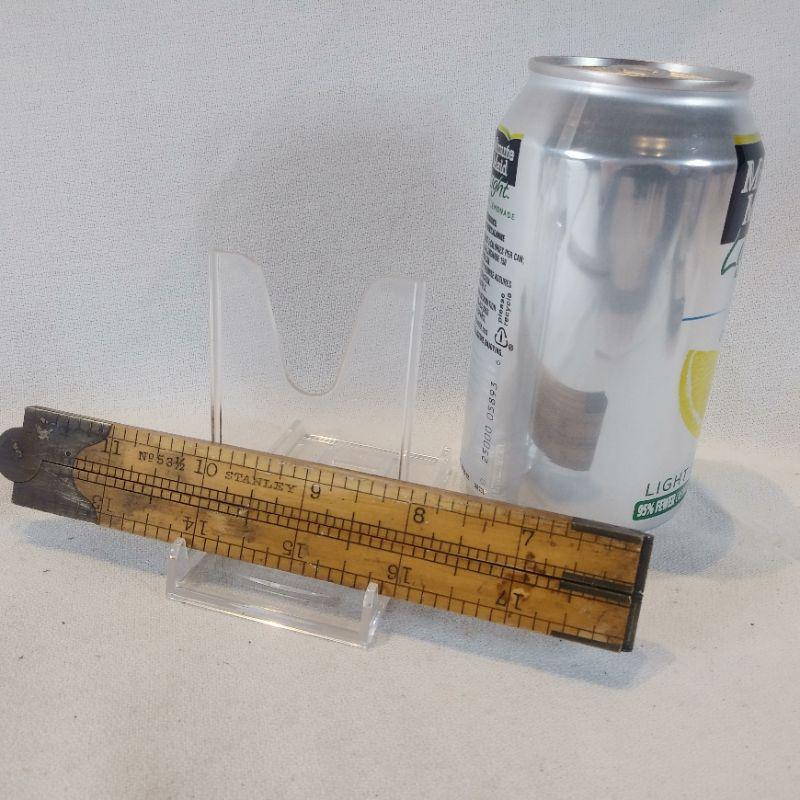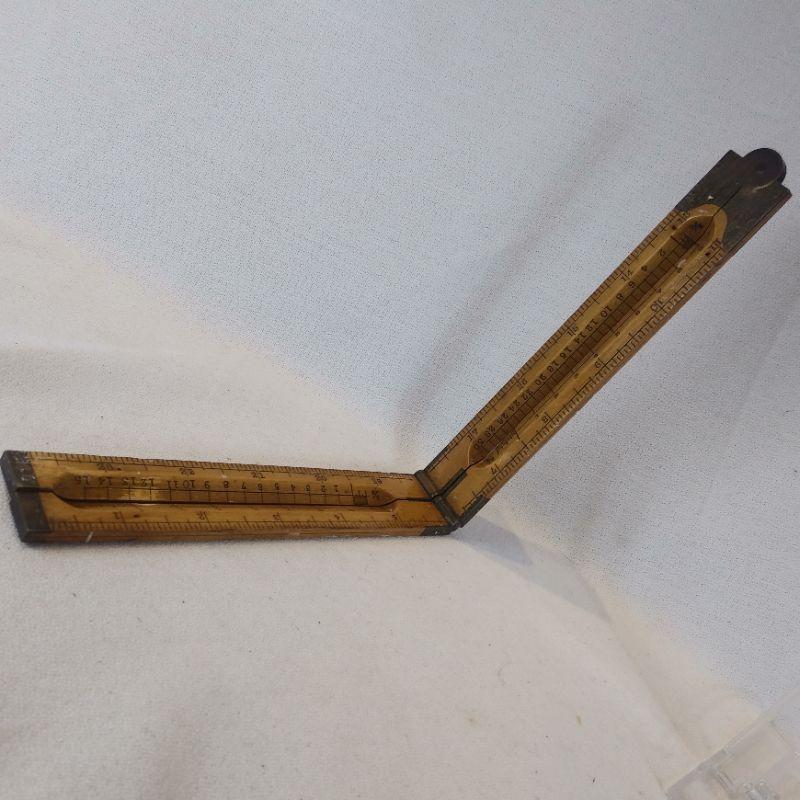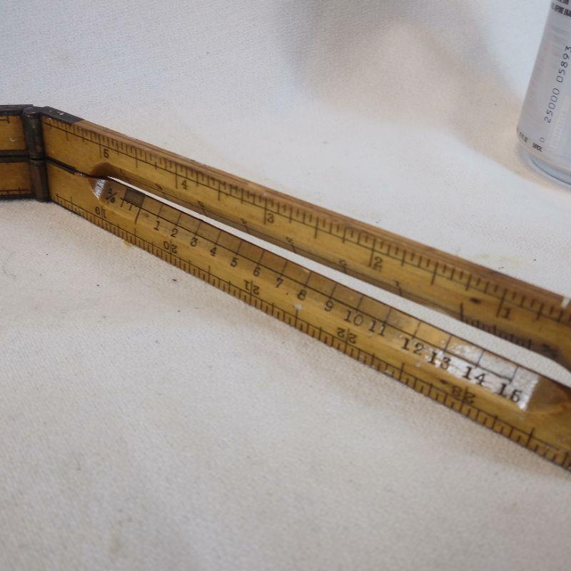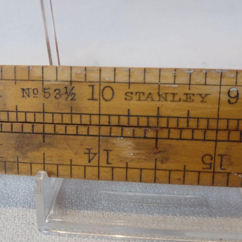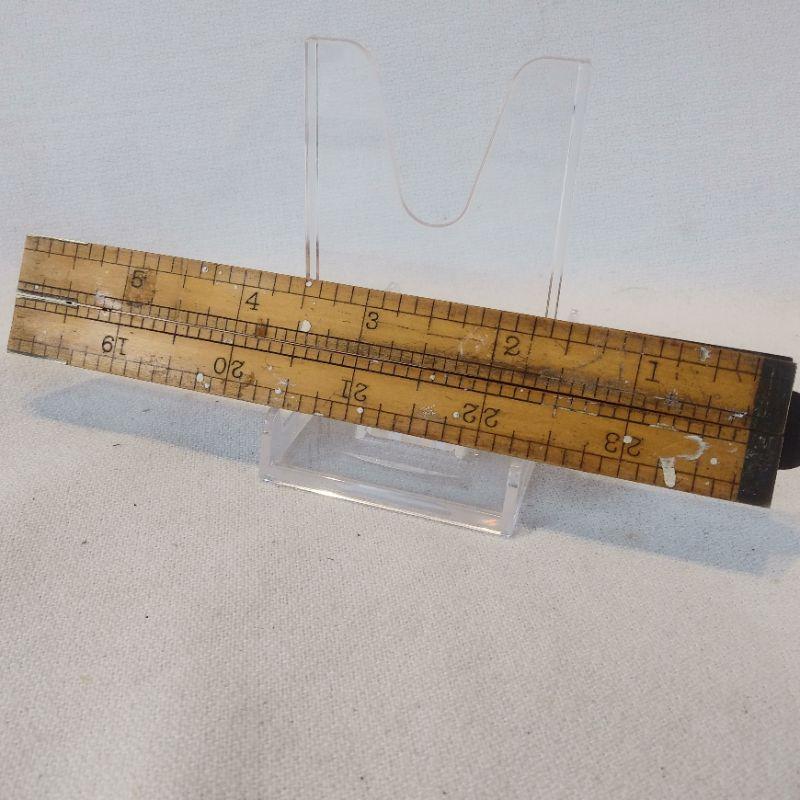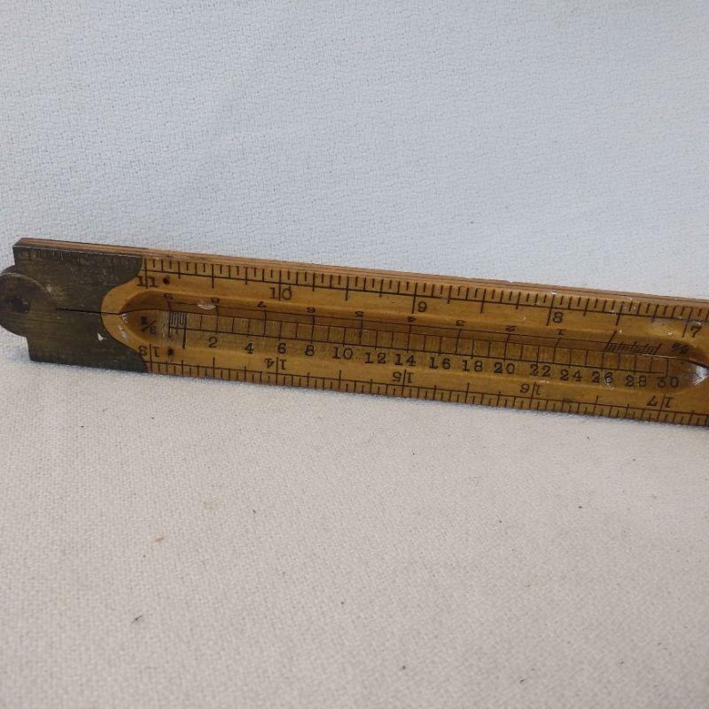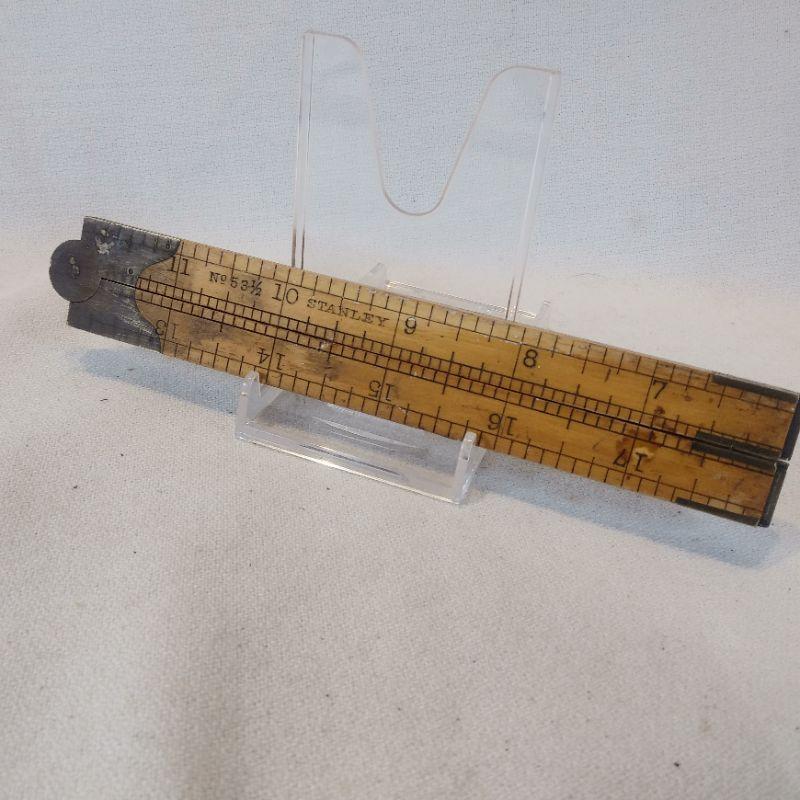 This is a unique vintage Stanley Architects Rule - #53 1/2. Opens to 24-inches. Boxwood and brass, brass is tarnished and rule is in used condition. Has some paint splatter on one side. This one is very different - the architect scale is in the center beveled area of the ruler. Quite cool! Reserve/starting price is $20.