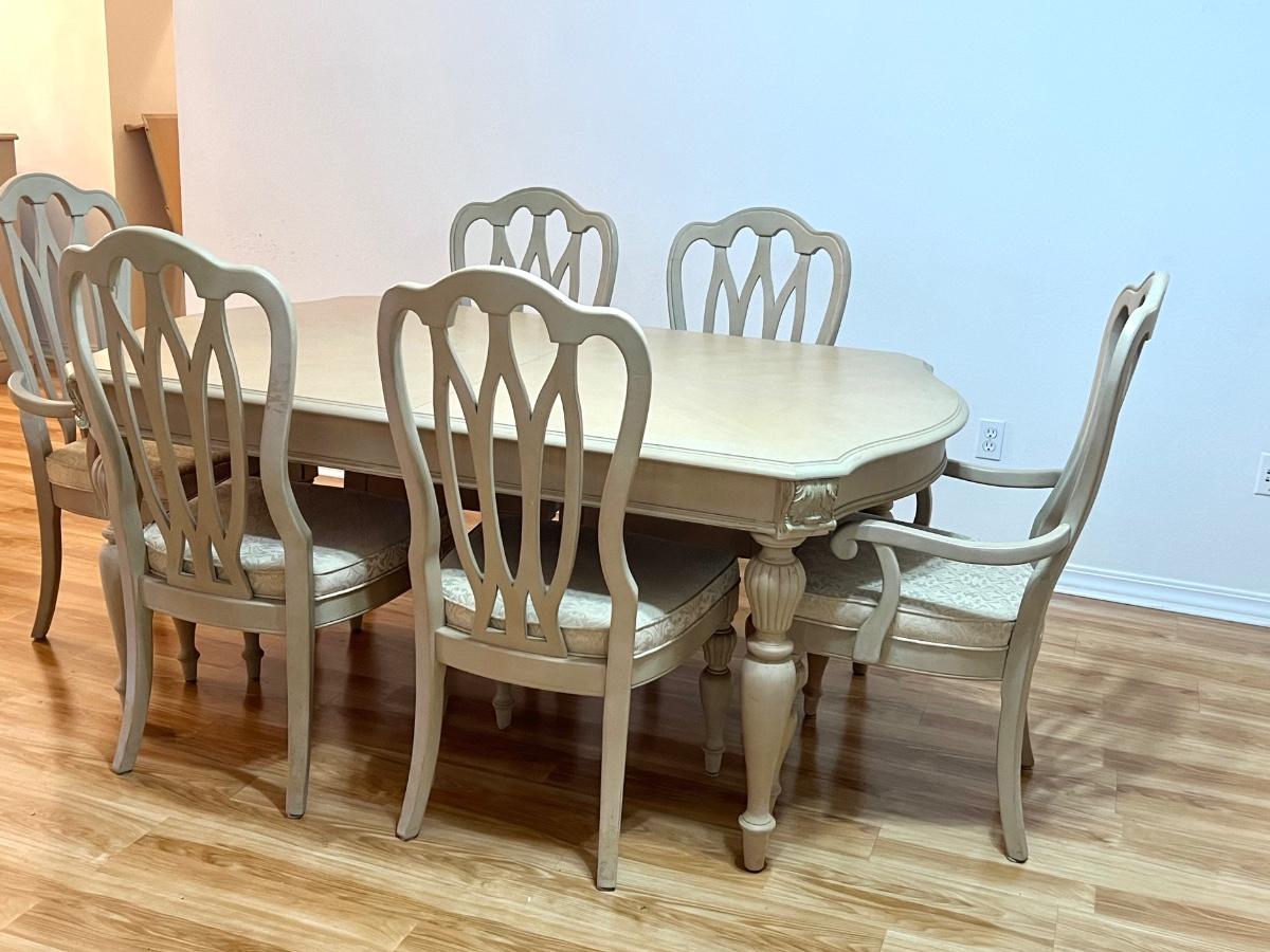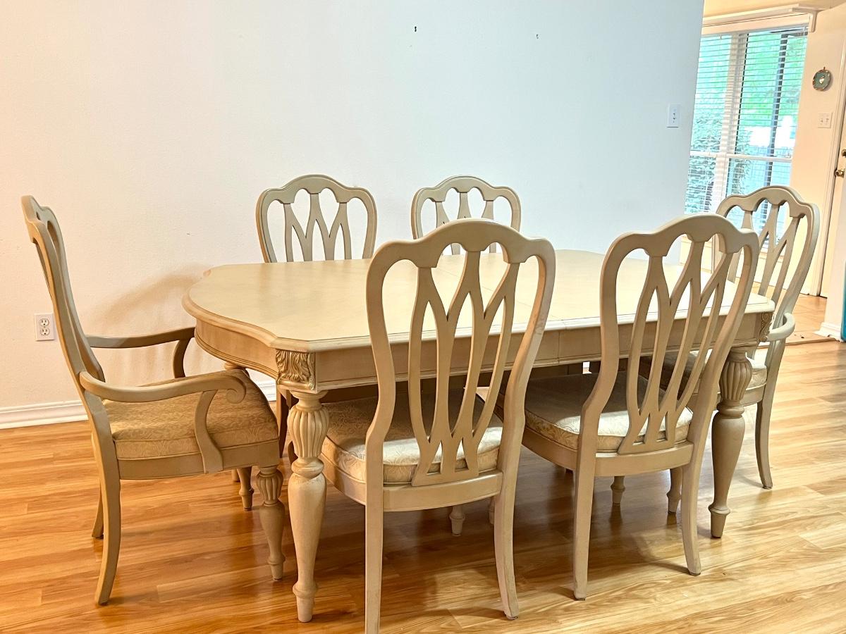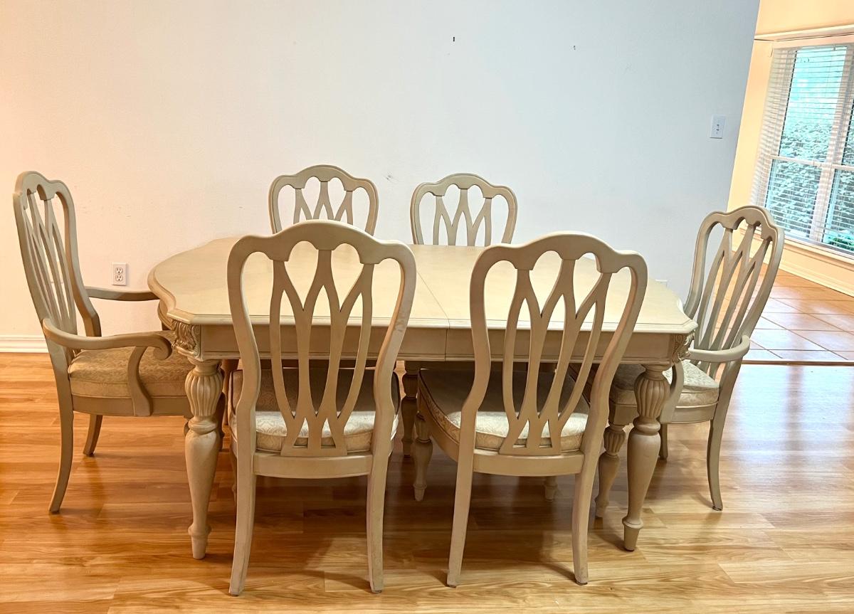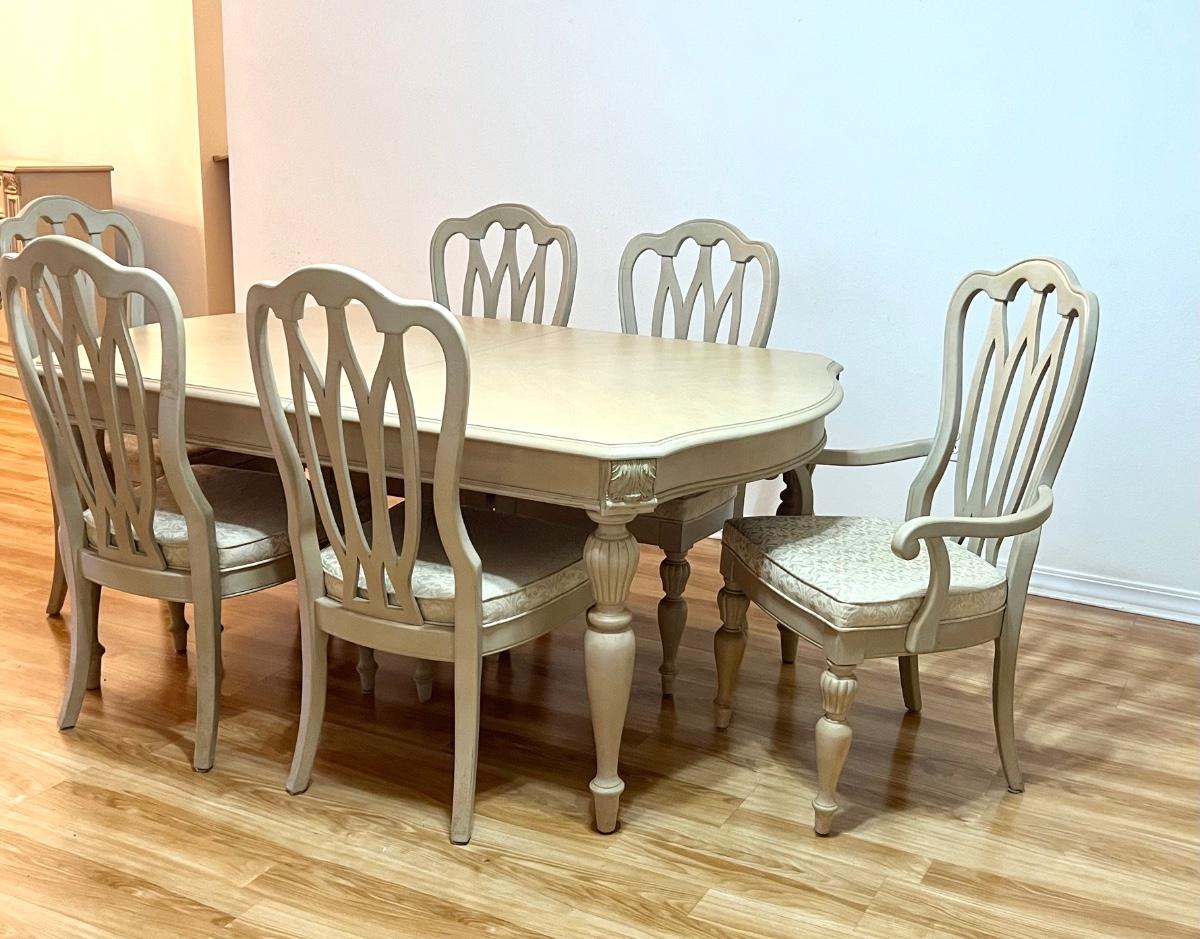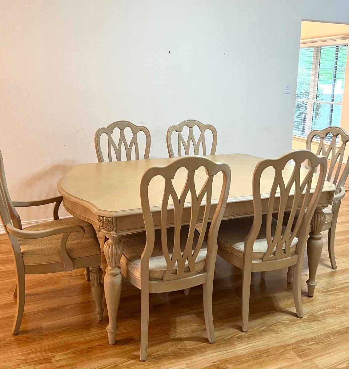 STANLEY FURNITURE Solid wood, made in the USA. Color is marked as D Wash under the table. As pictured. Comes with 6 chairs, two captain chairs and 4 regular chairs,Table measures 30 inches tall, 44 inches tall, and 69 inches wide. Chairs measure 42 inches tall, 21 inches wide. Floor to seat measures 18 1/2 inches tall. Table has 2 additional leafs (not pictured) each measure 20 inches.