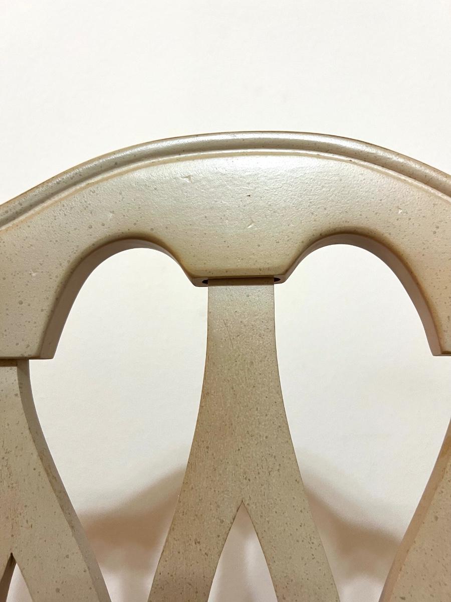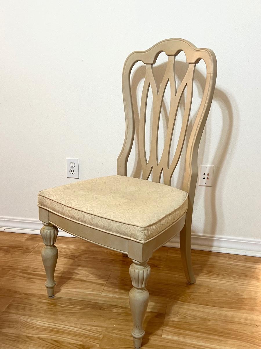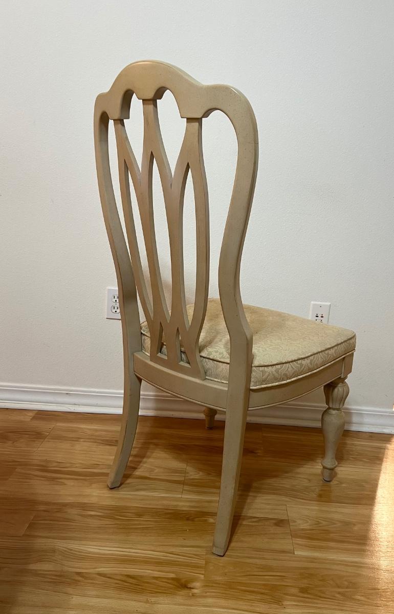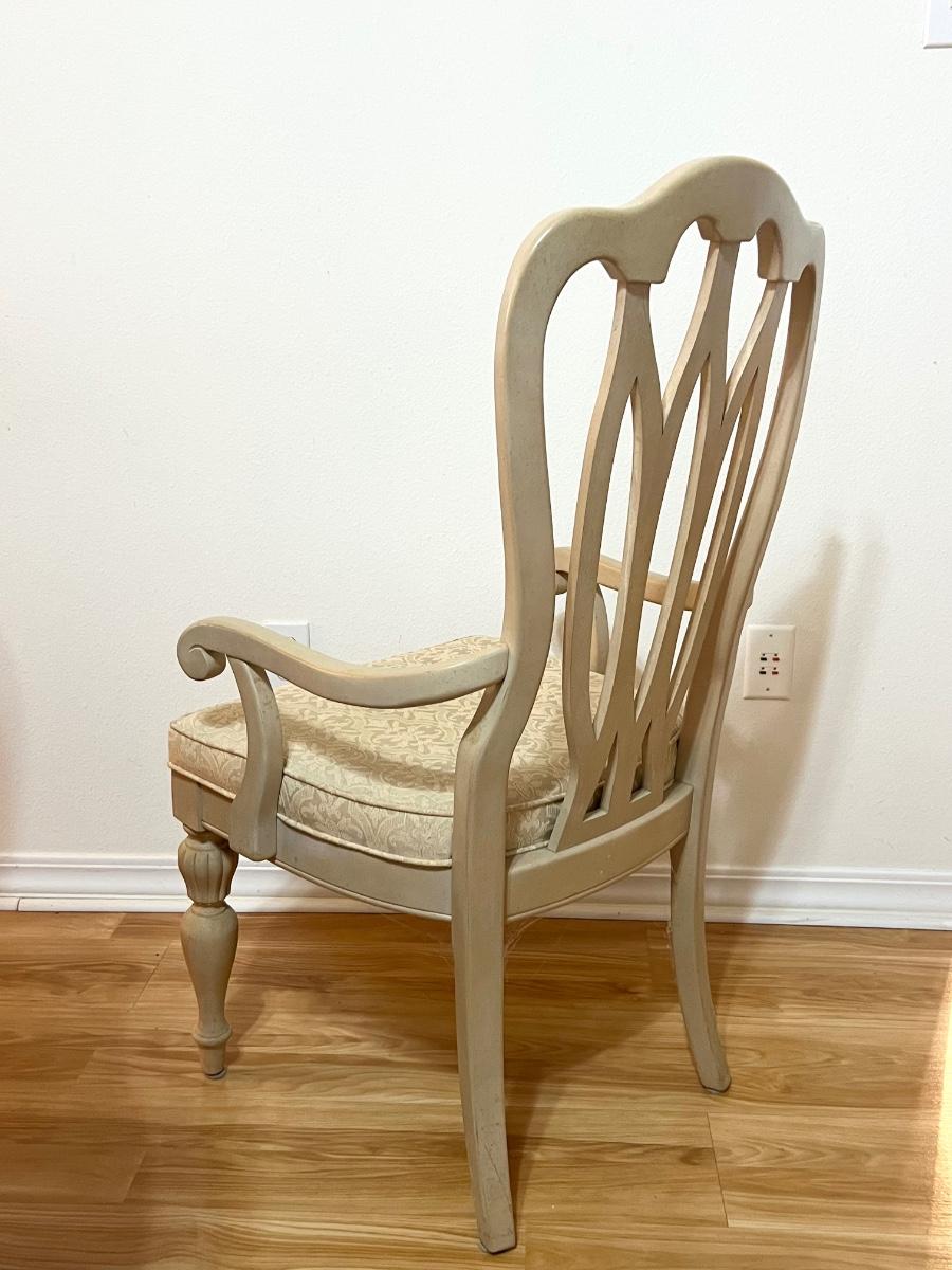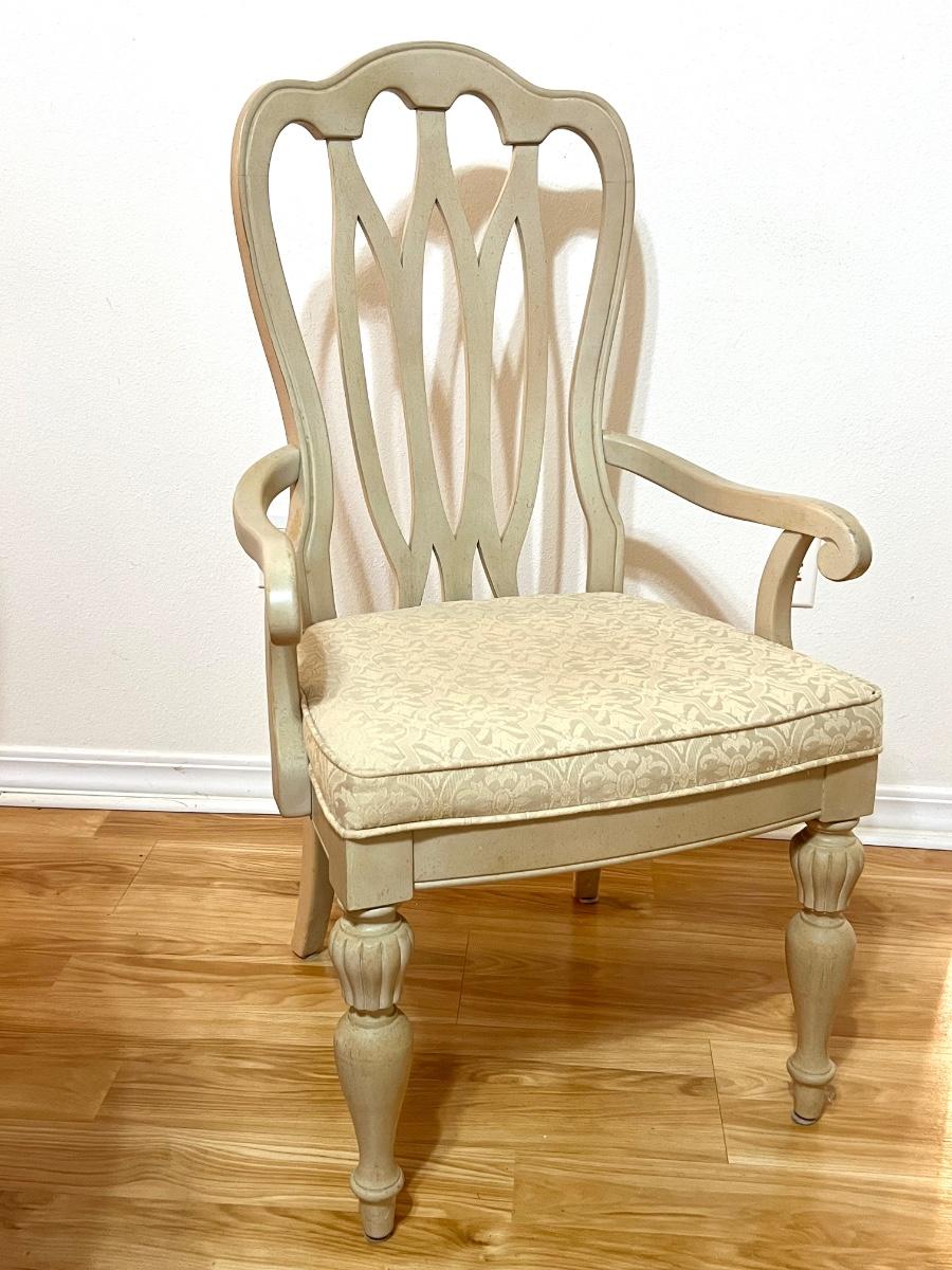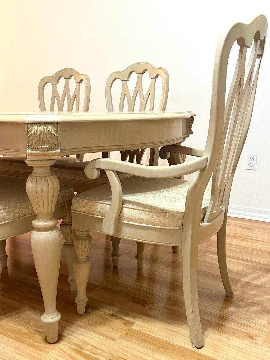 STANLEY FURNITURE Solid wood, made in the USA. Color is marked as D Wash under the table. As pictured. Comes with 6 chairs, two captain chairs and 4 regular chairs,Table measures 30 inches tall, 44 inches tall, and 69 inches wide. Chairs measure 42 inches tall, 21 inches wide. Floor to seat measures 18 1/2 inches tall. Table has 2 additional leafs (not pictured) each measure 20 inches.