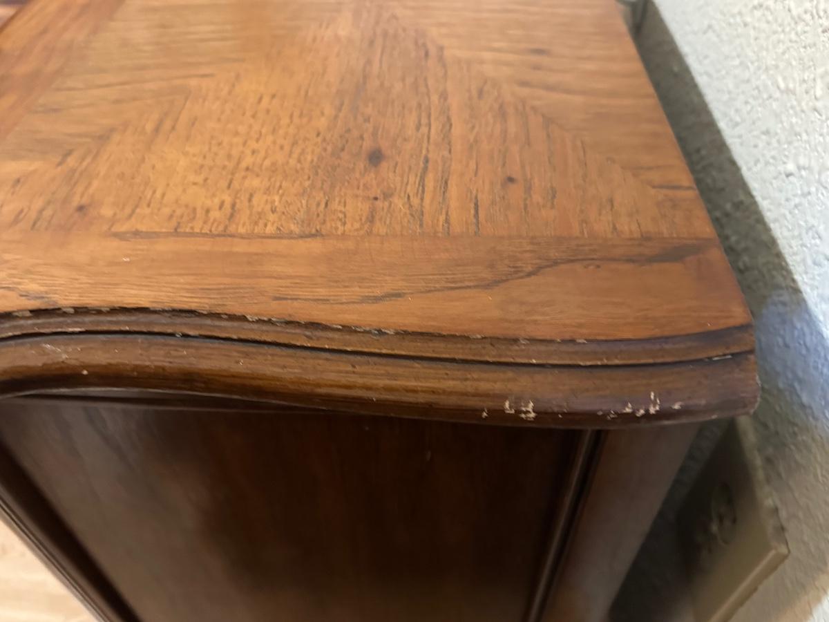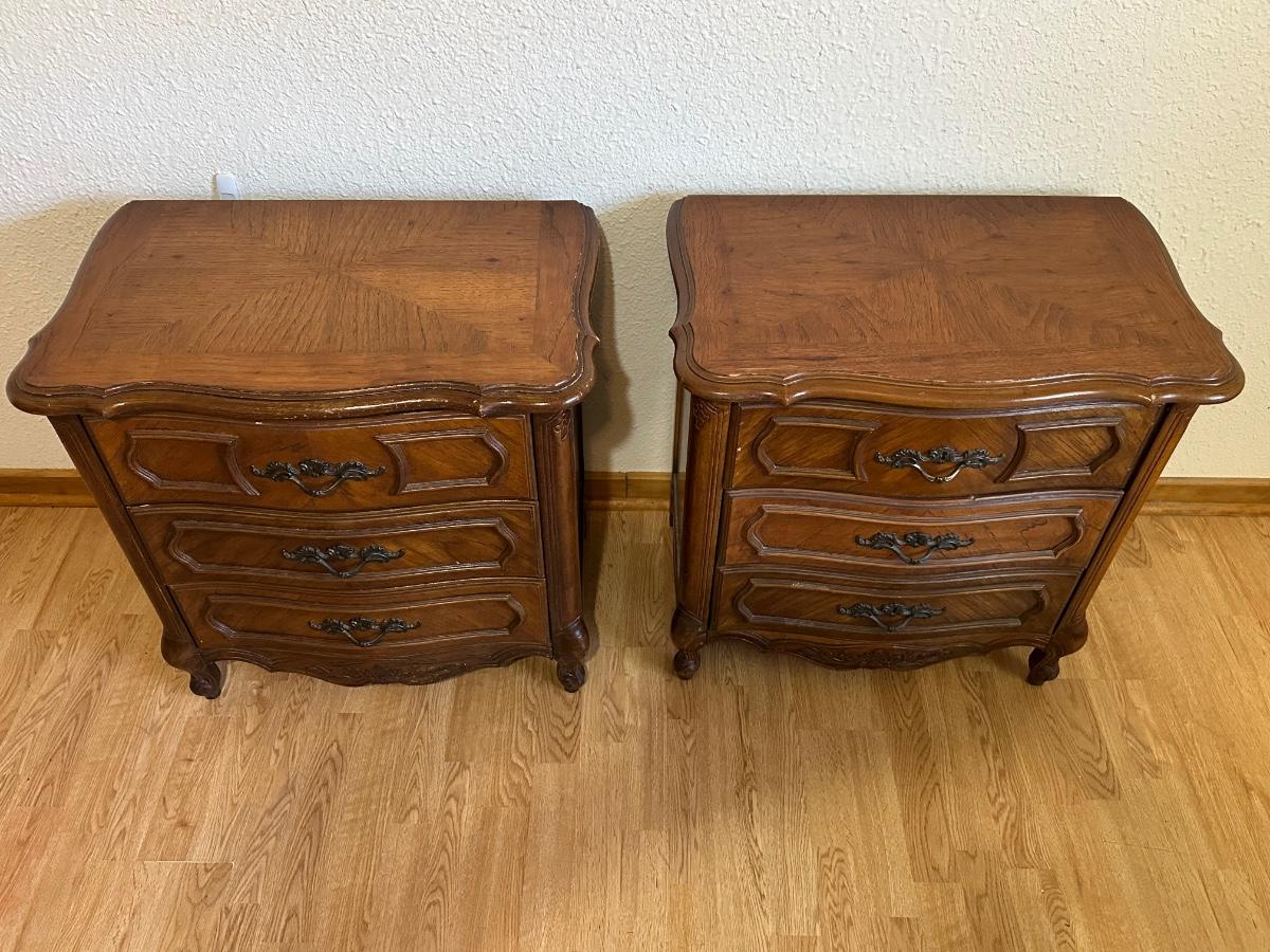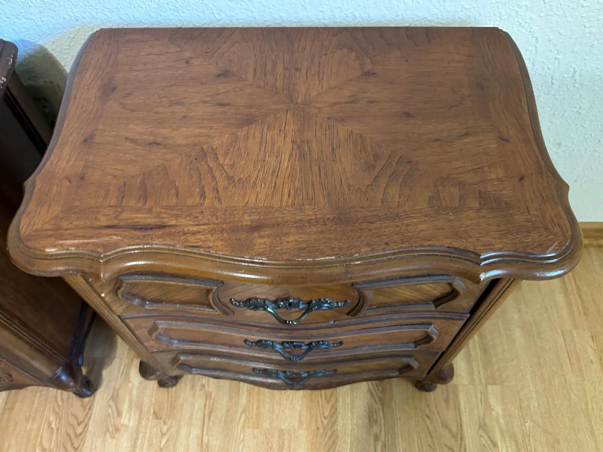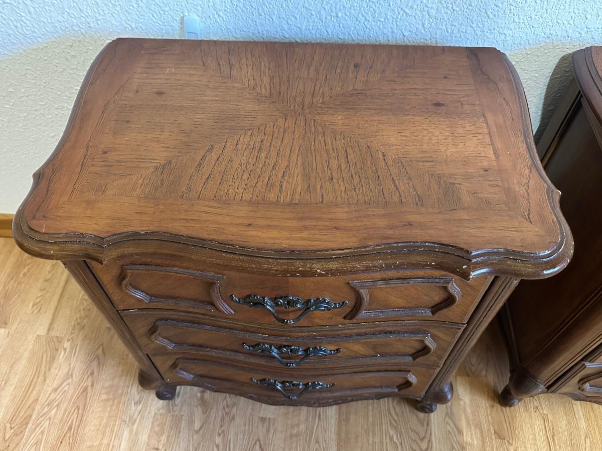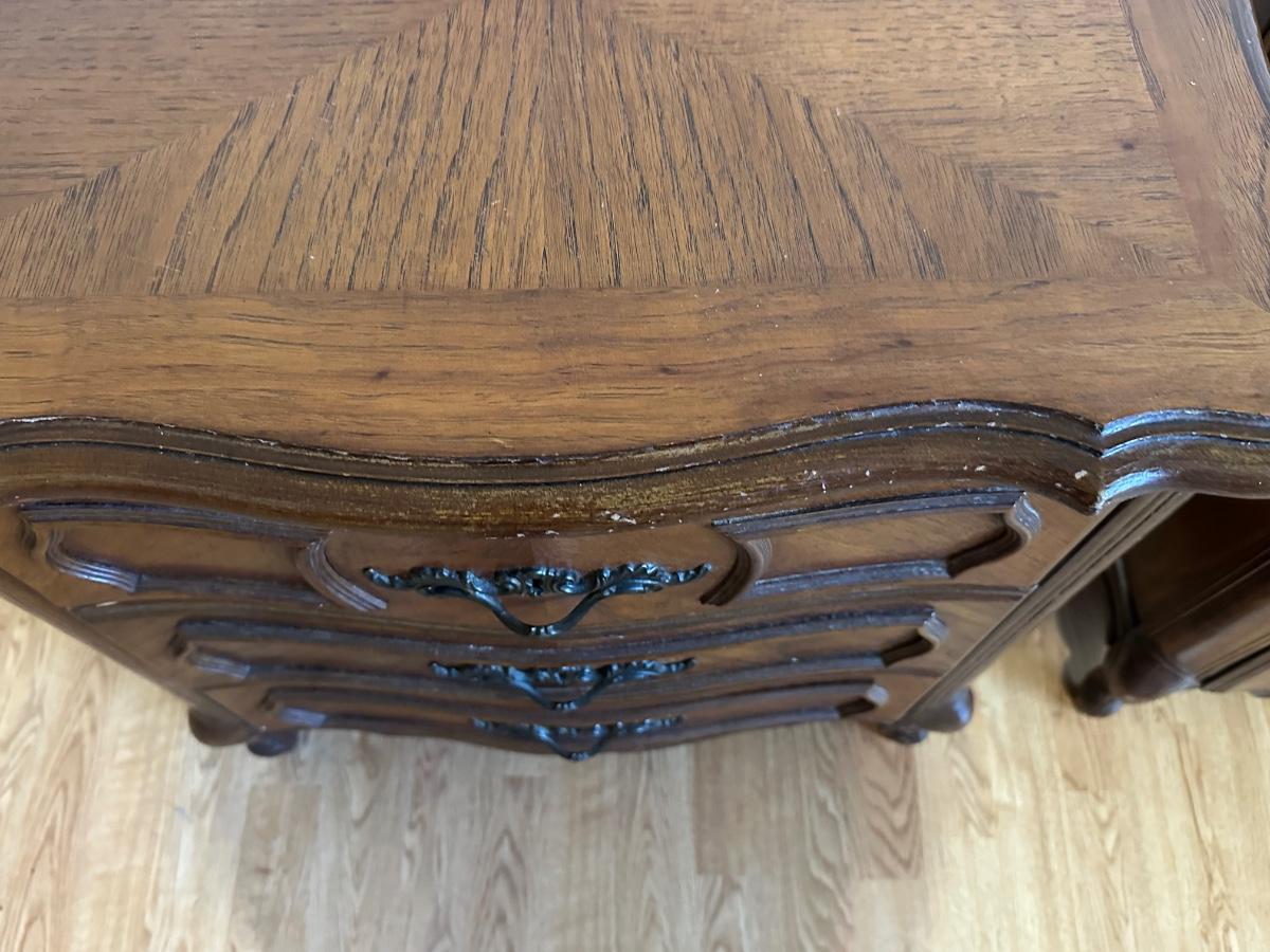 One nightstand has a repair to the top dovetail drawer. The drawer still functions but does not slide in as smoothly as the others.
