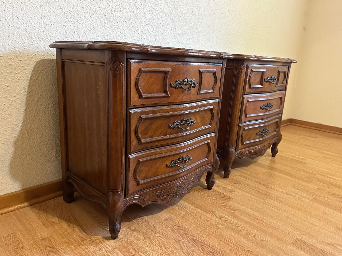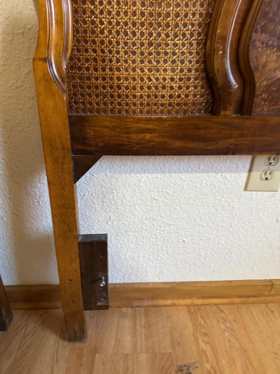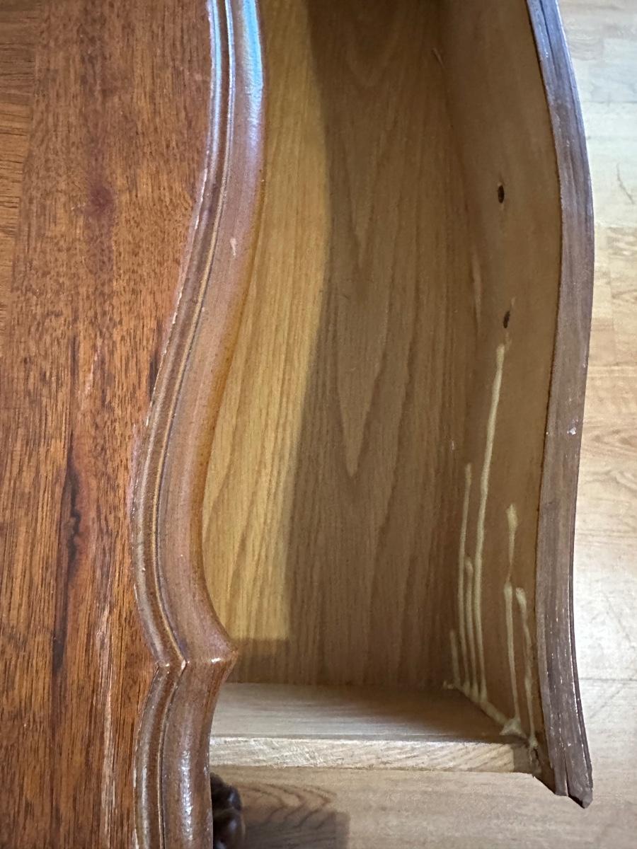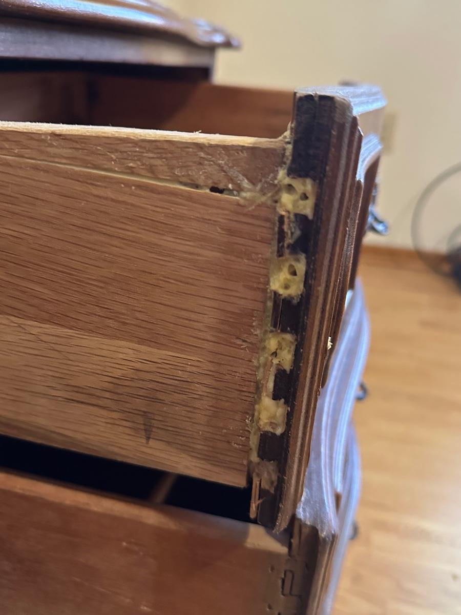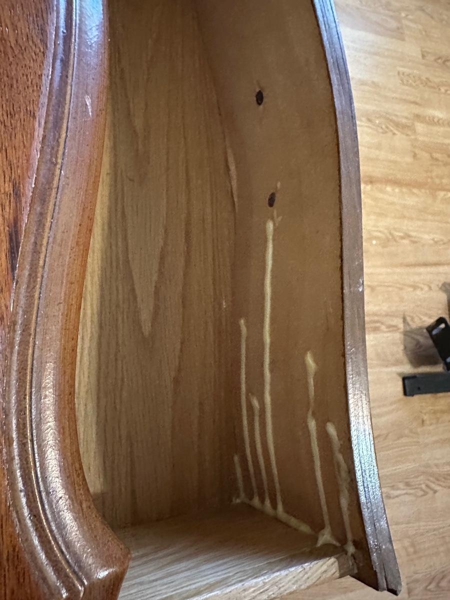 One nightstand has a repair to the top dovetail drawer. The drawer still functions but does not slide in as smoothly as the others.
