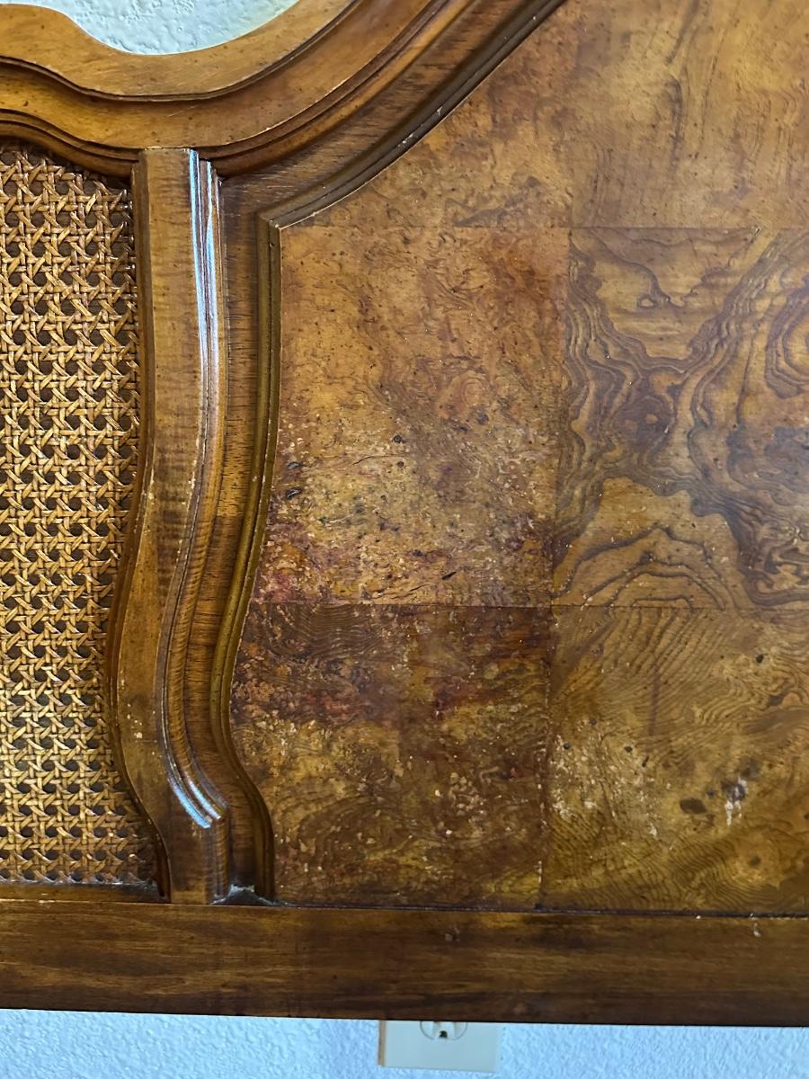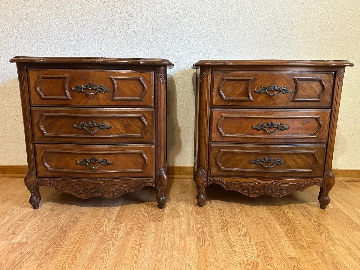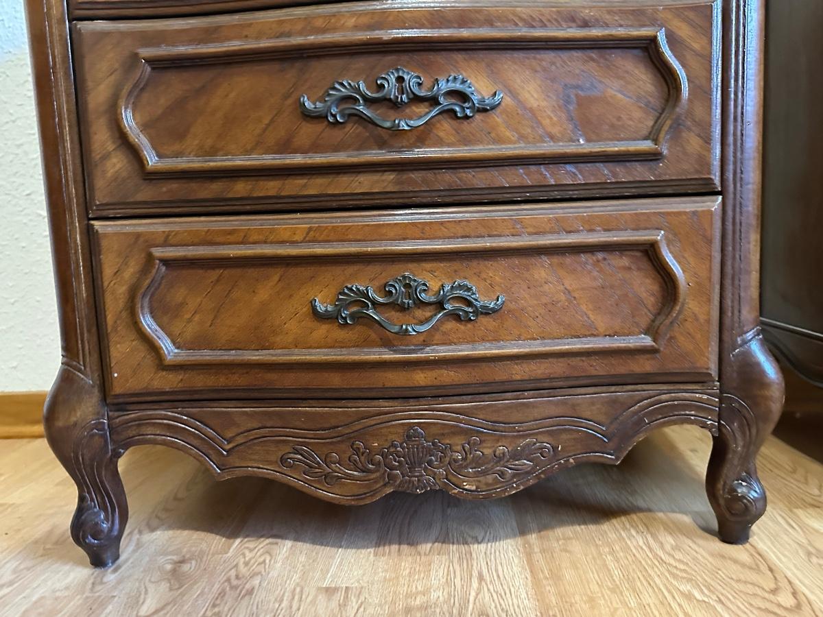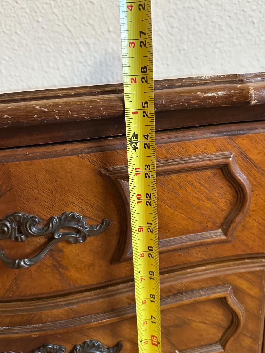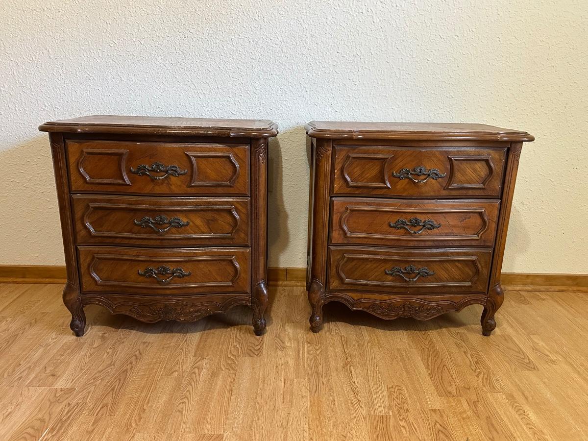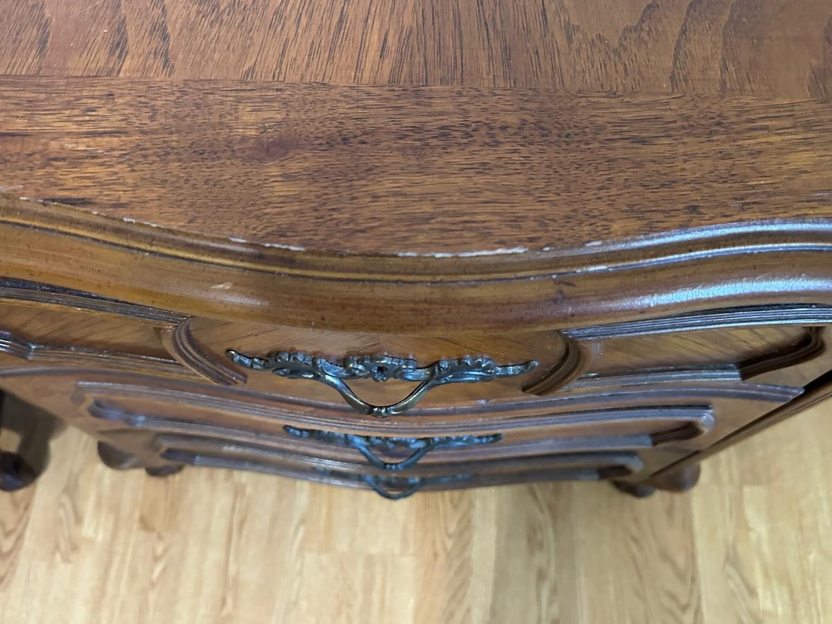 One nightstand has a repair to the top dovetail drawer. The drawer still functions but does not slide in as smoothly as the others.