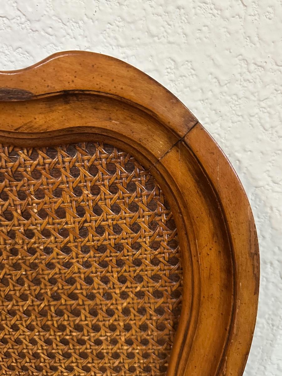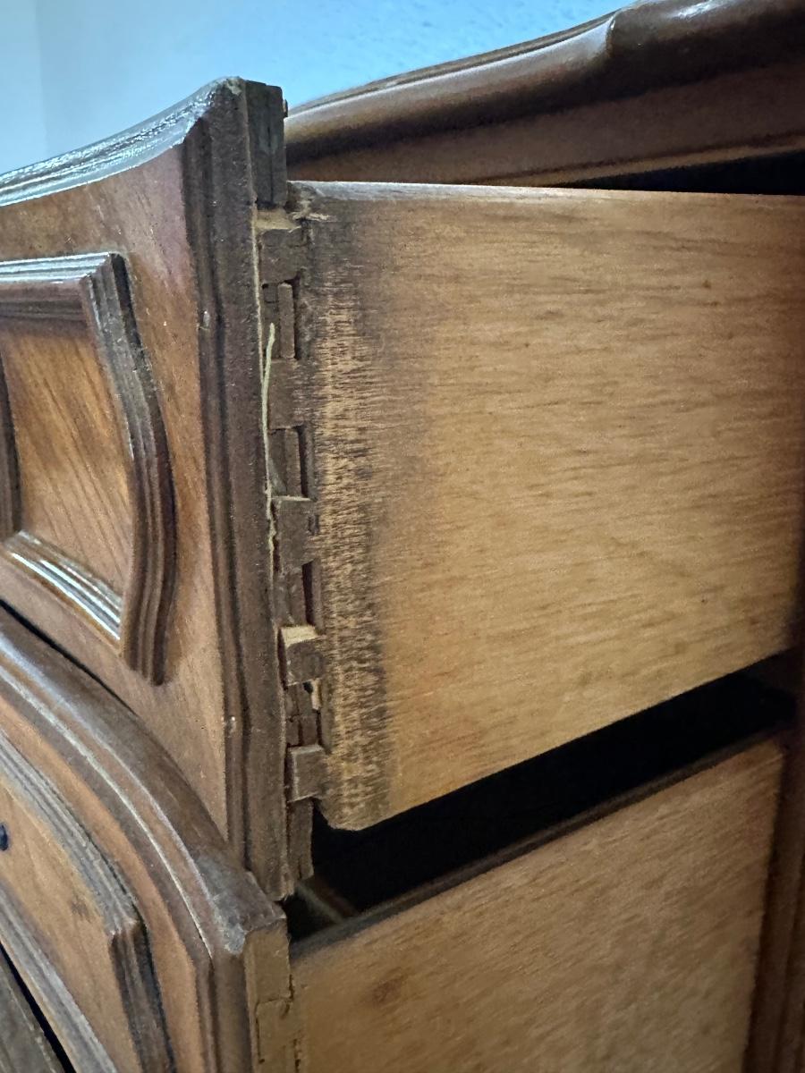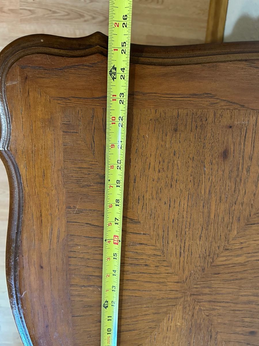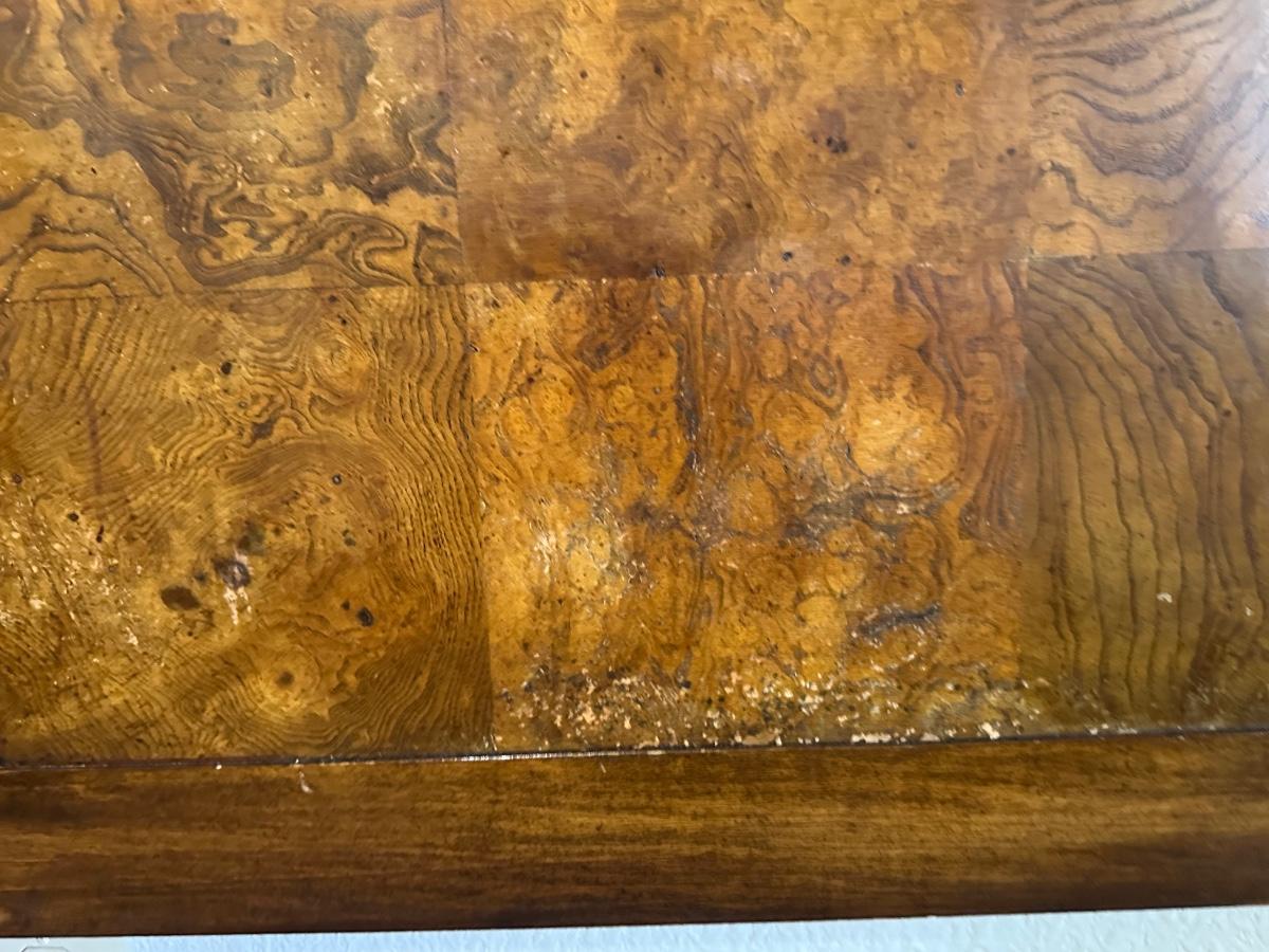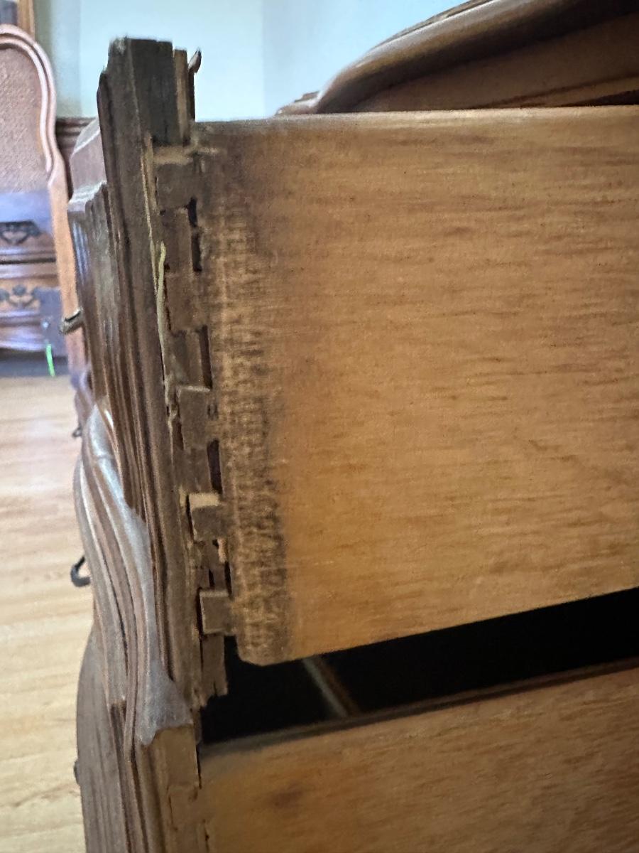 One nightstand has a repair to the top dovetail drawer. The drawer still functions but does not slide in as smoothly as the others.