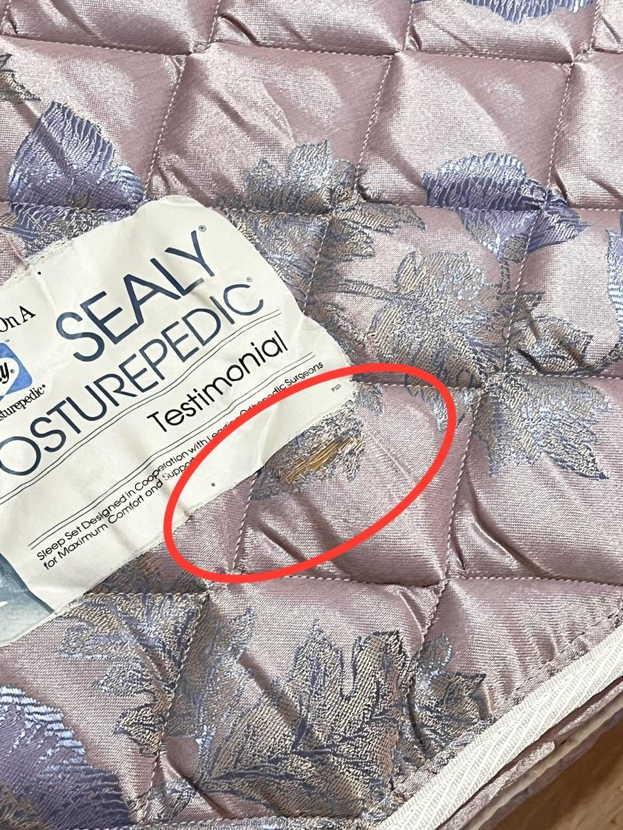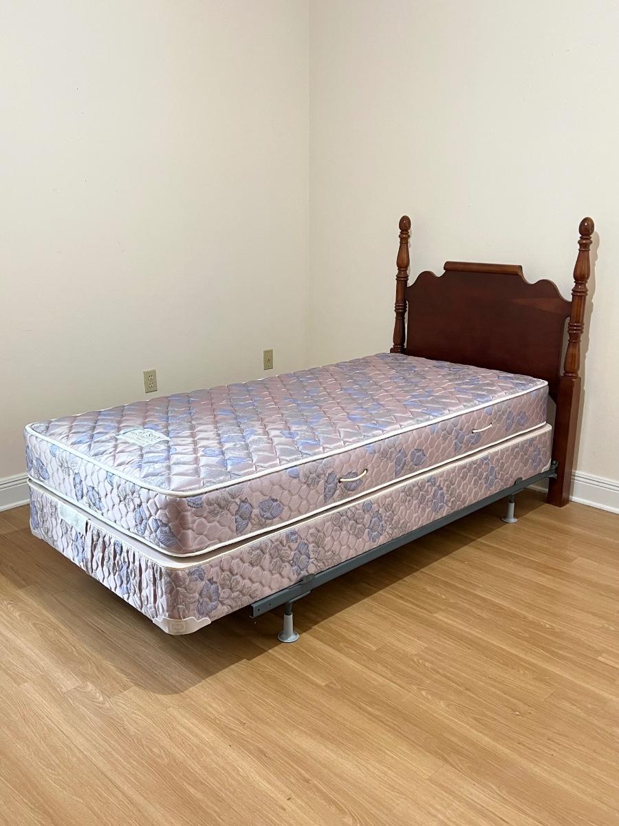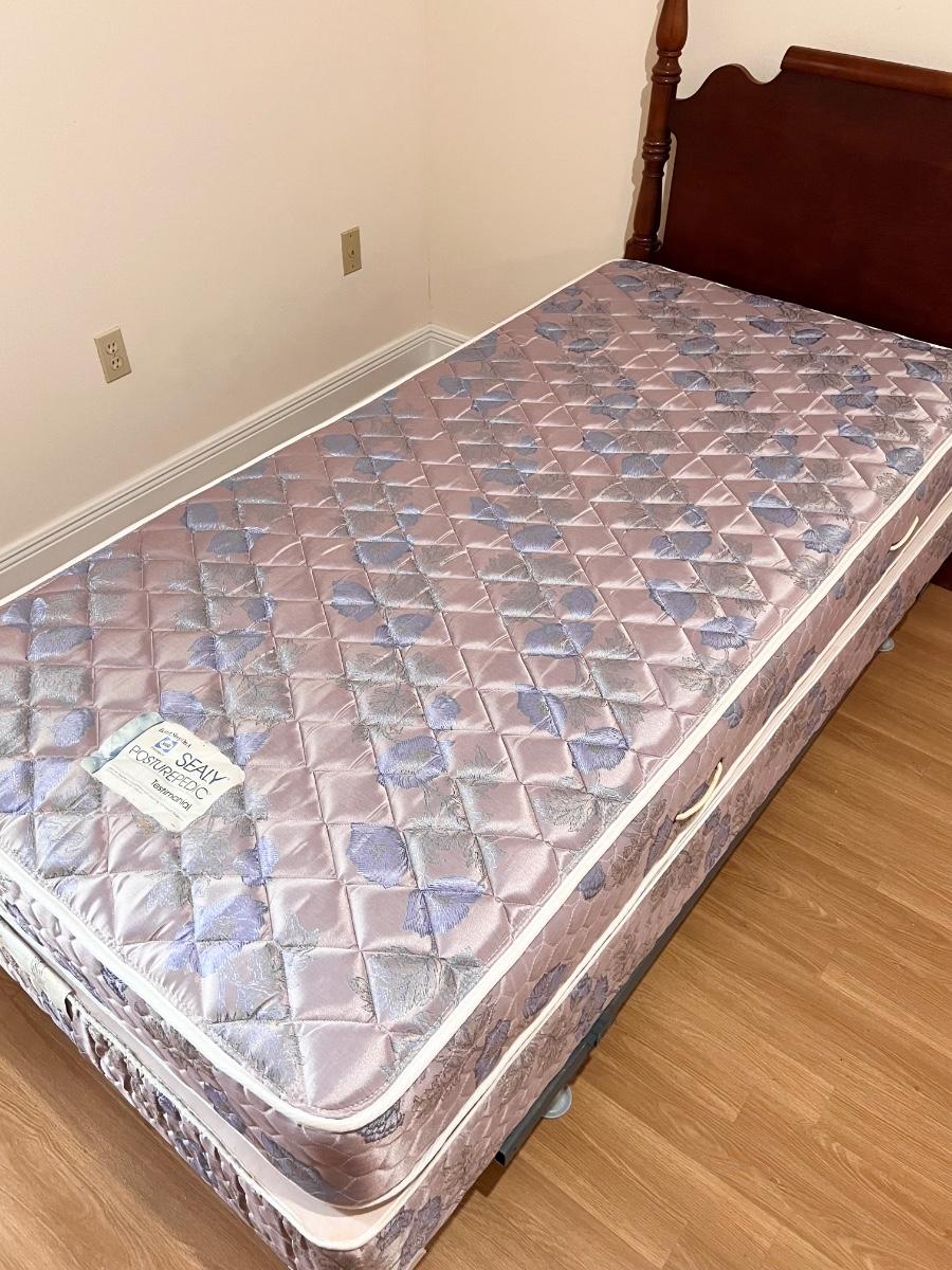 Includes: 2 twin headboards with rails, 1 SEALY mattress & boxspring ~ Mattress has been deodorized, disinfected, & sanitized ~ Mattress has minor rip by tag, see photos ~ Headboards = 51” H