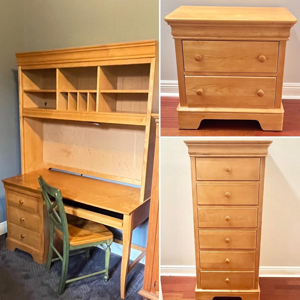 Includes = Hutch 47” H x 54” W x 13” D ~ Desk 29.5” H x 54” W x 24” D ~ Chair 36” H x 17” W x 18” ~ Nightstand 28” H x 28” W x 16” D ~ Tallboy with jewelry box & mirror 55” H x 25” W x 18” D ~ Drawers slide very easily ~ Desk top could use some refinishing as seen in photo