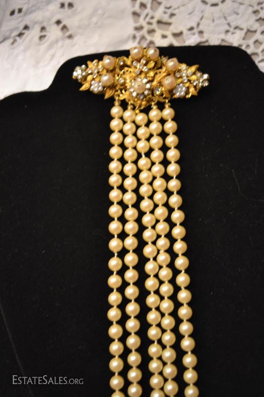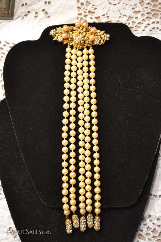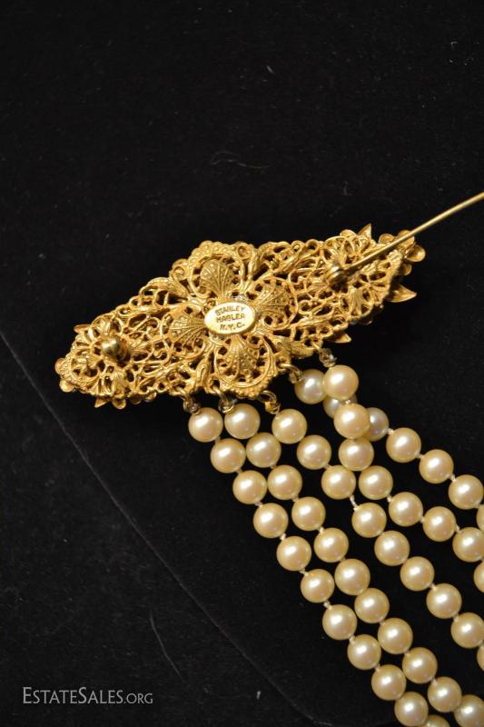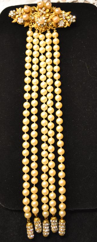 ...ABSOLUTELY STUNNING VINTAGE BROOCH BY STANLEY MAGLER. IN EXCELLENT CONDITION! VERY LONG TRAIL OF HAND KNOTTED PEARLS WITH RHINESTONE CAPPED ENDS. GREAT FIND FOR THE COLLECTOR OR A BEAUTIFUL GIFT FOR THE GAL WHO LOVES UNIQUE FINDS....