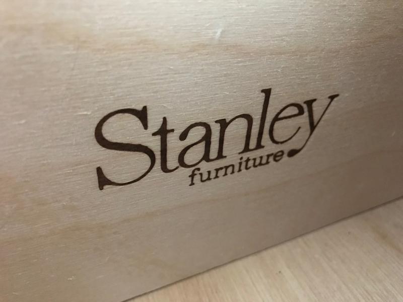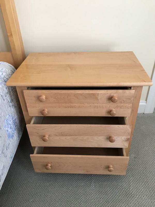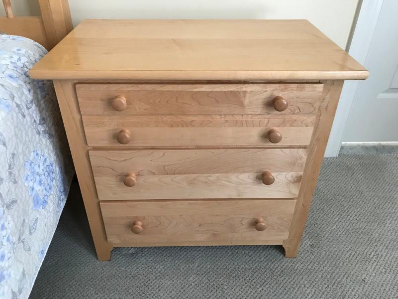 Very nice three drawer nightstand by Stanley Furniture. Features tapered legs, turned, turned knobs. and a light natural maple finish. Three deep drawers with top drawer having double false drawer fronts. 16" x 26" x 24" H Excellent condition.