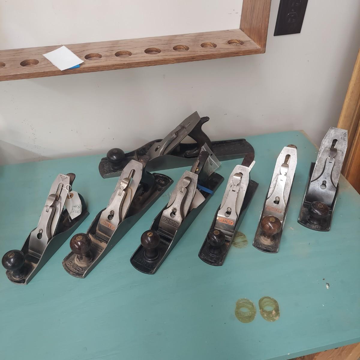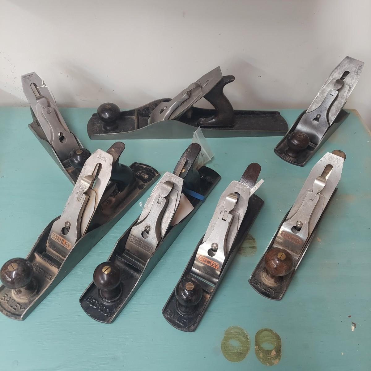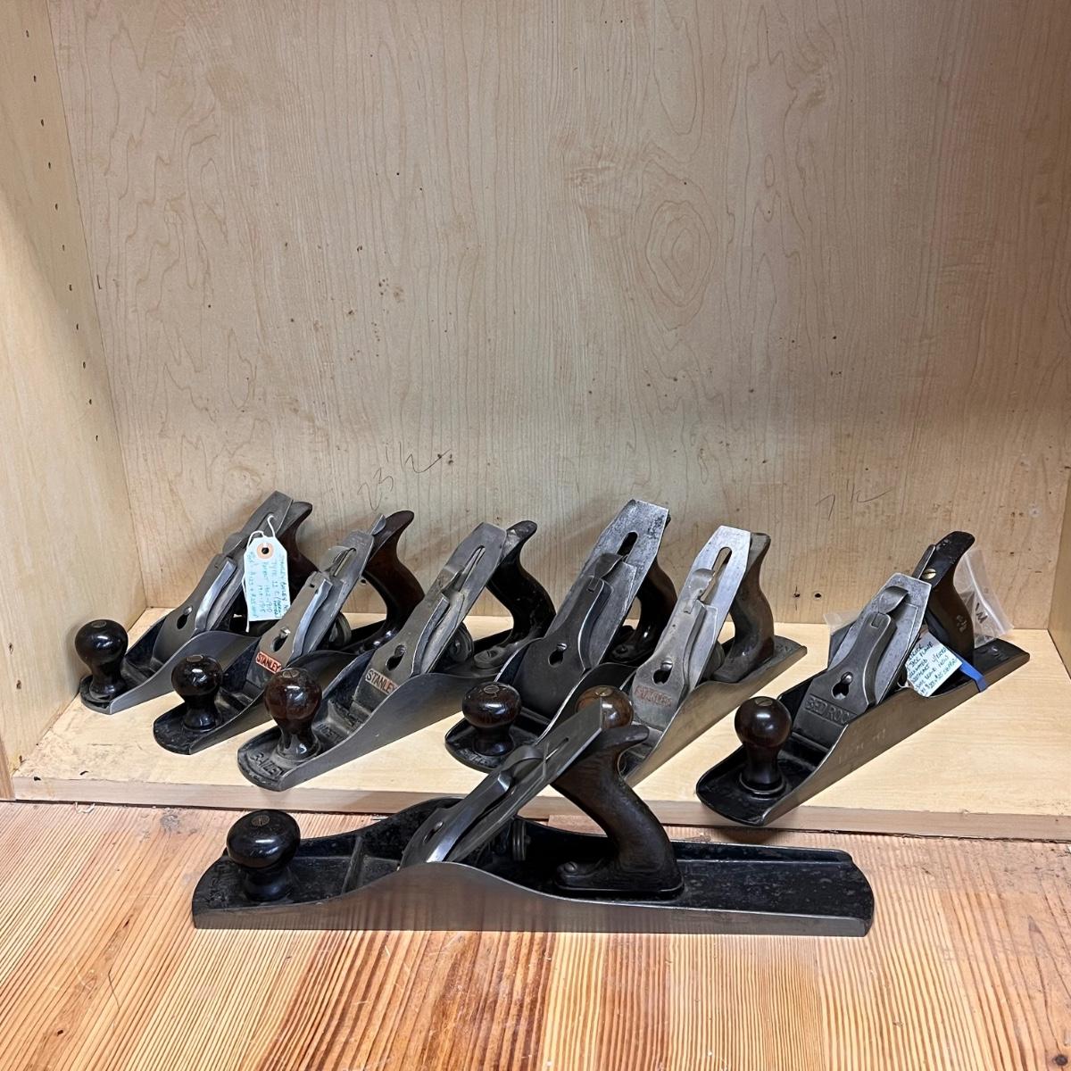 This lot includes seven Stanley planes that appear to be in excellent condition, if not brand new. The largest plane pictured measures 17” x 3” x 5”H. Shipping available.