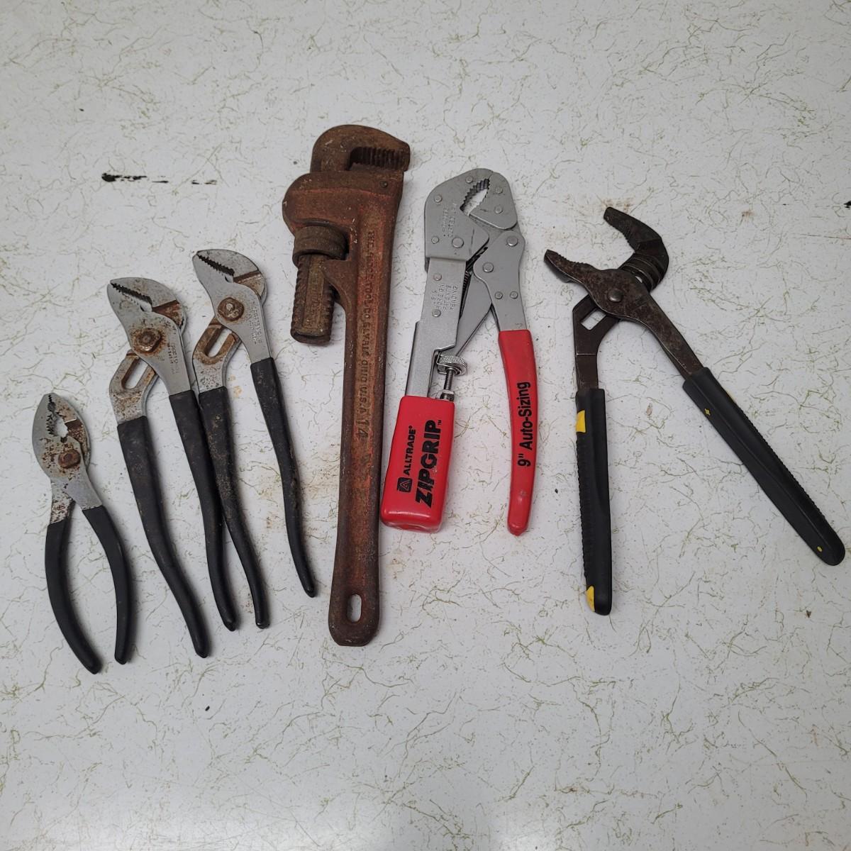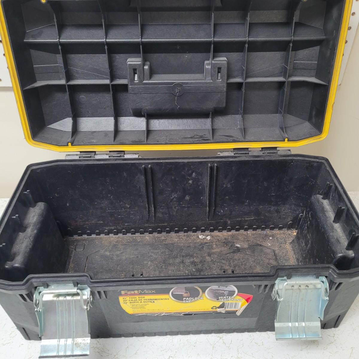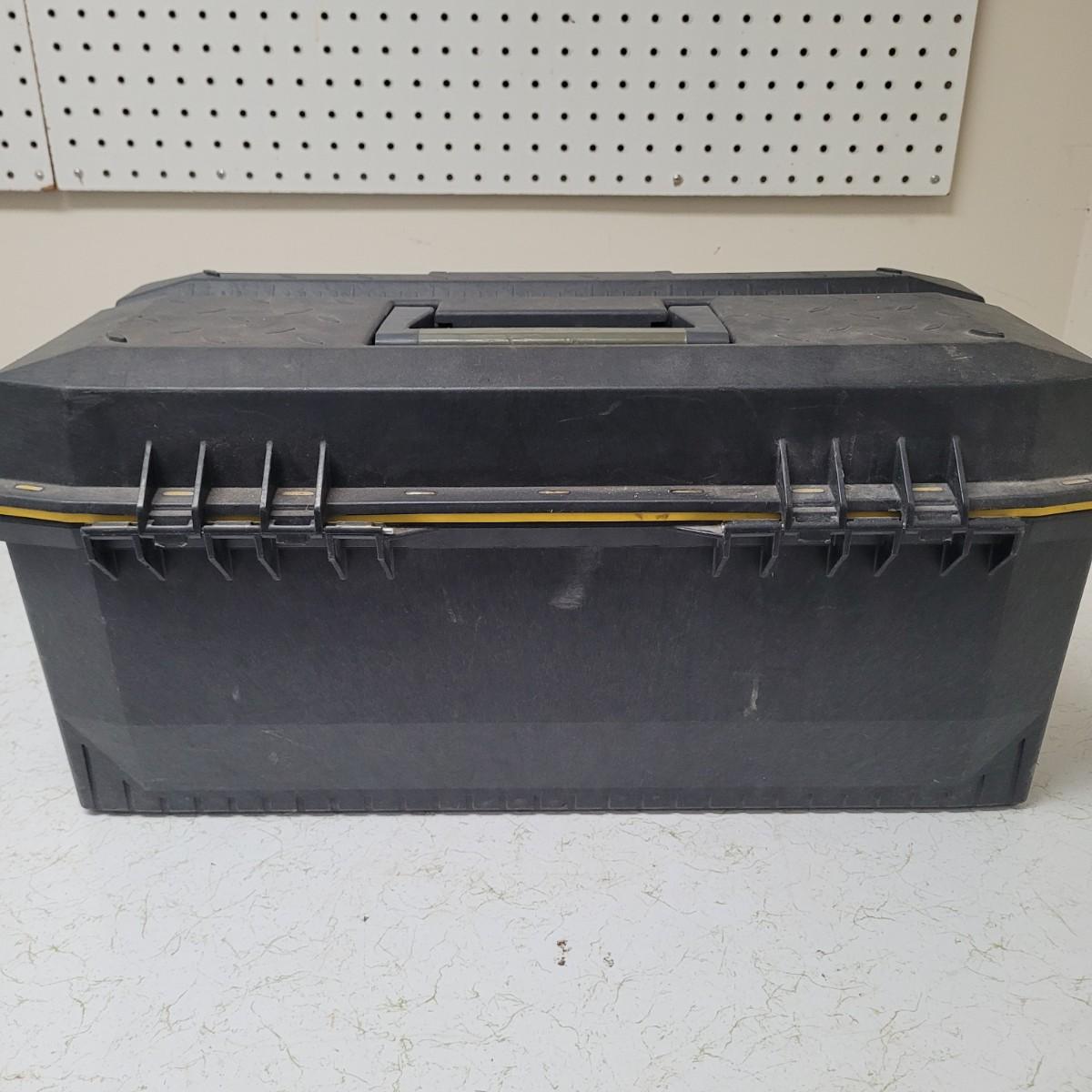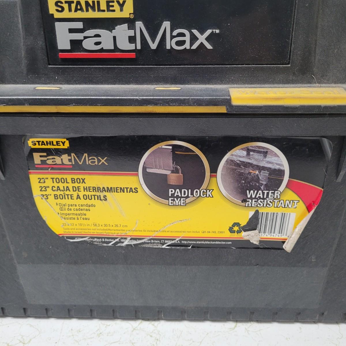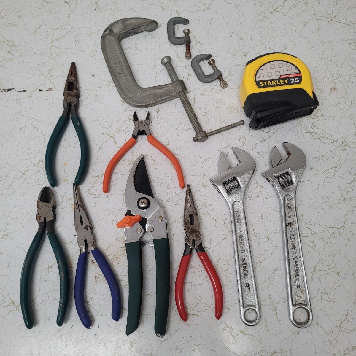 This lot includes a Stanley brand Fat Max toolbox and miscellaneous tools. The toolbox is made from heavy duty plastic and features two large metal clasps, sturdy handle, and water resistant barrier for keeping contents dry. Toolbox measures 24" x 12" 12"H. Tools include hammers, wrenches, c-clamps, pliers, tape measure, wire cutters, and snips. Top brands include Stanley, Craftsman, and Mint Craft Pro.