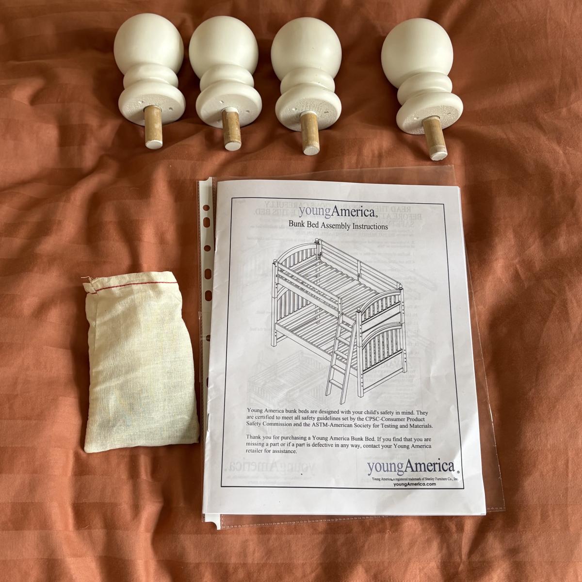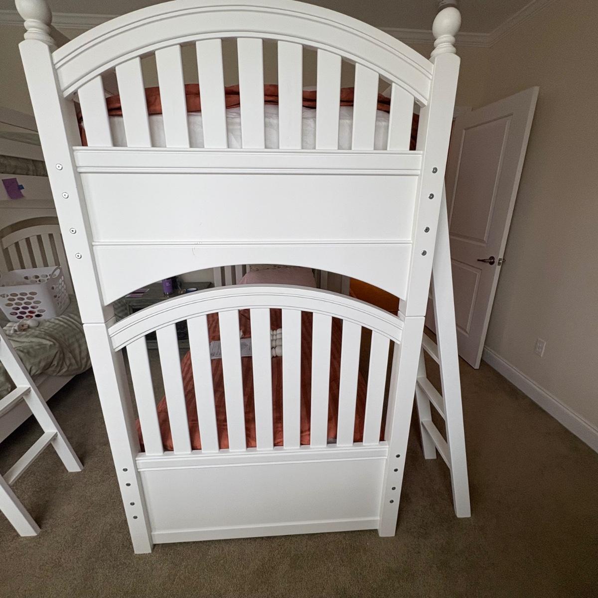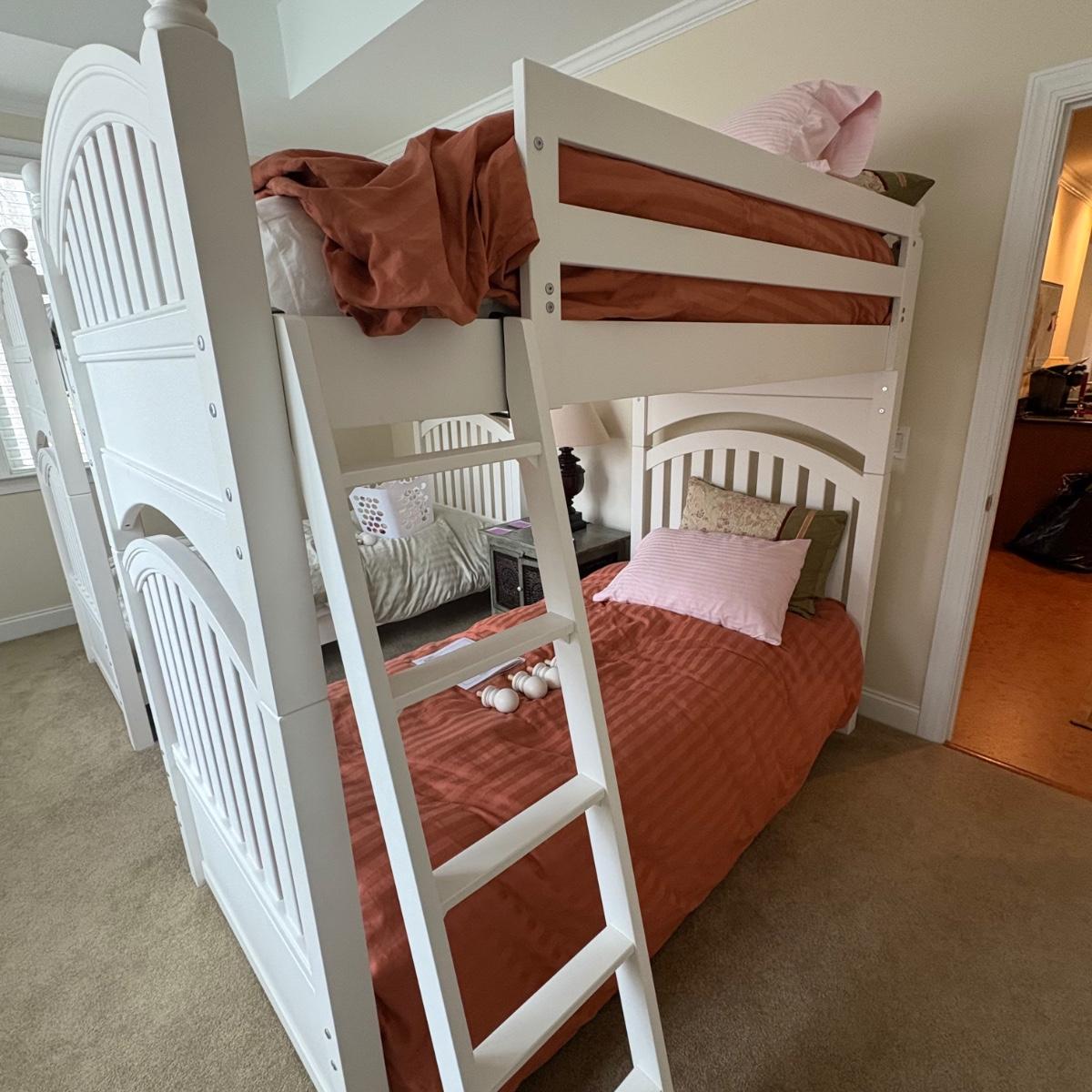 White painted wood bunk bed set can stack or be separated. Ladder and bed knobs for second bed (for when unstacked) are included. 42.5” x 6’8” x 6’H. Minor scuffs/wear. Winning bidder must bring own tools to disassemble and help for loading. The mattresses are available to the winning bidder, but the winning bidder is not required to take them. Does not include bedding. This is for ONE set of the bunk beds, the 2nd set in photos has been sold. Per the homeowner, bed was purchased from Tyson Furniture in 2007. Local pickup only.