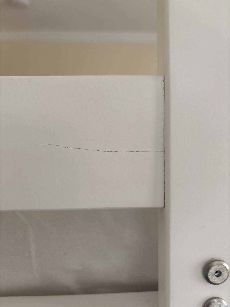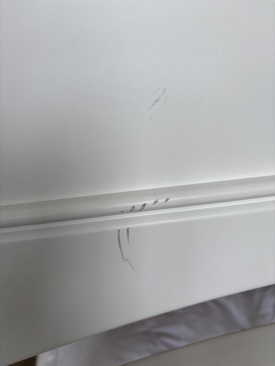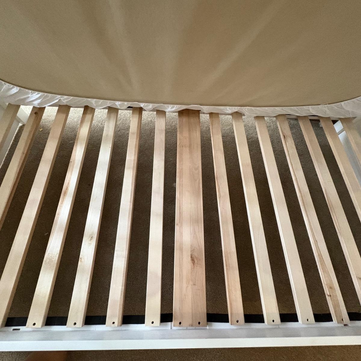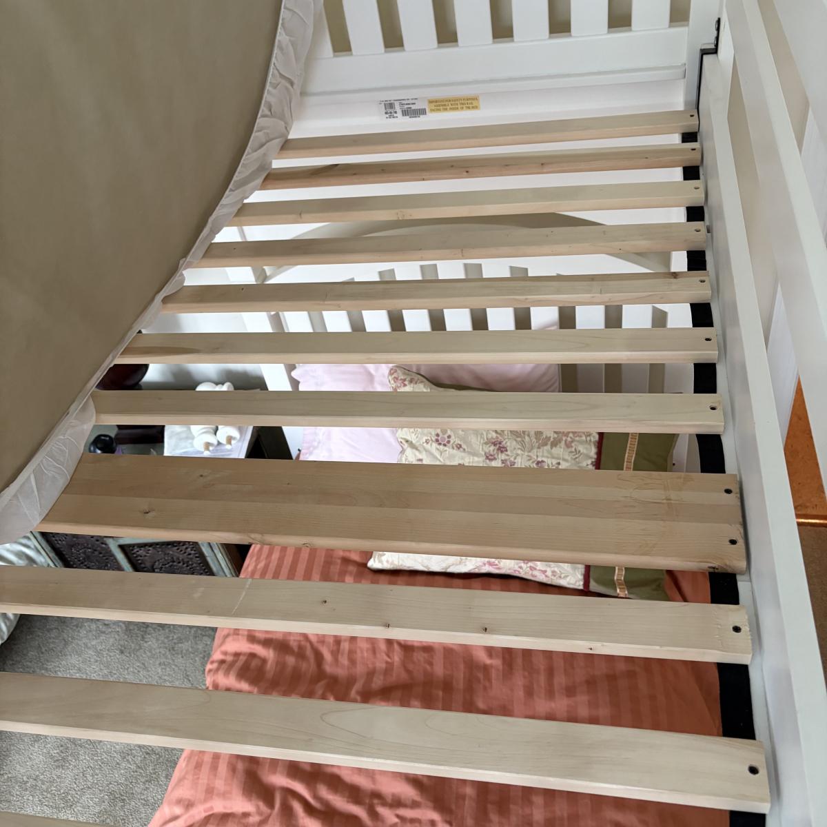 White painted wood bunk bed set can stack or be separated. Ladder and bed knobs for second bed (for when unstacked) are included. 42.5” x 6’8” x 6’H. Minor scuffs/wear. Winning bidder must bring own tools to disassemble and help for loading. The mattresses are available to the winning bidder, but the winning bidder is not required to take them. Does not include bedding. This is for ONE set of the bunk beds, the 2nd set in photos has been sold. Per the homeowner, bed was purchased from Tyson Furniture in 2007. Local pickup only.