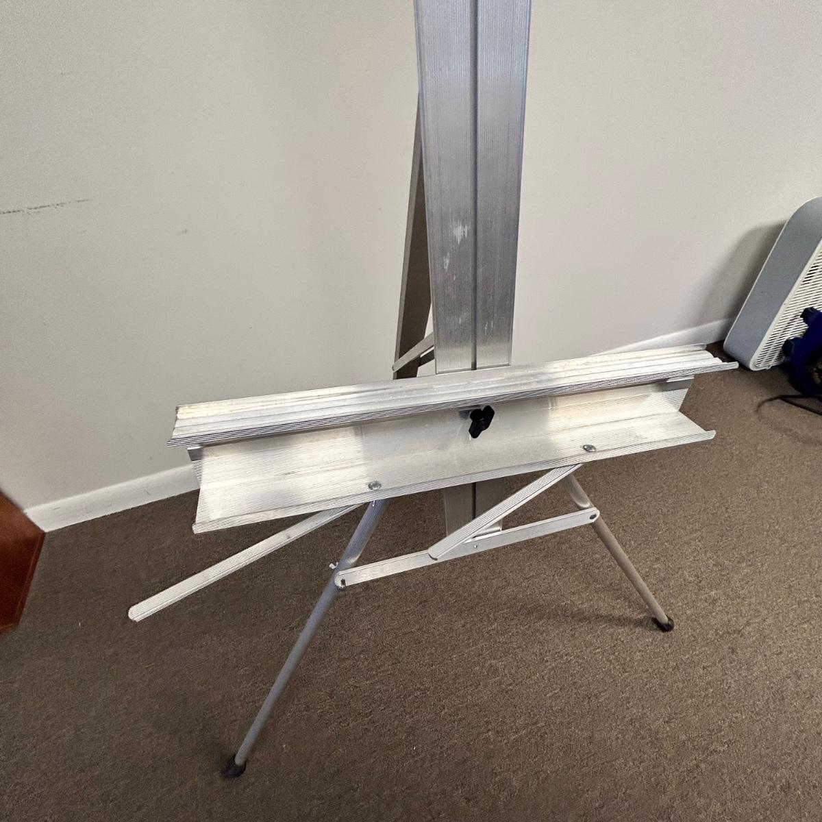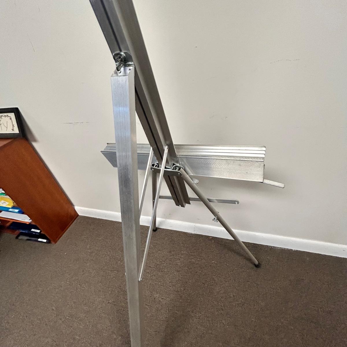 Adjustable aluminum Stanrite easel, model number 500 is in good condition with all moving and locking pieces. Item when completely compact measures 52” x 5” x 4.5”. Light weight and appears to be good to hold all sizes of artwork. Shipping available