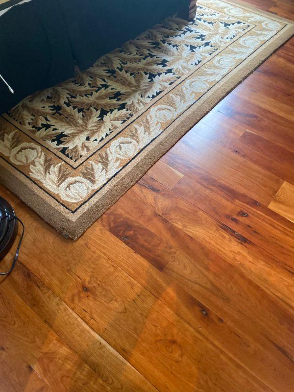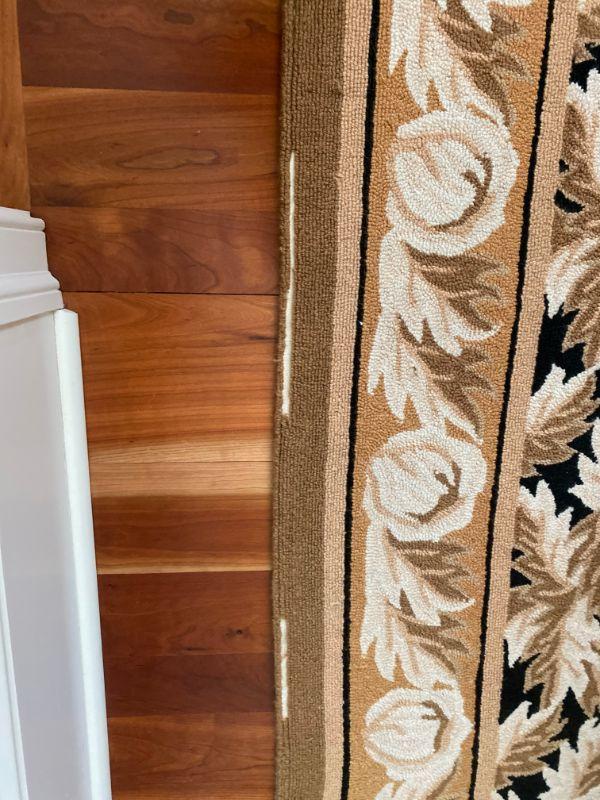 Stanton Handcrafted 100% wool carpet in Autumn leaves pattern from Natchez Collection, depicting tan, taupe, ivory, gold leaves on a black field surrounded by a major border in joined leaf pattern and flanked by minor borders . measuring 7'9" x 9'6" signs of wear on edges (see Pics)