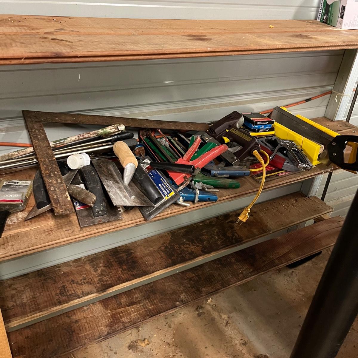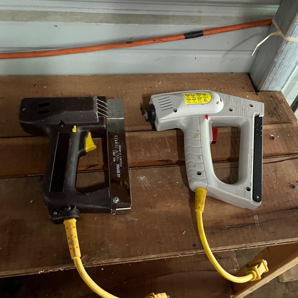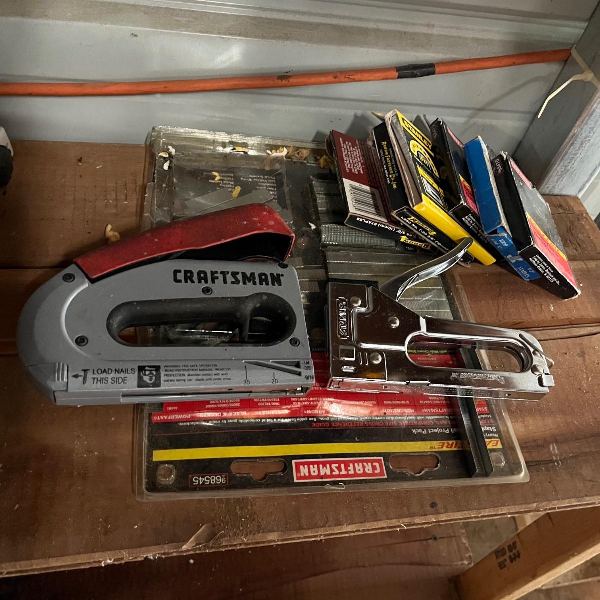 Lot includes Arrow and Stanley electric staplers that both worked when tested, five caulking guns, mitre box, staples and staplers, metal squares and more.