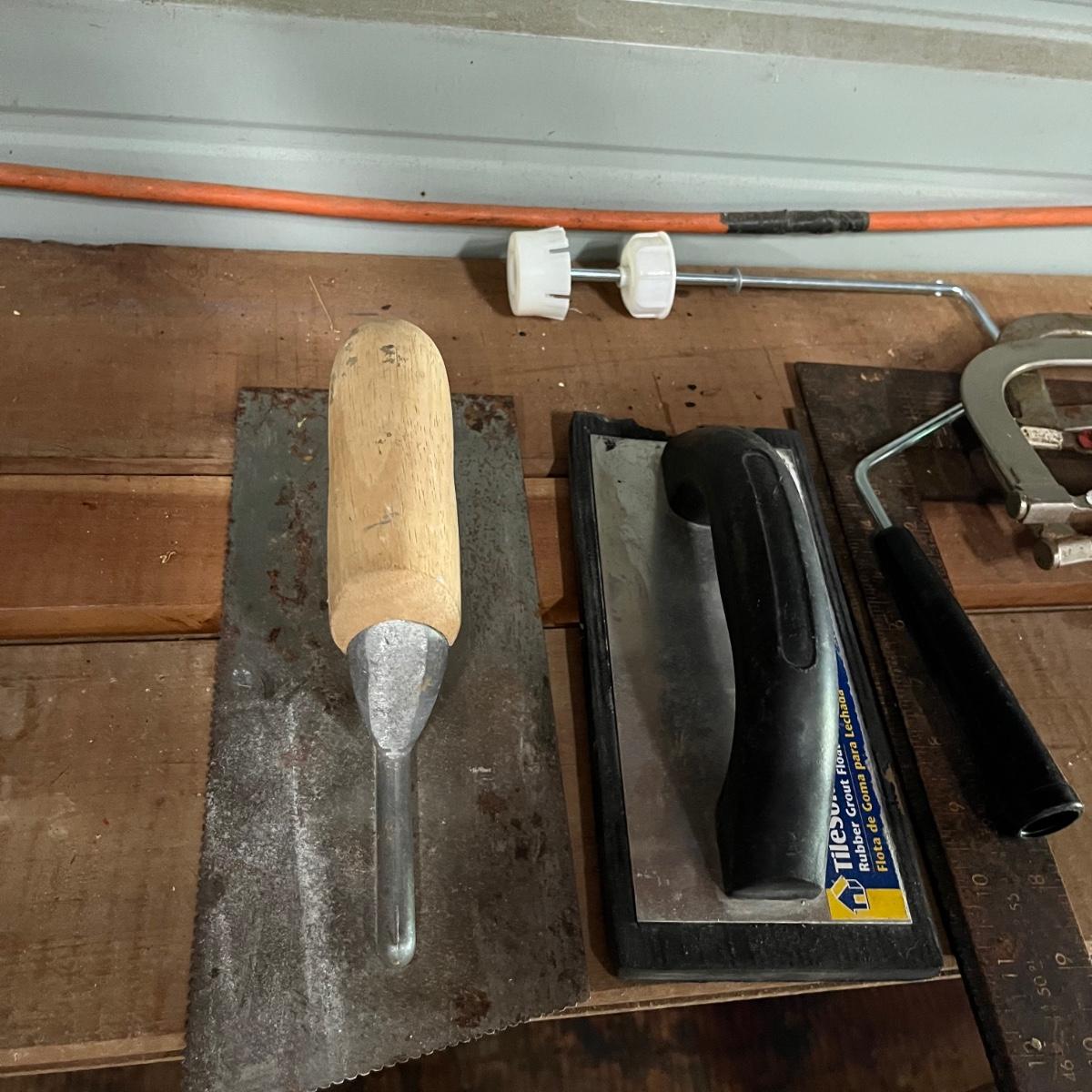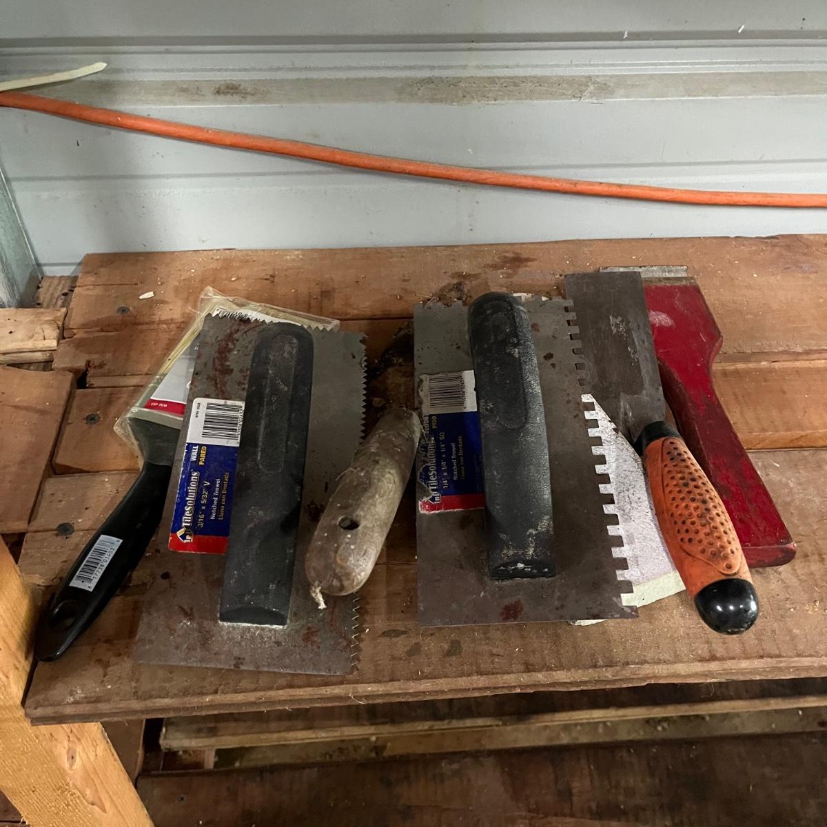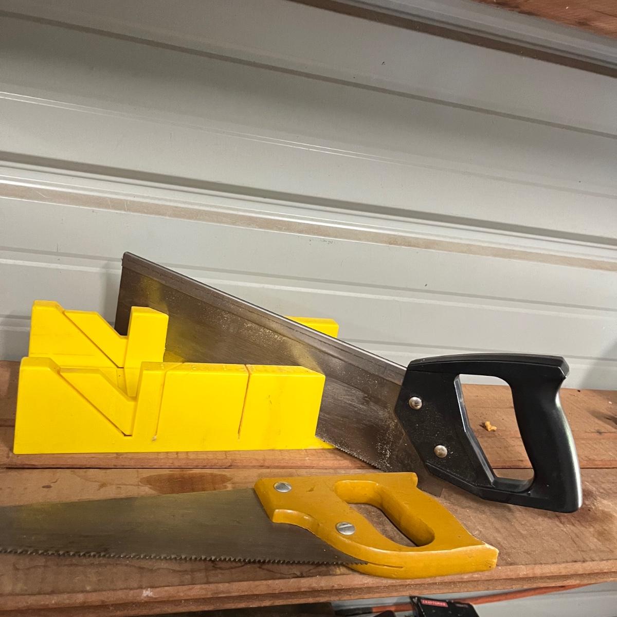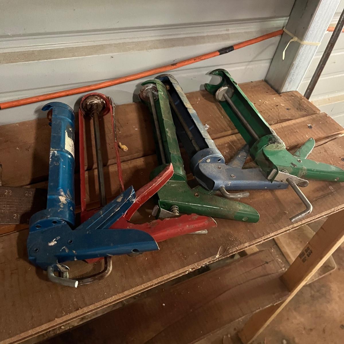 Lot includes Arrow and Stanley electric staplers that both worked when tested, five caulking guns, mitre box, staples and staplers, metal squares and more.