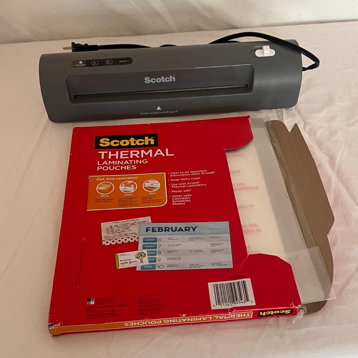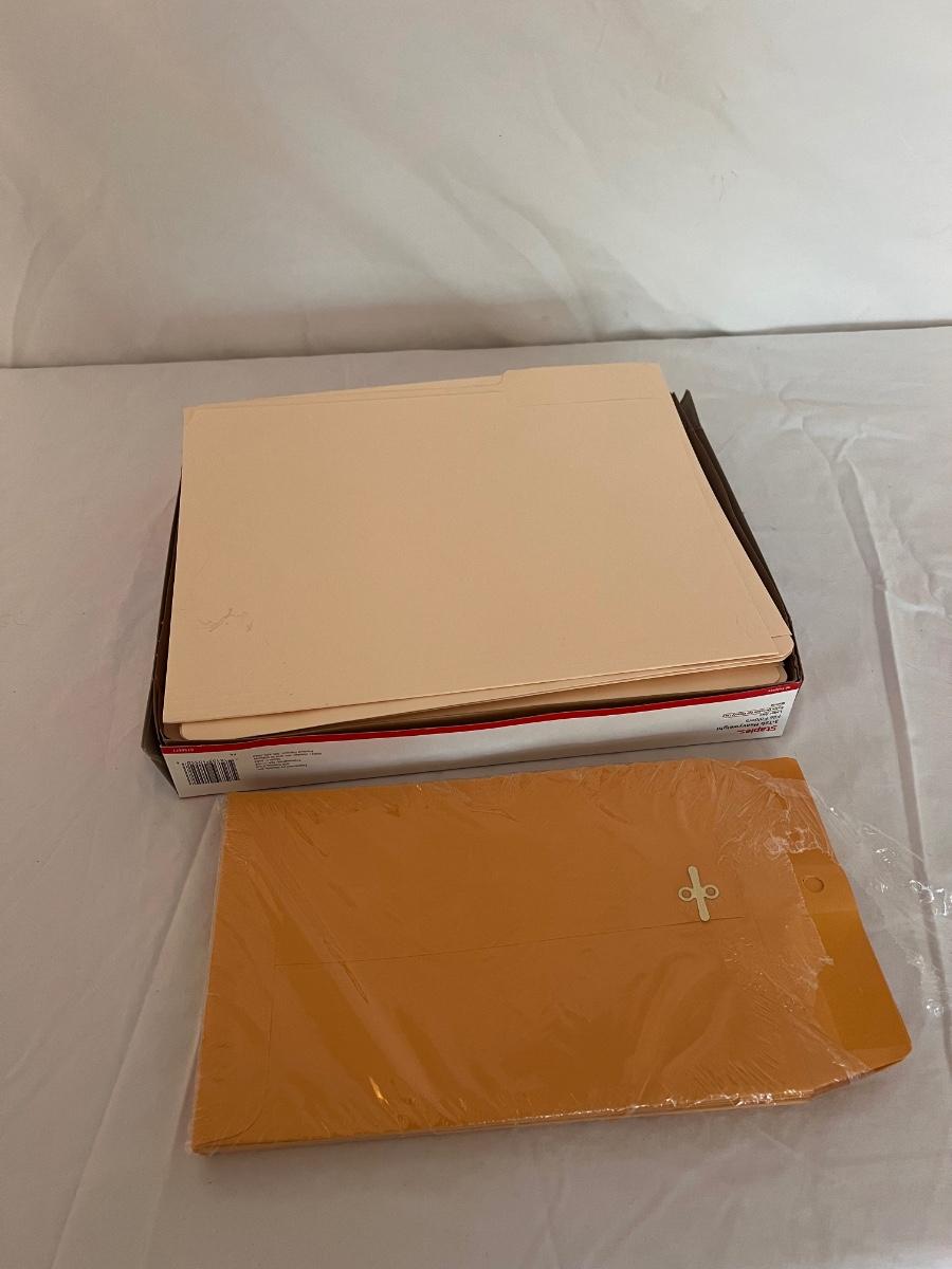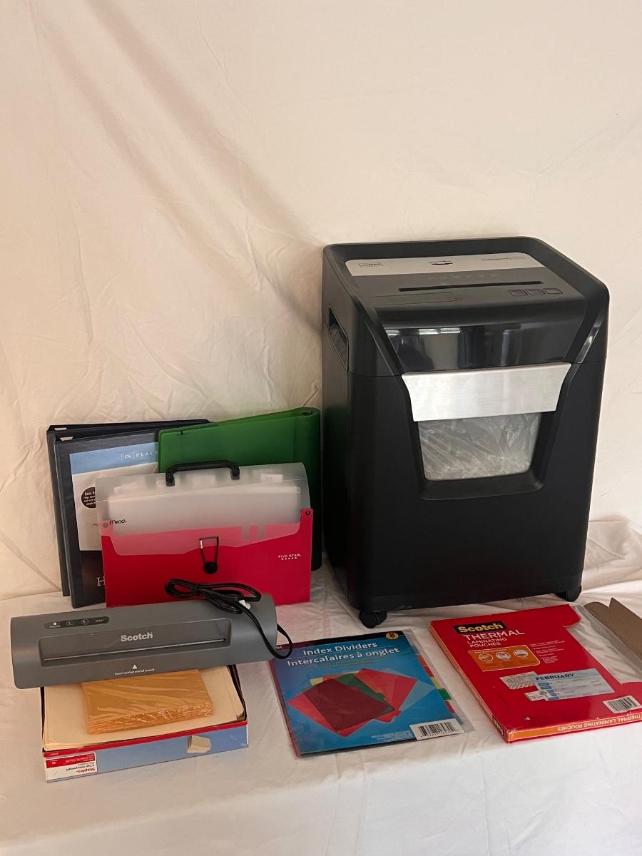 This office lot includes one Staples Electric Paper Shredder, three binders with dividers, one file folder, one Scotch Lamination Sealer, and various sized folders, envelopes, and laminate pouches. The largest item is the paper shredded that measures 15" x 11" x 22.5"H. Local pick up only.