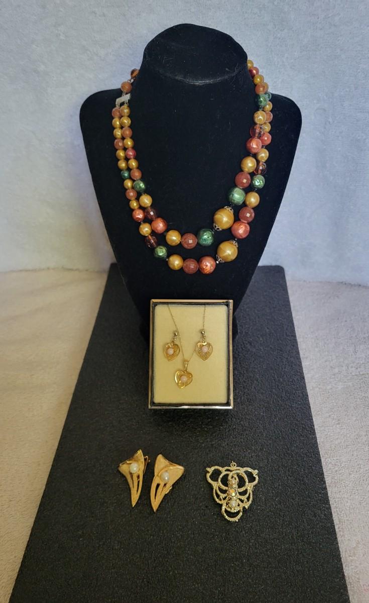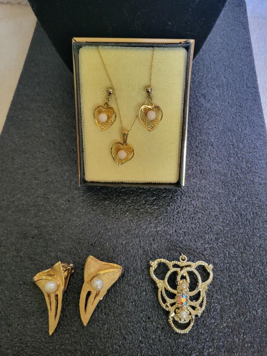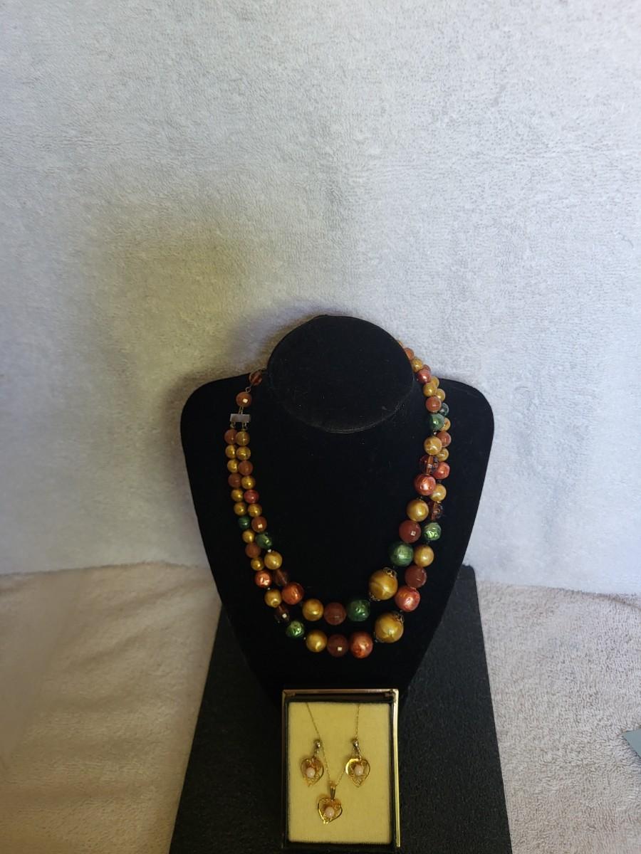 STAR BEAD NECKLACE, 12K GOLD FILLED HEART SET, 1 PENDANT AND PAIR OF EARRINGS