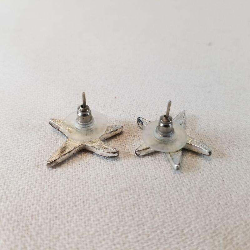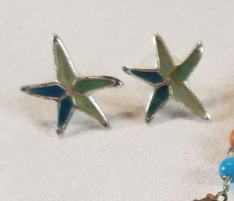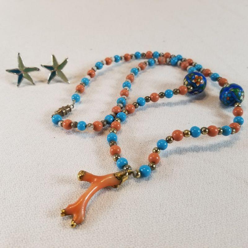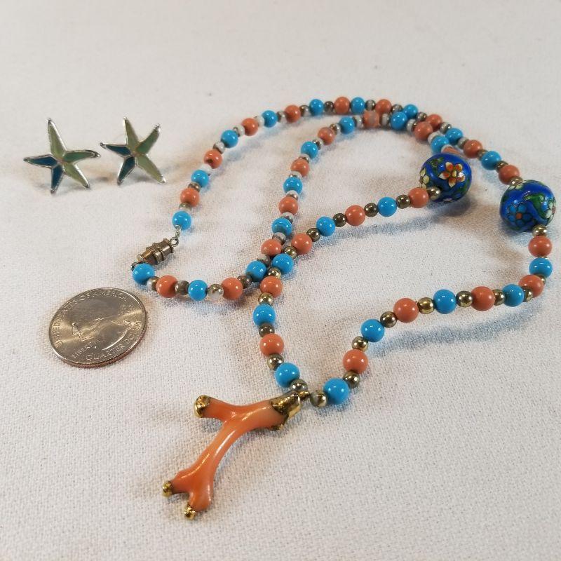 This lot features a pair of silver-plated, star fish-shaped, pierced earrings in blues and aquas and a nice hand-made necklace constructed with cloisonne" beads, brass, stone and coral. The necklace is 22-inches total length. Both pieces are in very good condition.