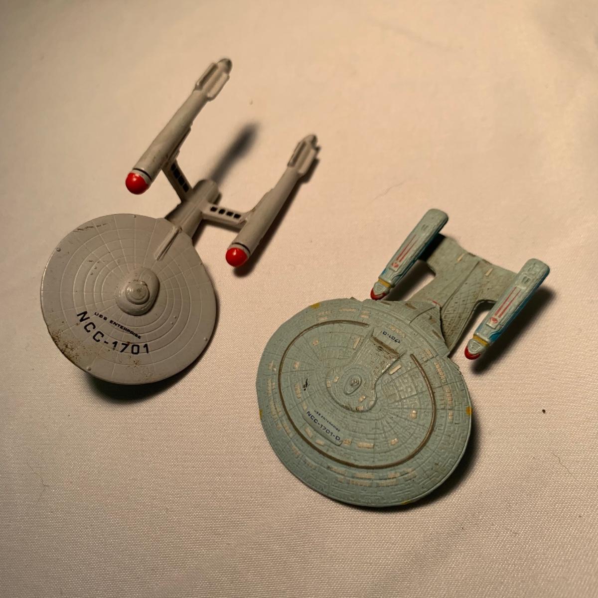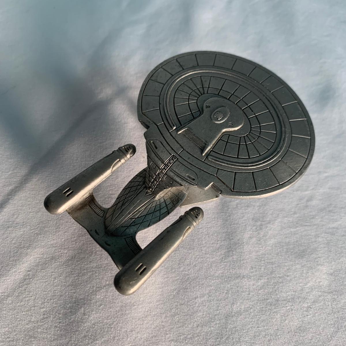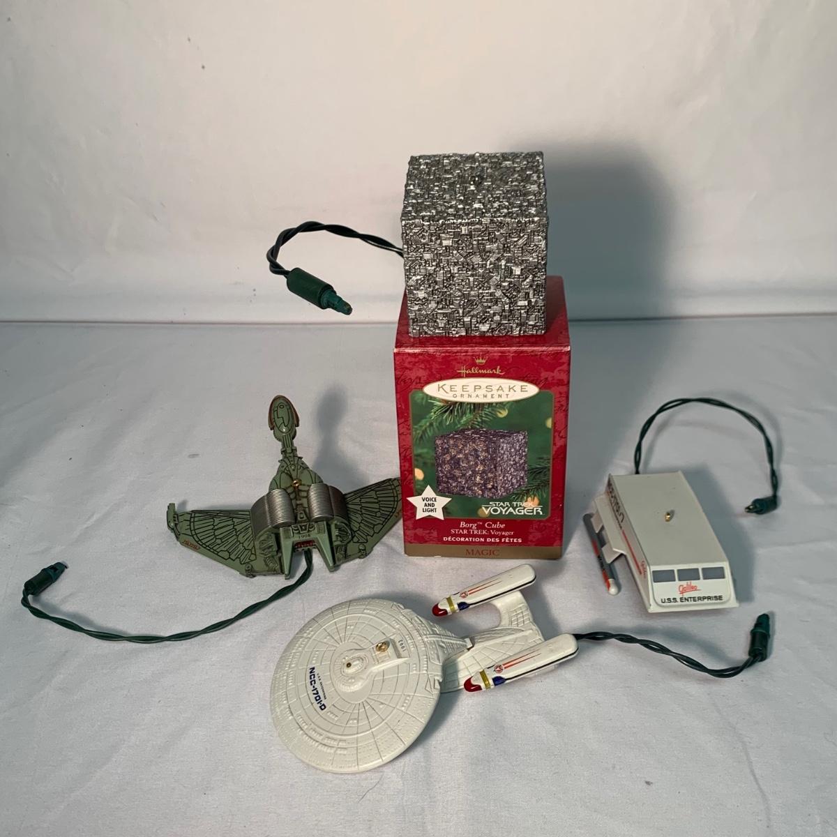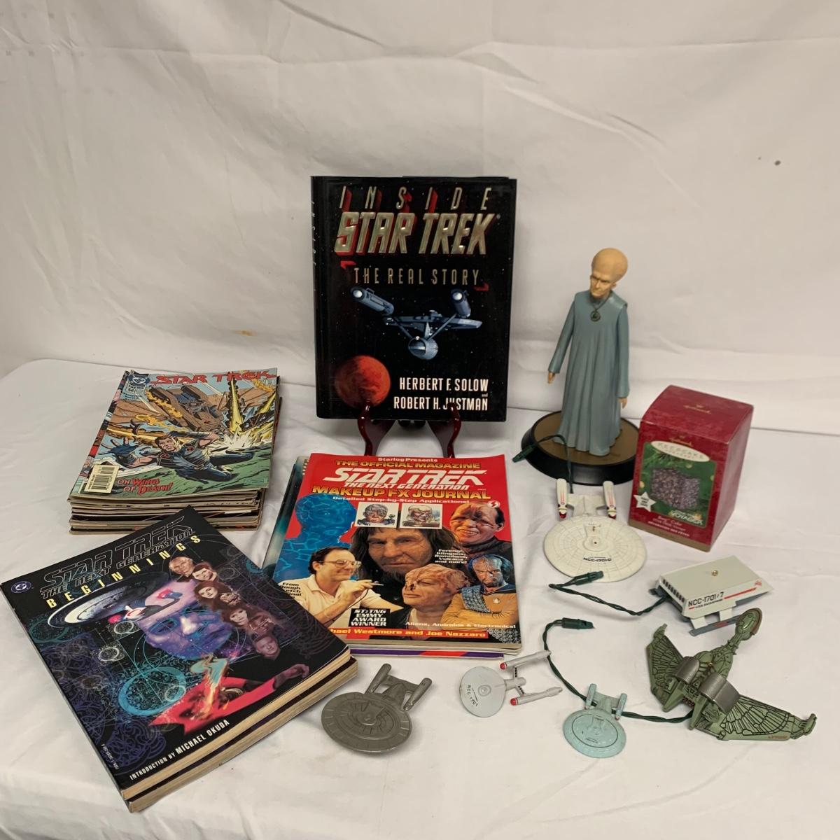 A collection of Star Trek items! Collection includes 23 books and comics, a 9.25”H Talosian figurine, four electronic Hallmark Keepsake ornaments, a Radcliffe pewter U.S.S. Enterprise, and two small plastic U.S.S. Enterprise figurines. We are unable to test ornament function.