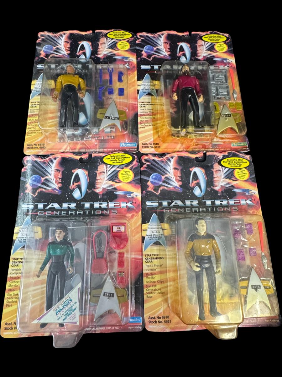 NOS. Includes William Riker, Geordi La Forge, Deanna Troi, and Data. Total of four pieces. In the original unopened packaging.